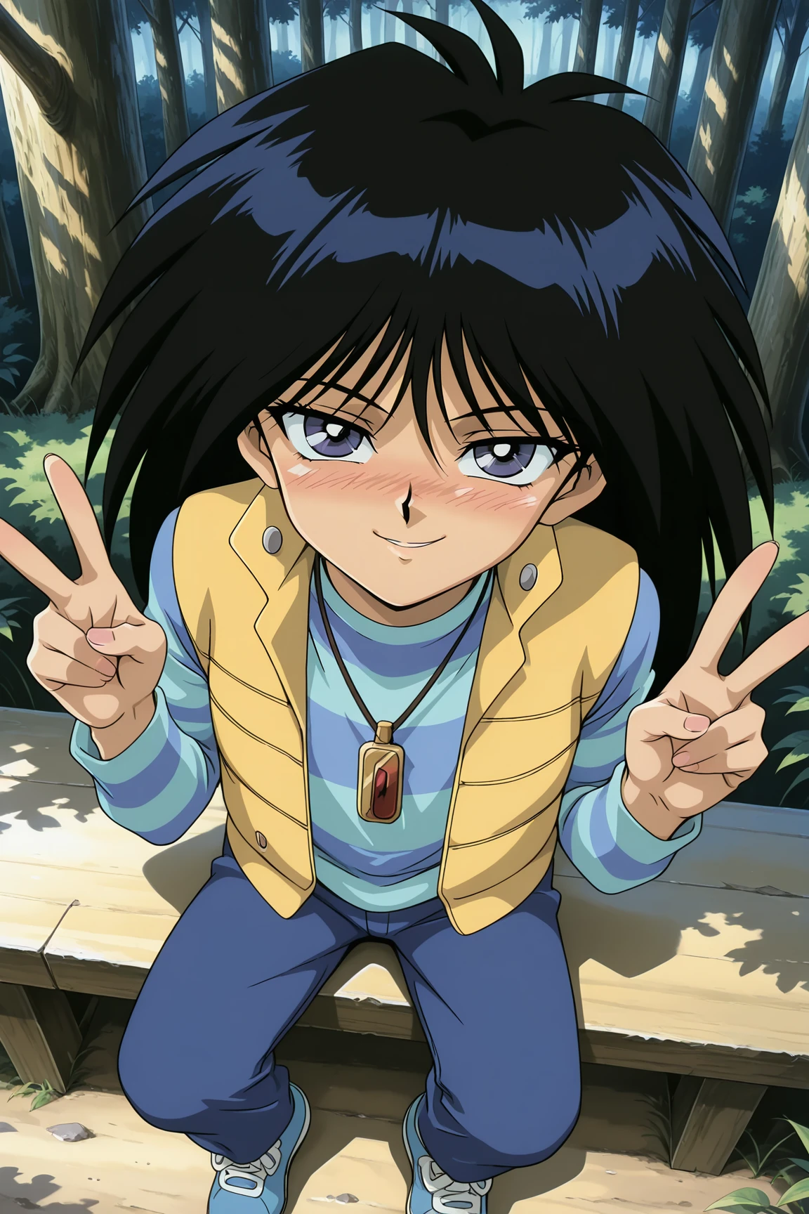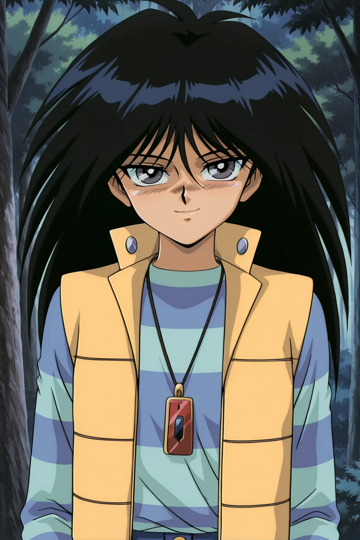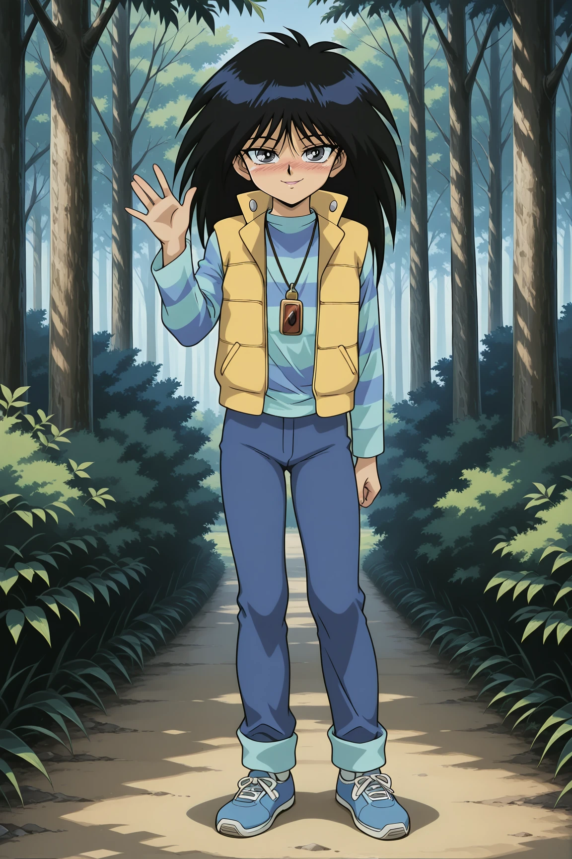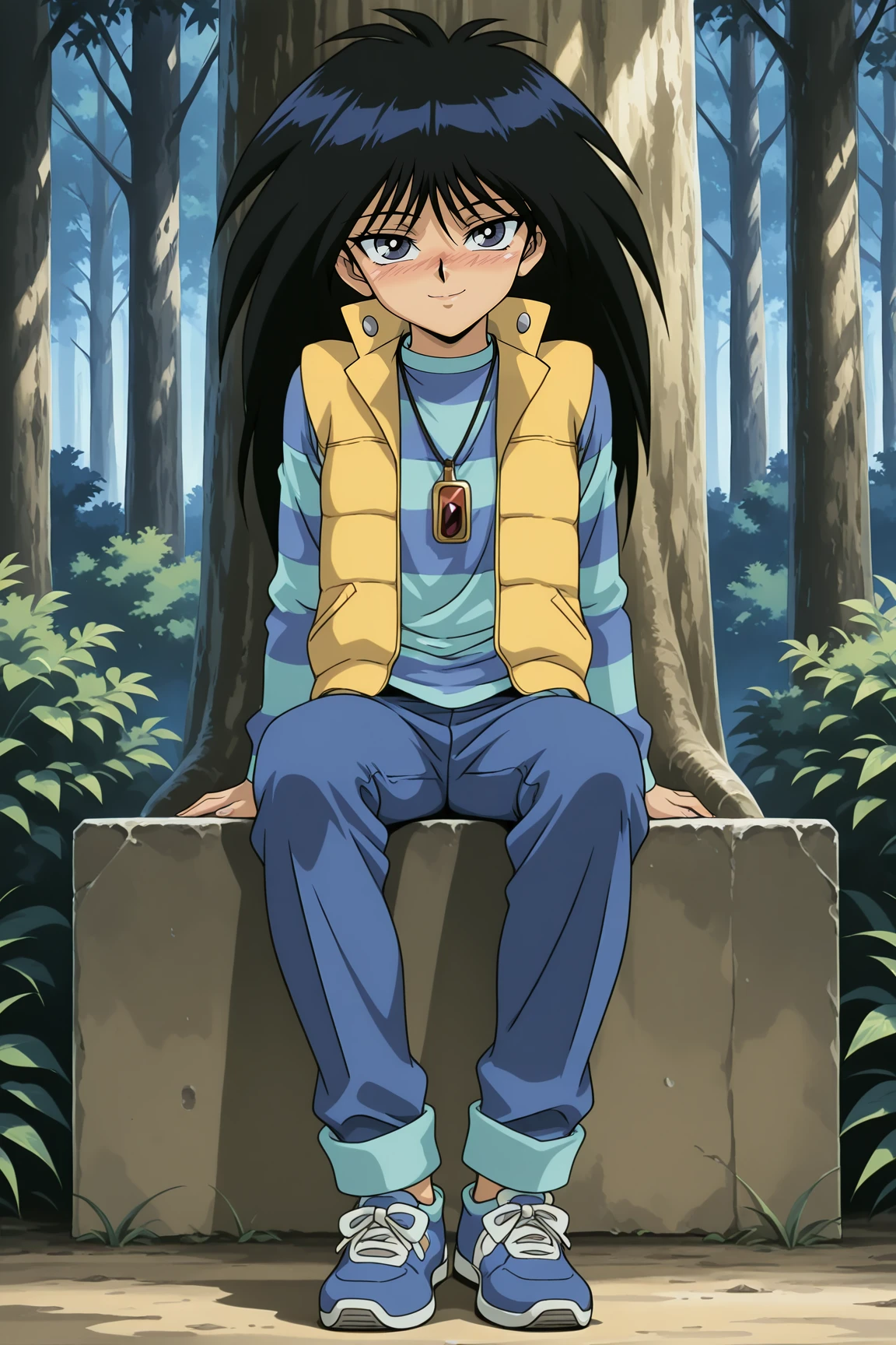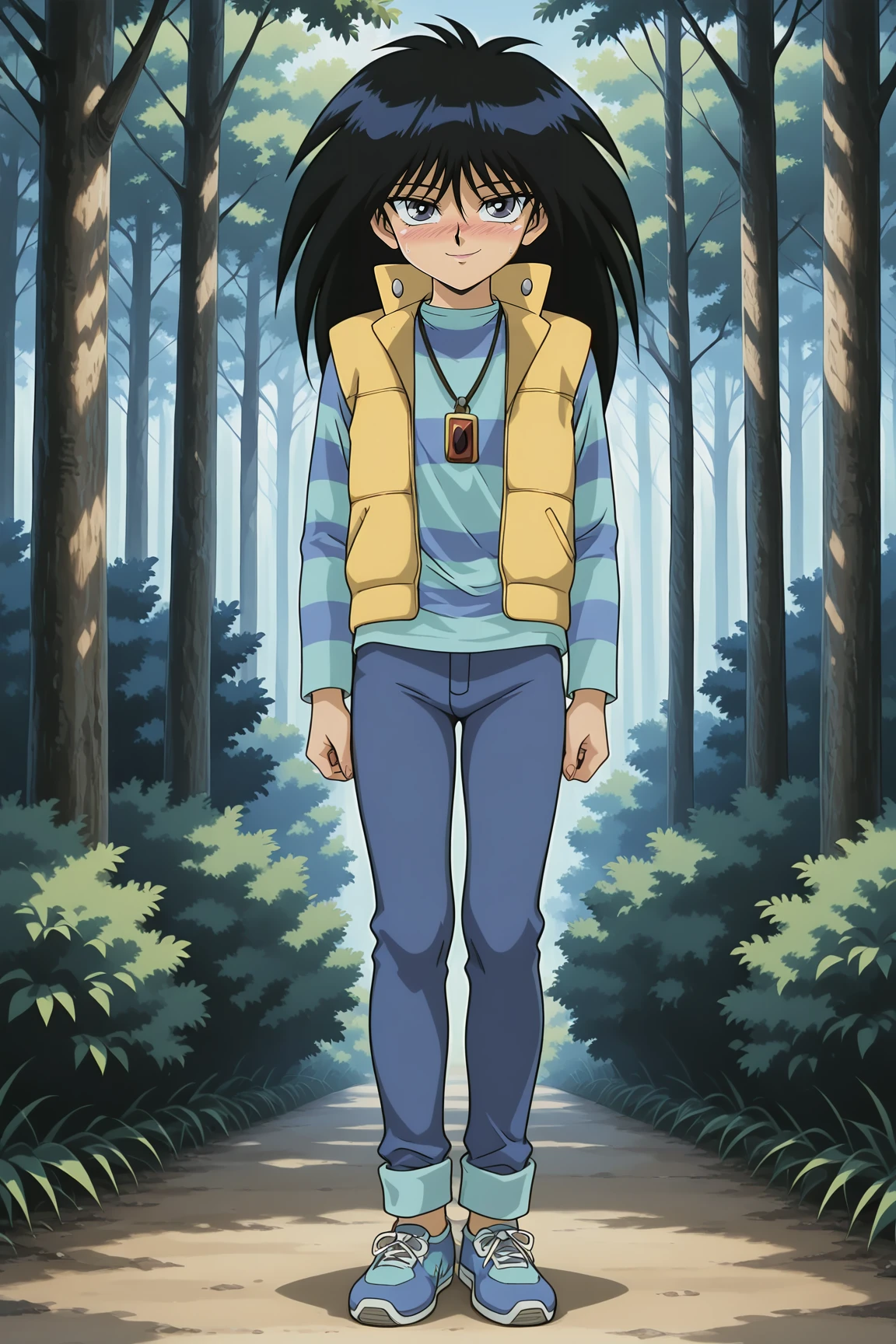 MokubaKaibaYGOILXL, 1boy, retro artstyle, purple eyes, black hair, long hair, hair between eyes, flat chest, necklace, yellow vest, blue shirt, striped shirt, blue pants, blue shoes