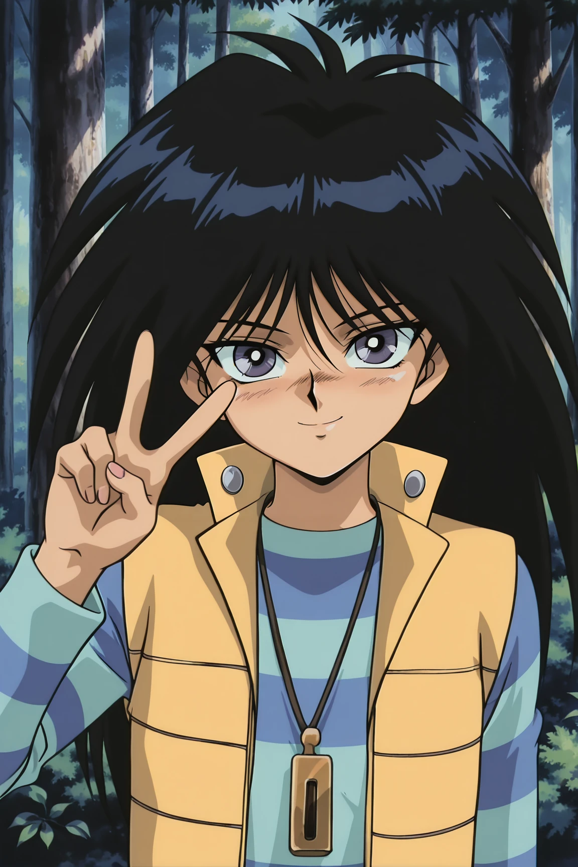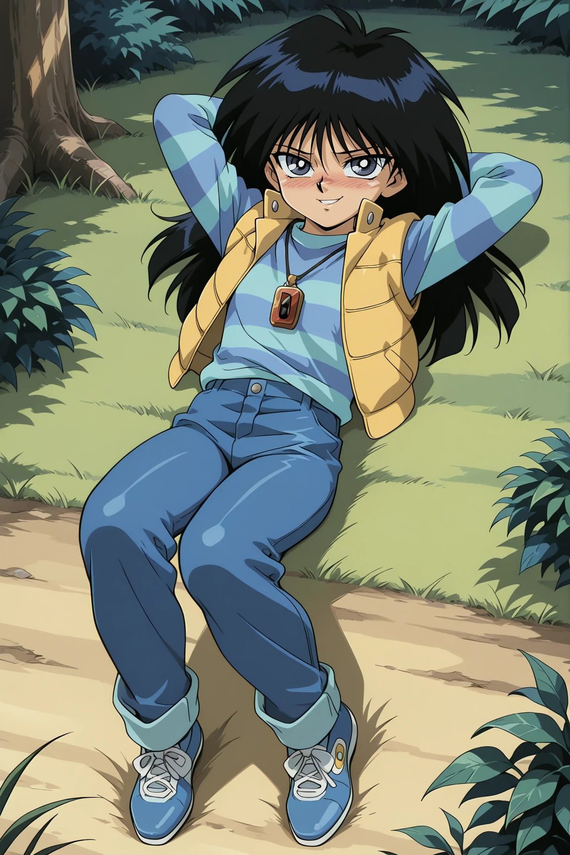 ➜ MokubaKaibaYGOILXL, retro artstyle, purple eyes, black hair, long hair, hair between eyes, flat chest, necklace, yellow vest, blue shirt, striped shirt, blue pants, blue shoes]--|======[ 💗 My Settings: 💗 ]======|--[
