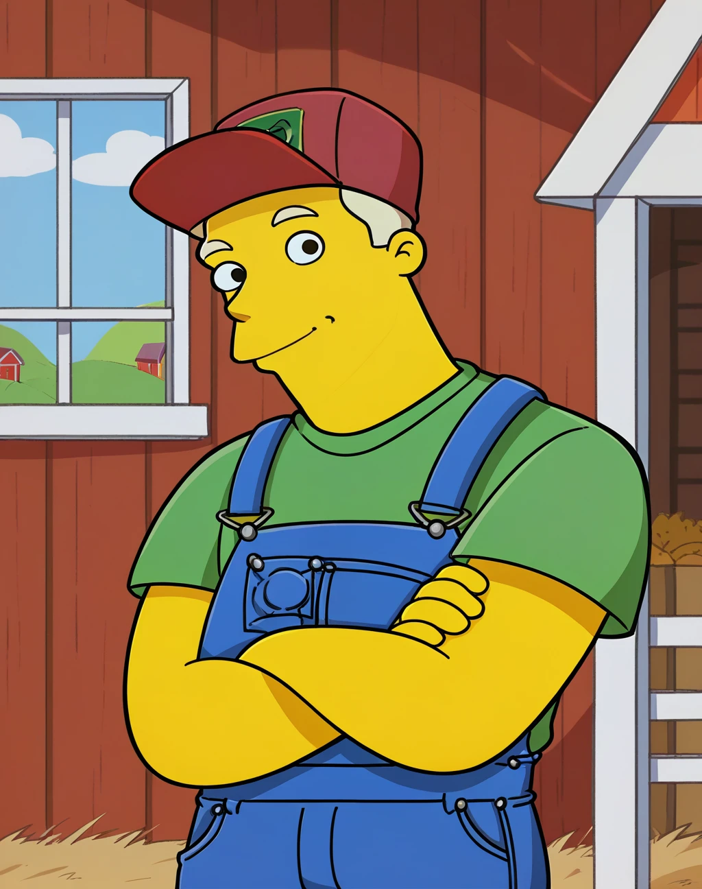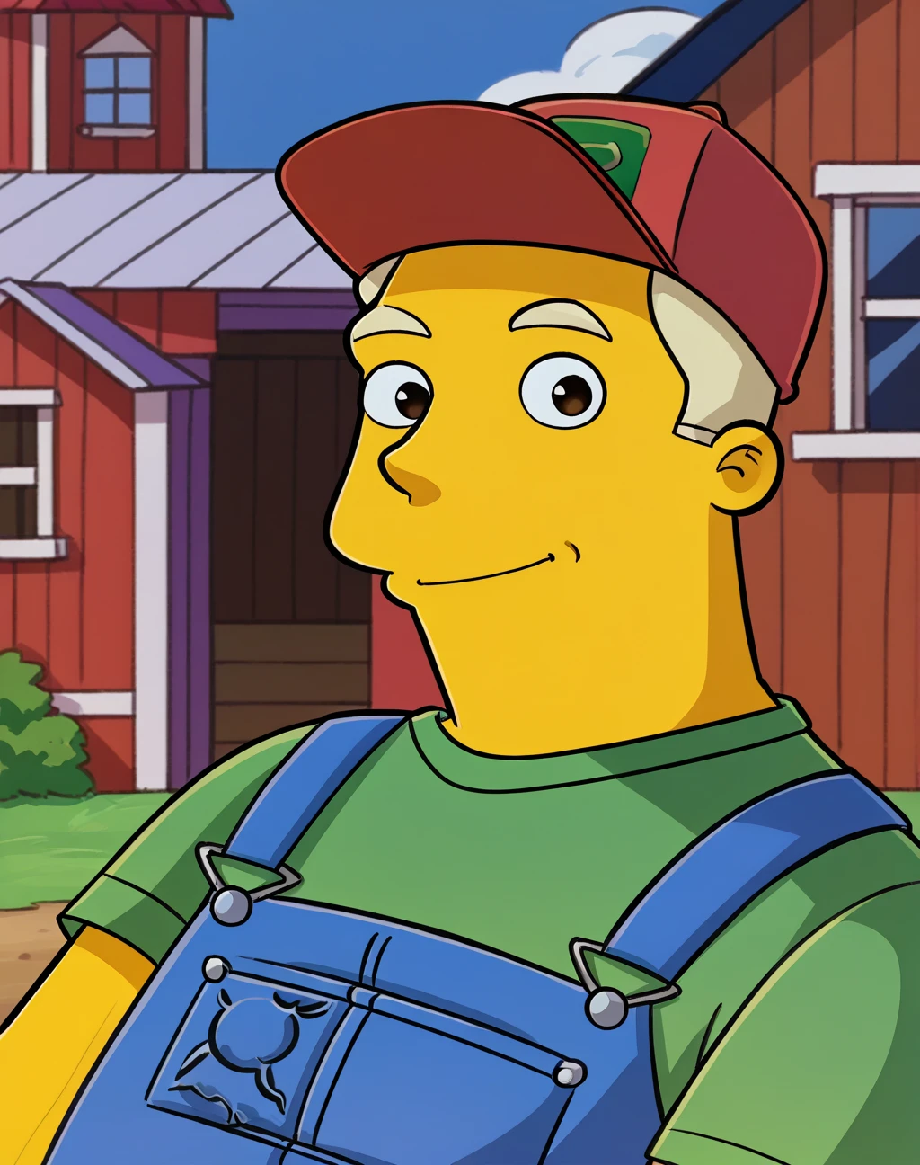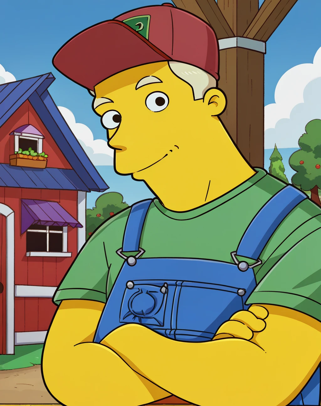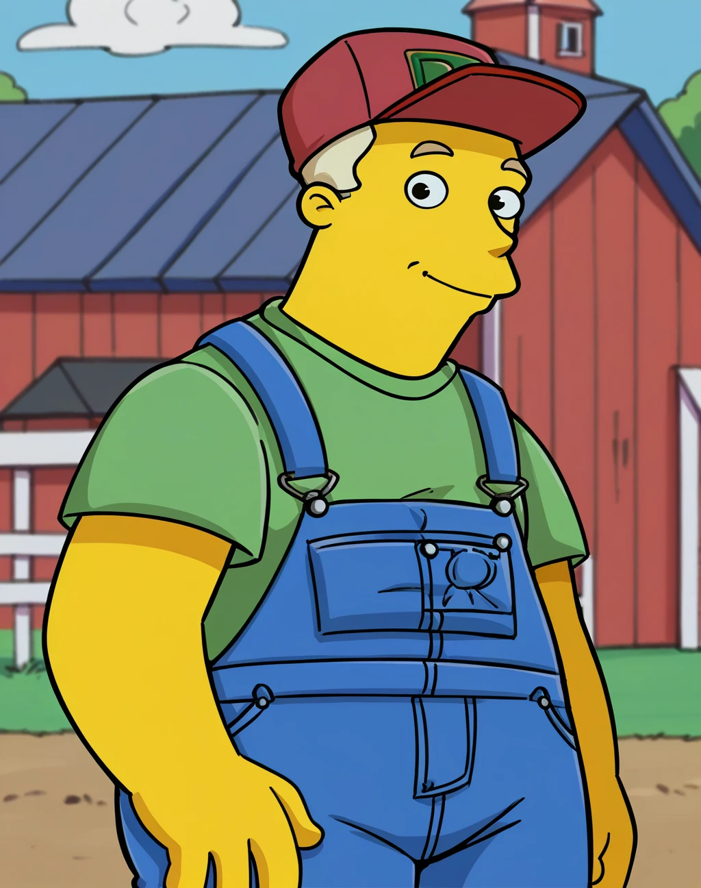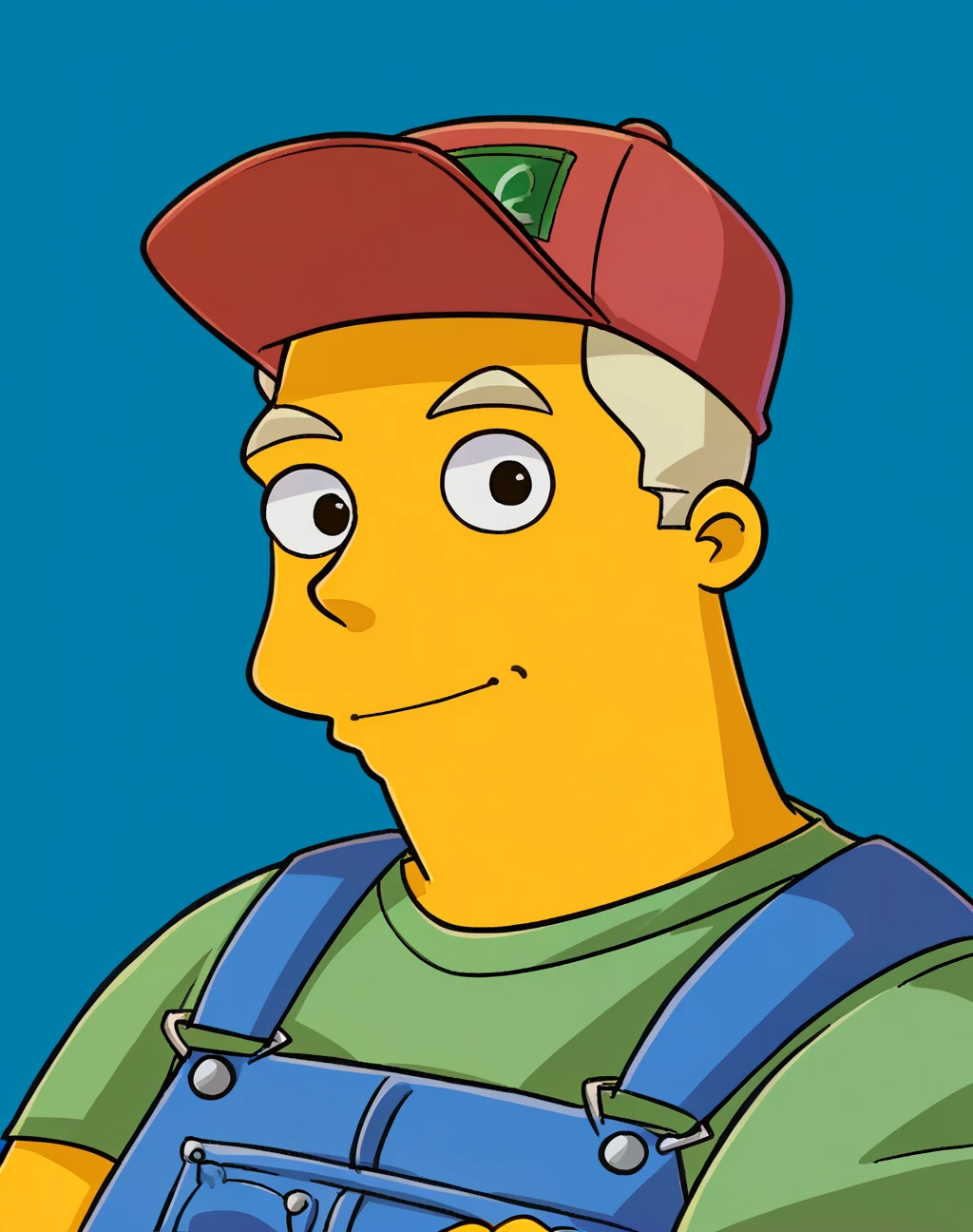 edgSneed, smile,,shirt, hat, cowboy shot, short sleeves, baseball cap, green shirt, overalls, yellow skin