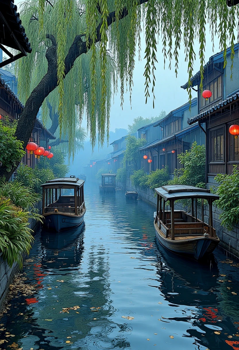 Oriental water town scenery, morning mist, riverside dwellings, gentle rain, wet pathways, boats waiting, fresh and peaceful.