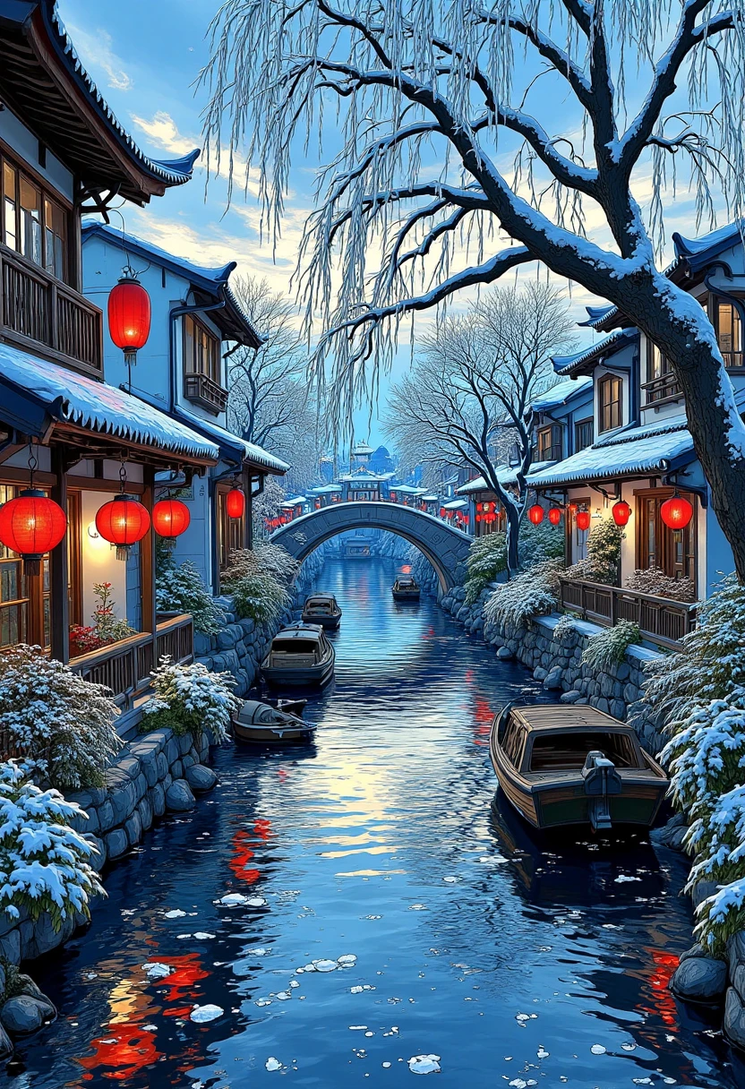 Oriental water town scenery, snowy dawn, white rooftops, frozen rivers, red lanterns contrast, silent and pure, winter magic.