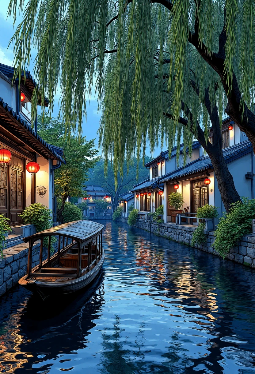 Oriental water town scenery, dusk time, willow trees by canals, boats floating, soft light, tranquil atmosphere, ancient architectural charm.
