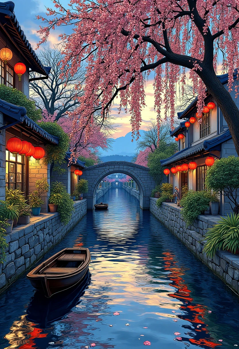 Oriental water town scenery, summer evening, blooming flowers, rivers shimmering, people strolling, warm lantern glow, lively calm.