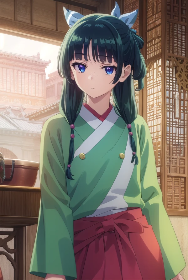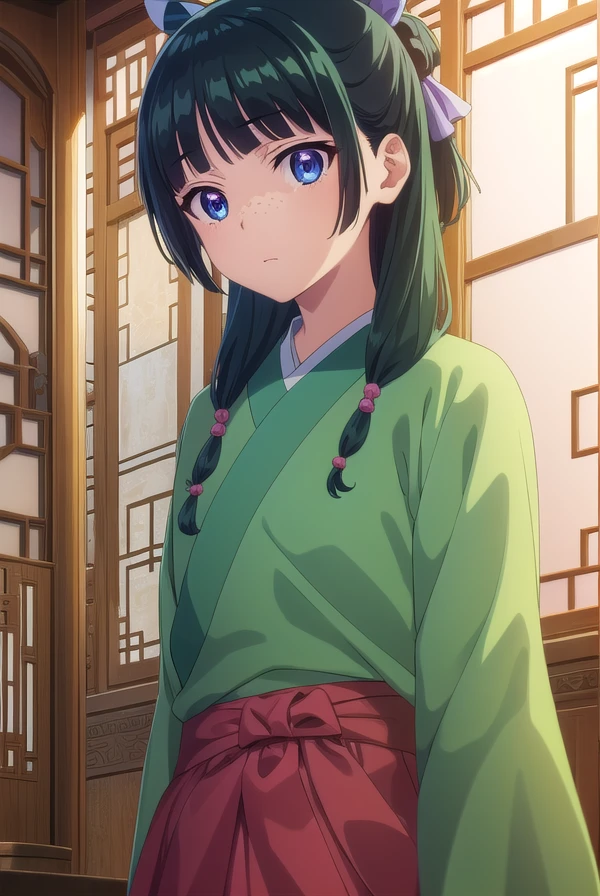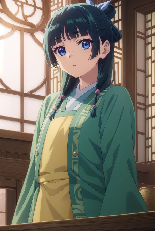 maomao, long hair, bangs, blue eyes, hair ornament, green hair, blunt bangs, freckles, hair bun, single hair bun,