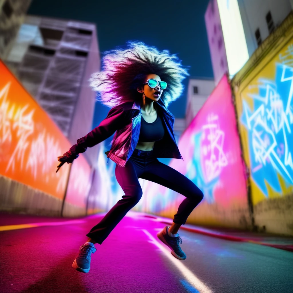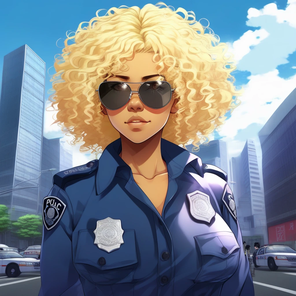 Atsuko Jackson (アツコ・ジャキソン) is an Afro-Diamandran policewoman who lived with Michiko Malandro, who seems to have a score to settle with her. She is now an outlaw vigilante. Sample Pompt " Atsuko Jackson in an electrifying urban battle scene, mid-leap with her afro billowing behind her, neon lights reflecting off her sunglasses, striking a powerful pose with intense motion blur, graffiti-covered walls and retro-futuristic cityscape in the background" - 0.5-0.6 works best