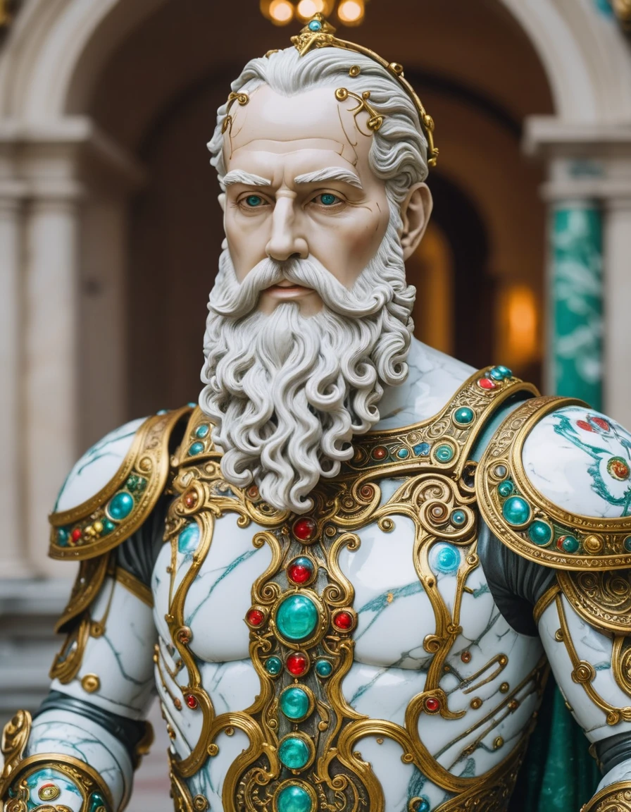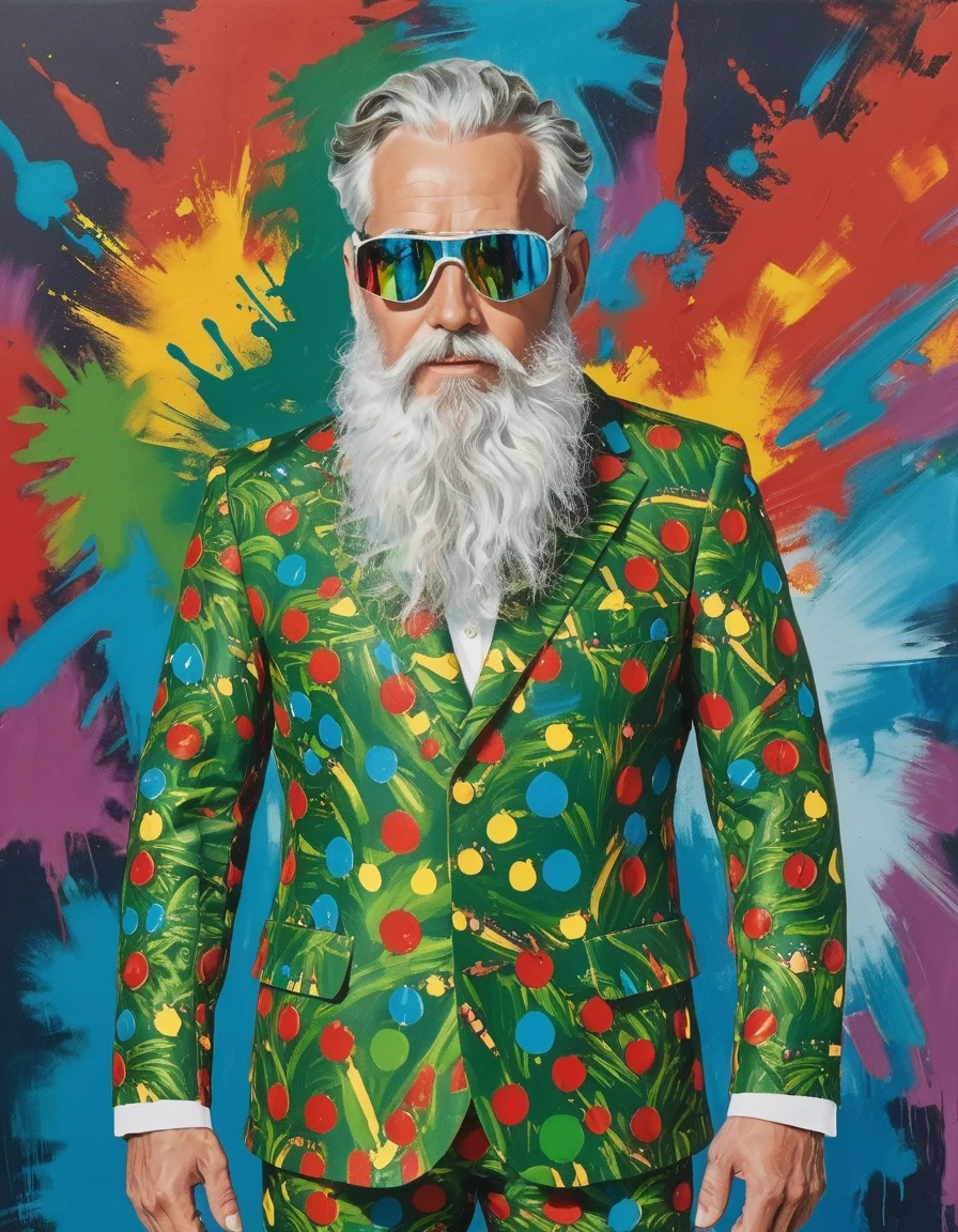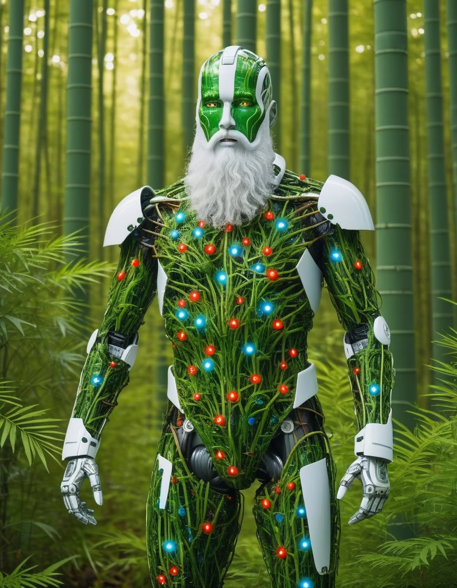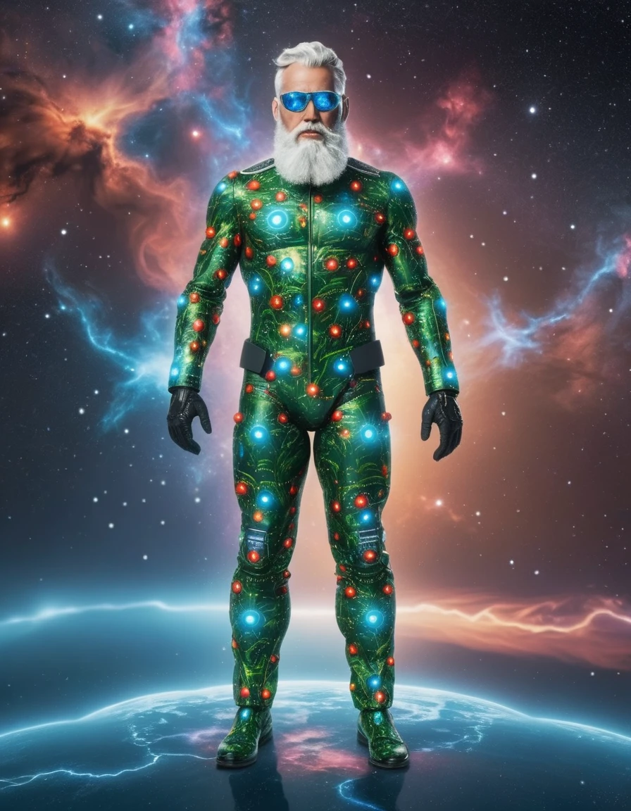 The suit is made of a green fabric with lights and ornaments. It even lights up with some prompts!