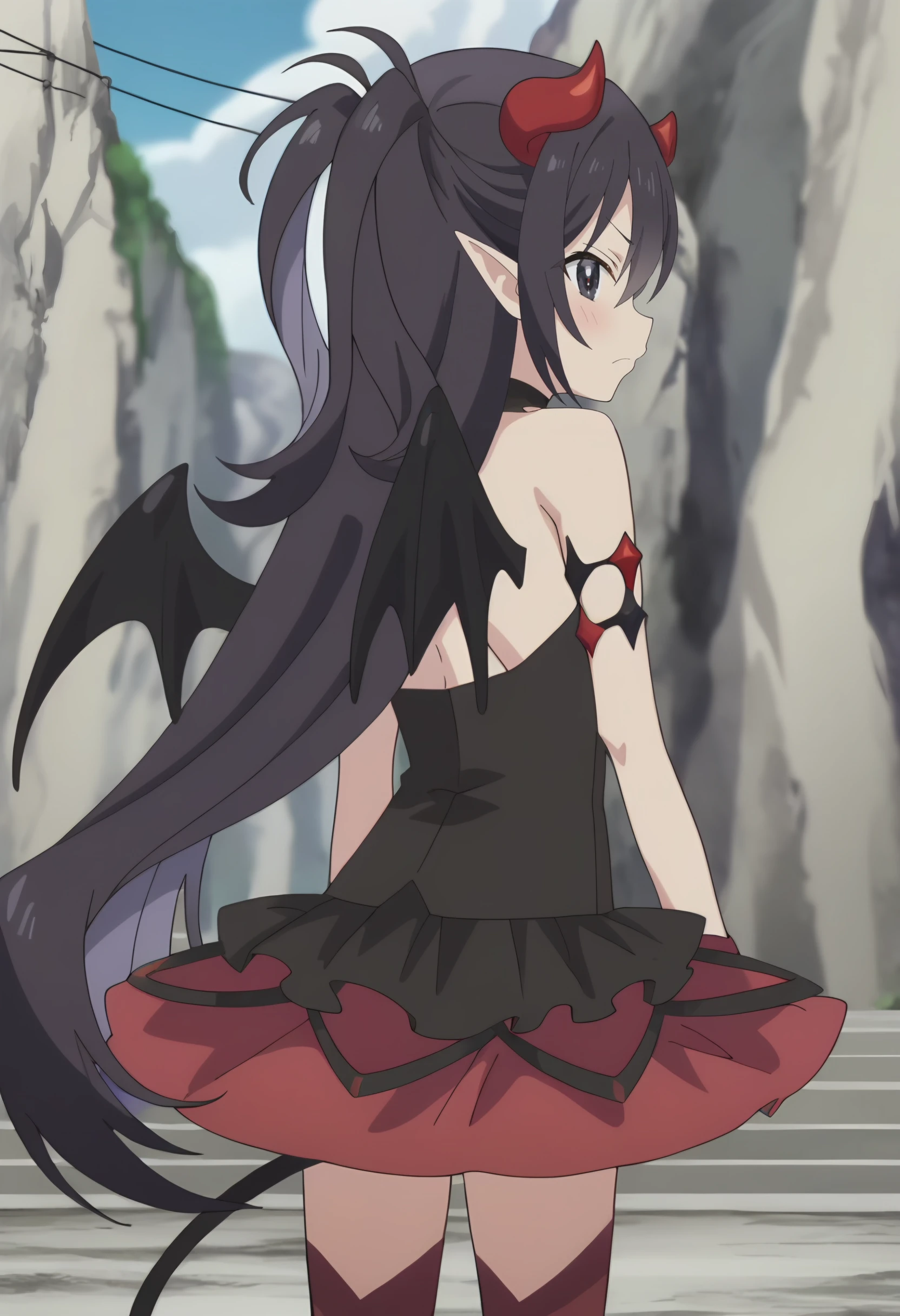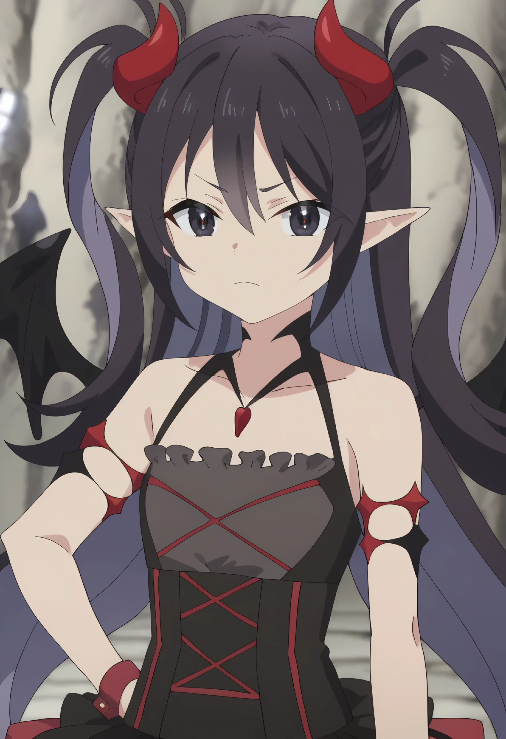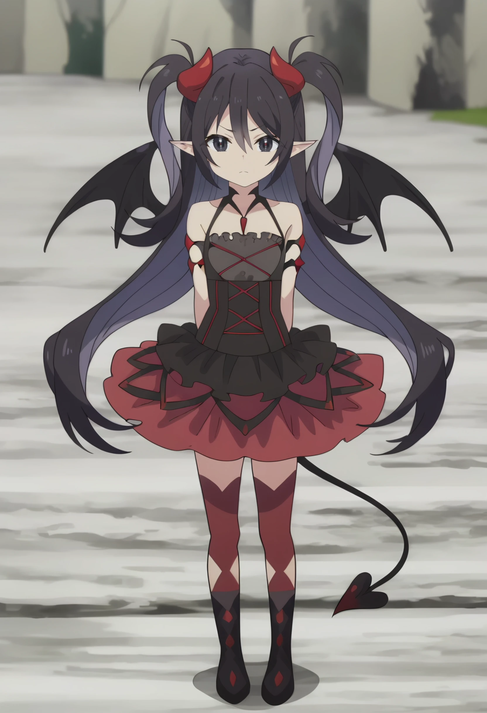 Luceria, 1girl, solo, long hair, pointy ears, black hair, demon girl, demon horns, demon wings, demon tail, two side up, black eyes, hair between eyes,