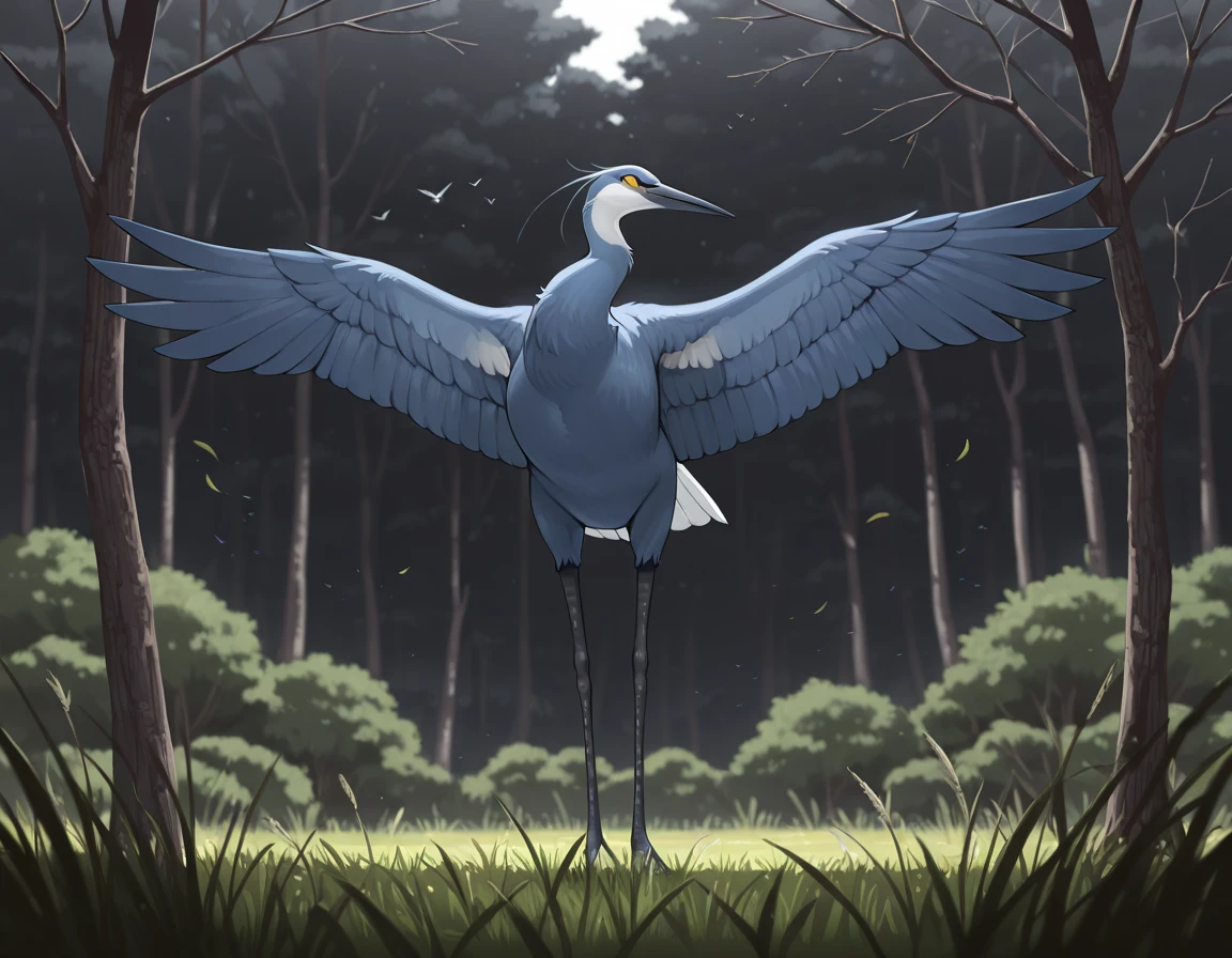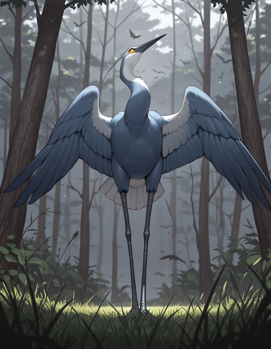 Add "feral, bird, heron, avian, wings, blue body, long legs, two legs" for better results