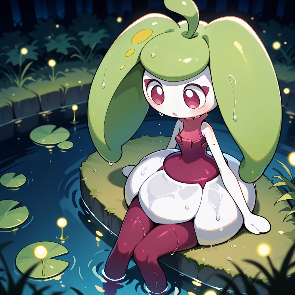 pokemon \(creature\), flora fauna, long hair, purple eyes, purple dress, wide hips, green hair, white head, purple legs, white arms, white skirt