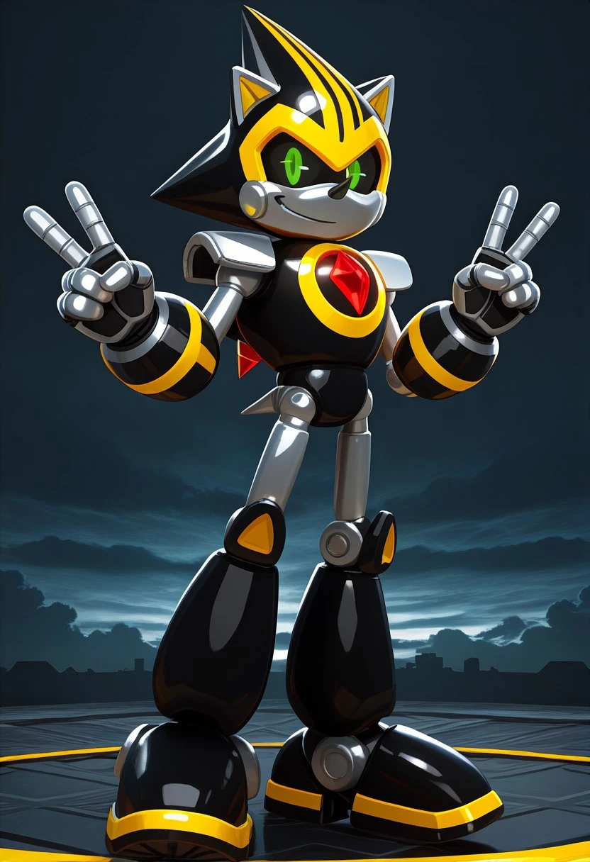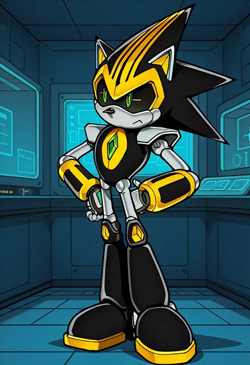 Shard the Metal, robot, black metal skin, yellow stripe on top of head, black sclera, green pupils, silver hands, arm cannon, black shoes, red gem in chest