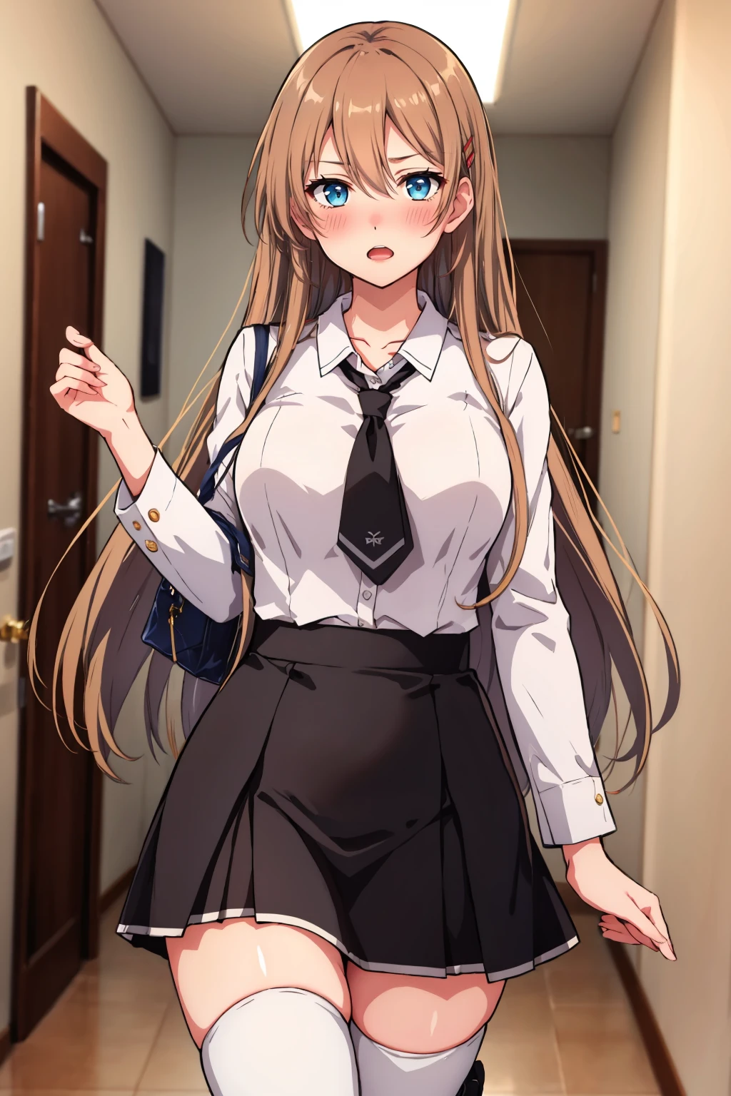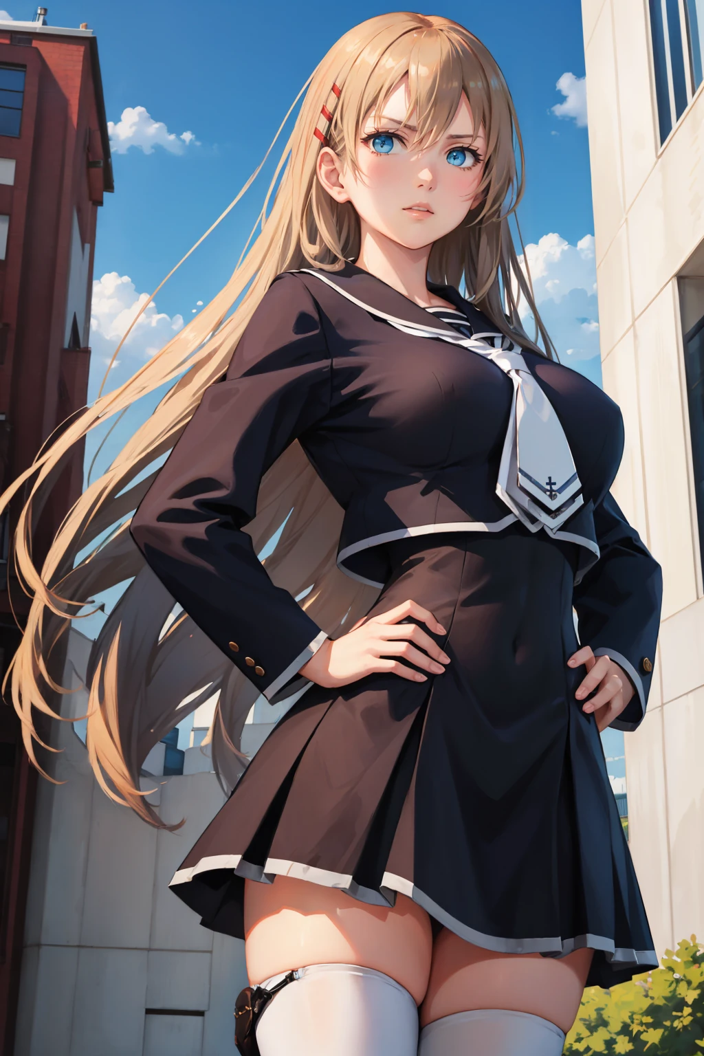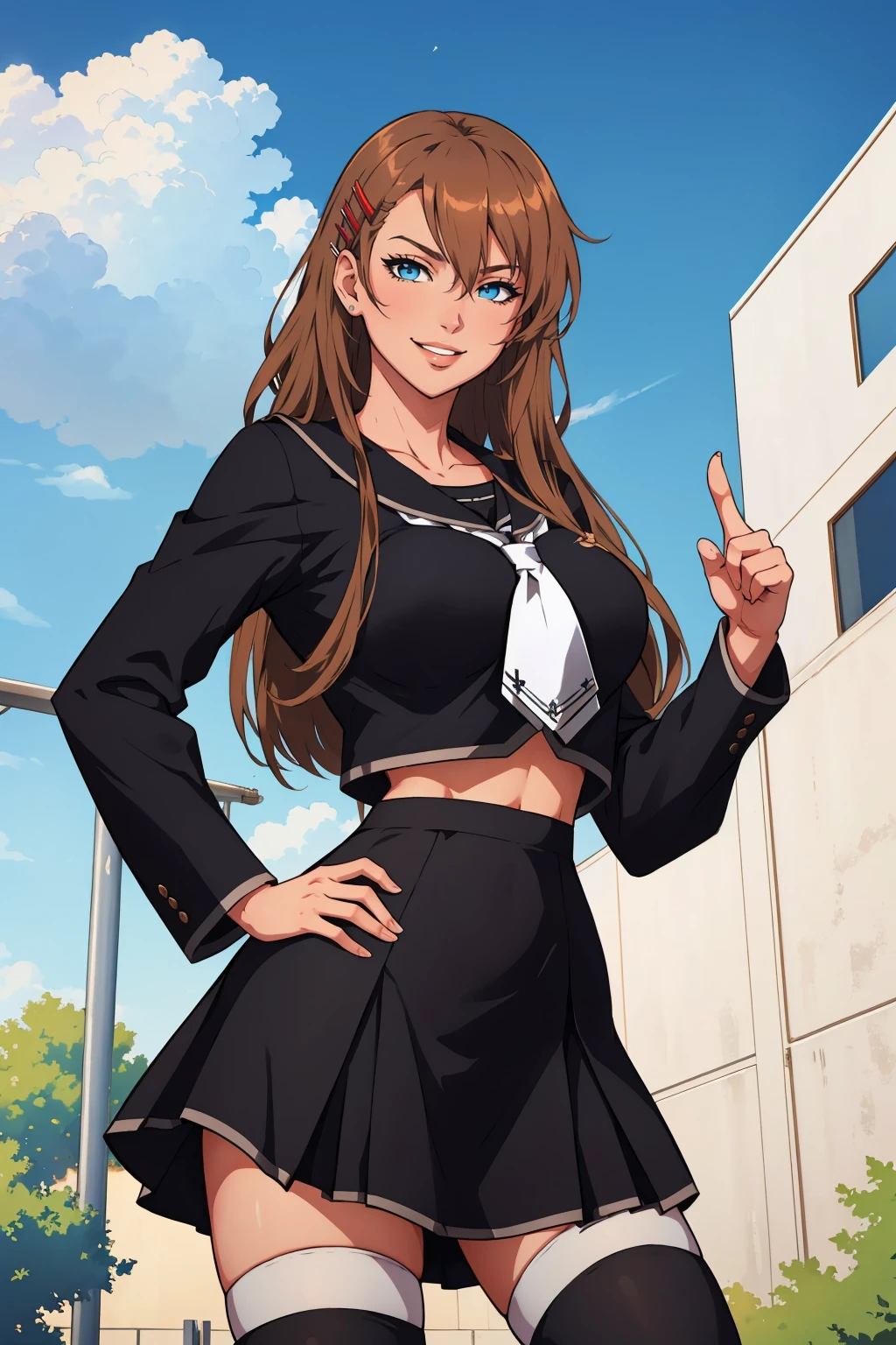 Add "hairpin, black serafuku, black shirt, long sleeves, black skirt, white thighhighs" for her typical look.