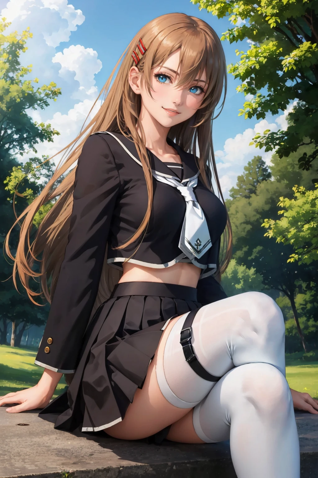 hairpin, black serafuku, black shirt, long sleeves, black skirt, white thighhighs,