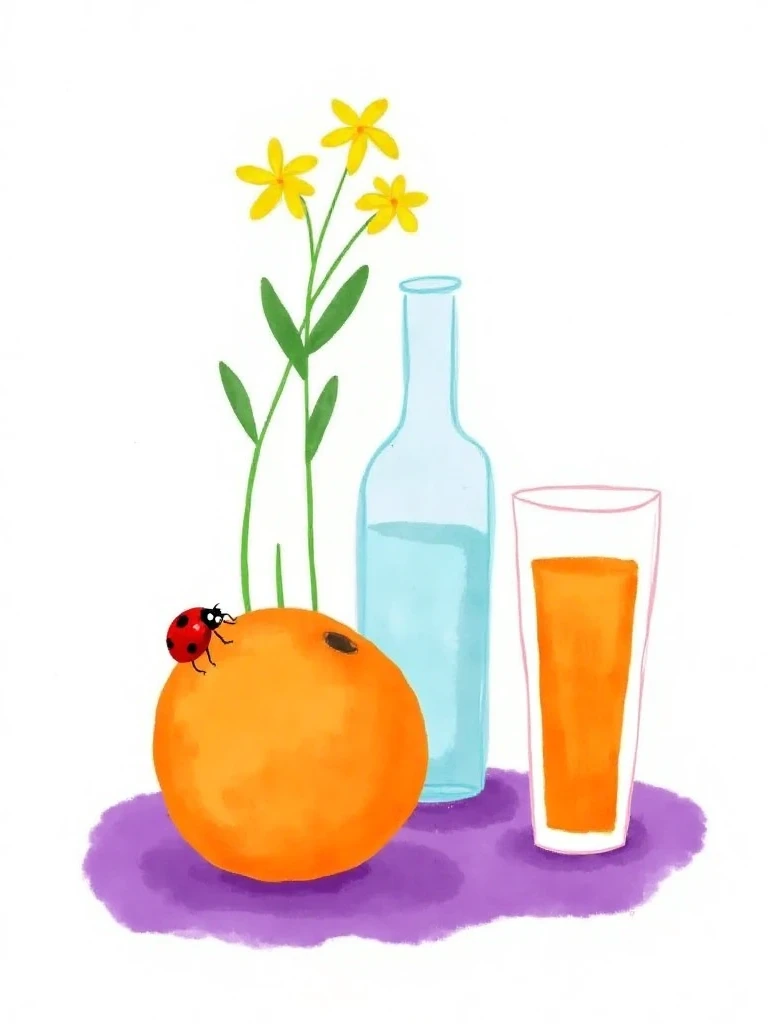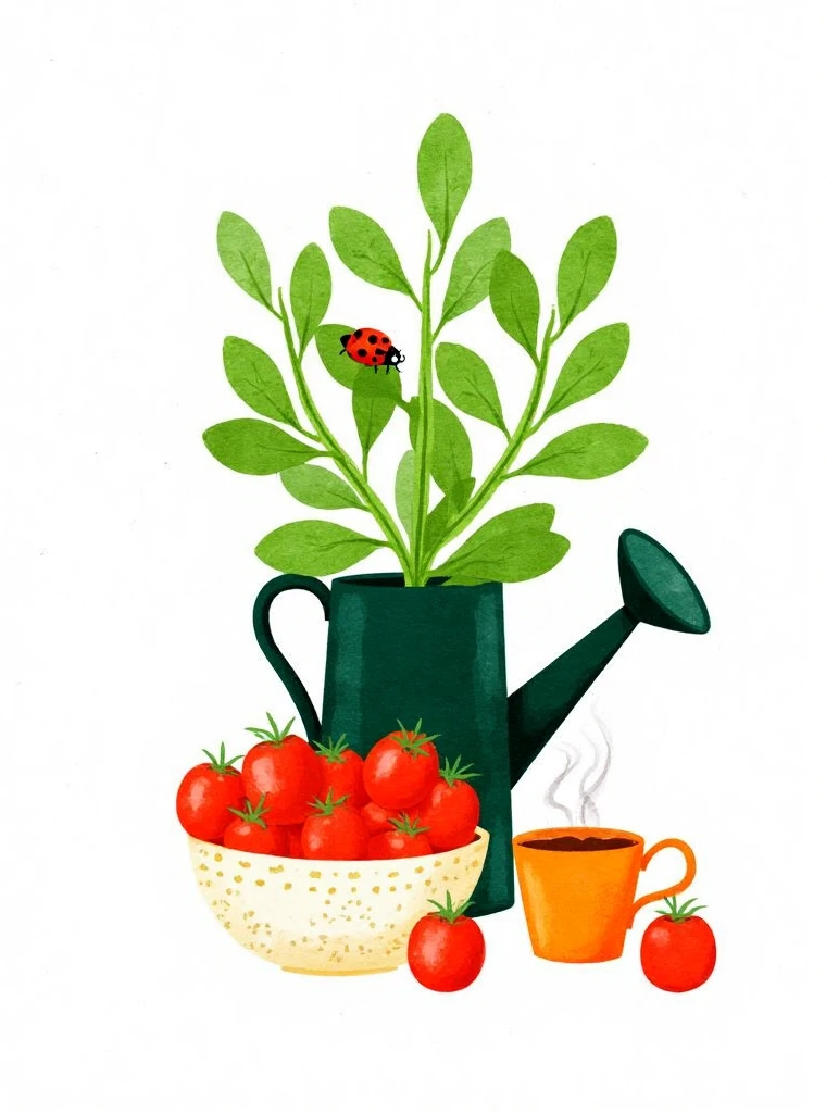 Cartoon - style illustration, a table with a potted plant, a bowl of strawberries, a glass of juice, warm and homely.