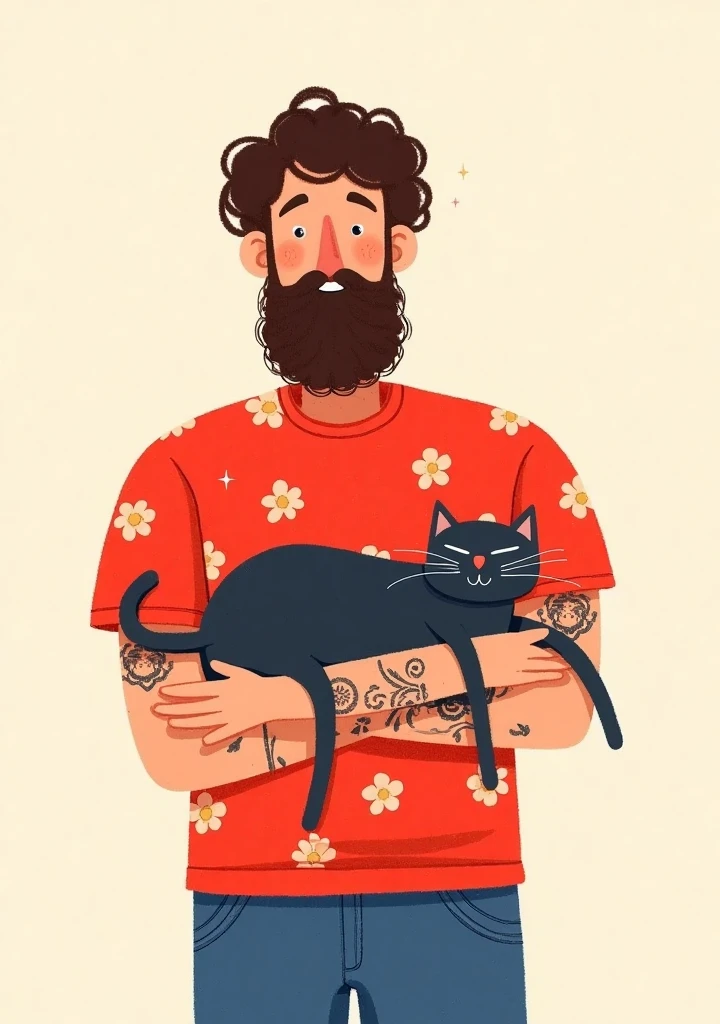 Cartoon - style illustration, a man in a red floral shirt, a sleeping cat on his arm, relaxed and warm.
