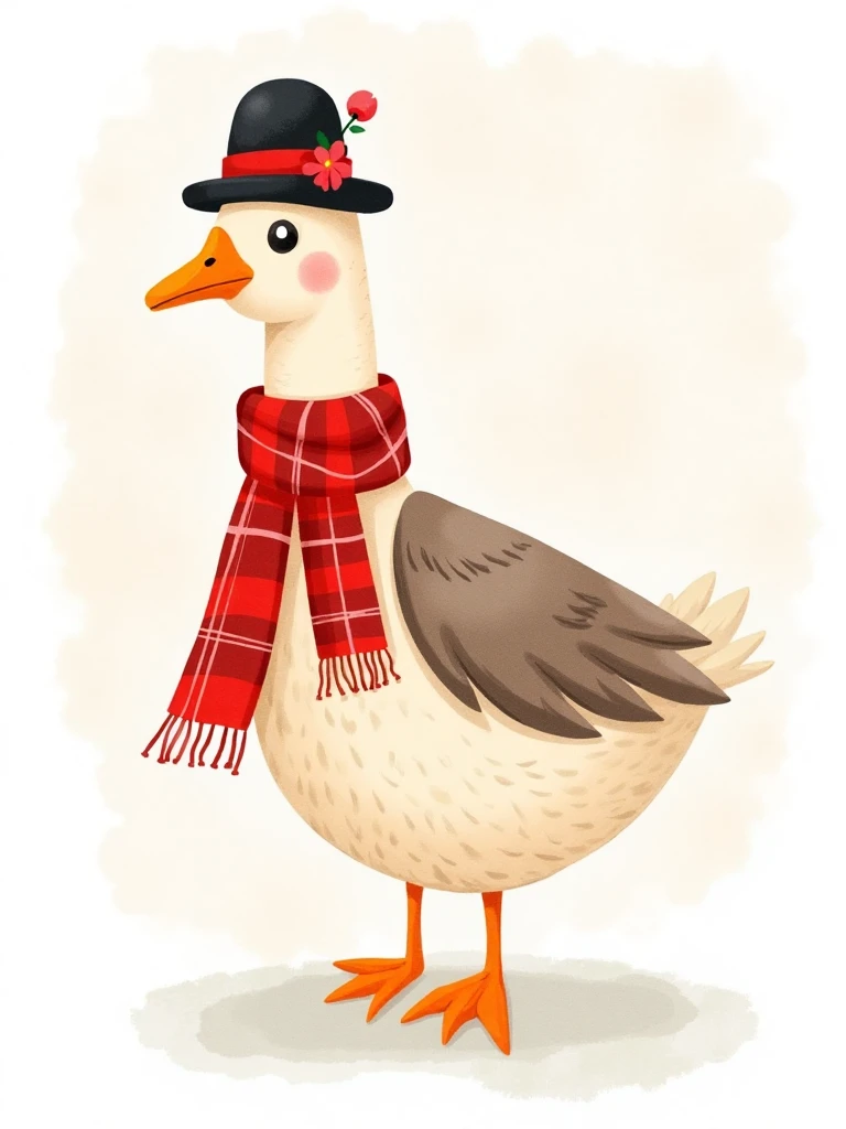 Cartoon - style illustration, a chubby bird wearing a striped scarf, standing on a snowy branch, simple background, soft colors.