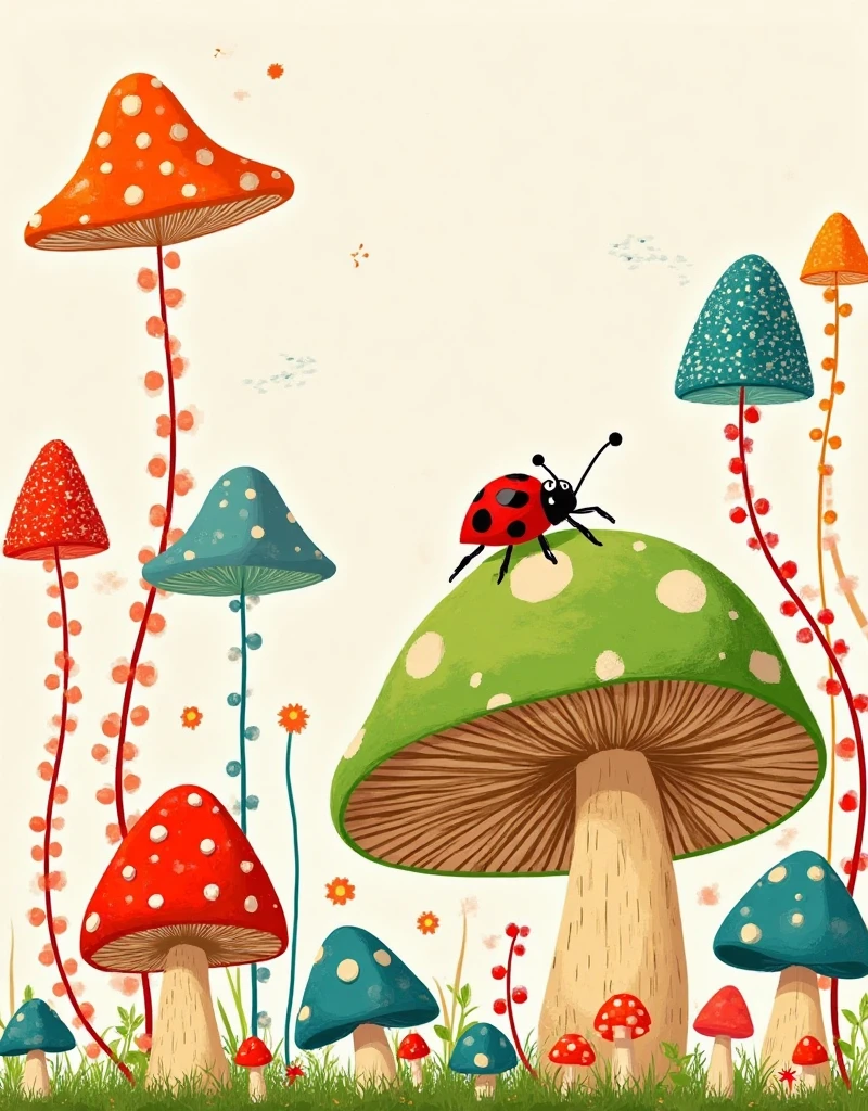 Cartoon - style illustration, a group of mushrooms in a magical forest, with dewdrops, bright hues, whimsical shapes.