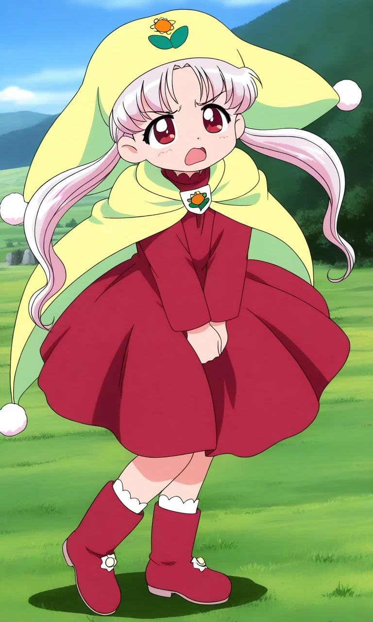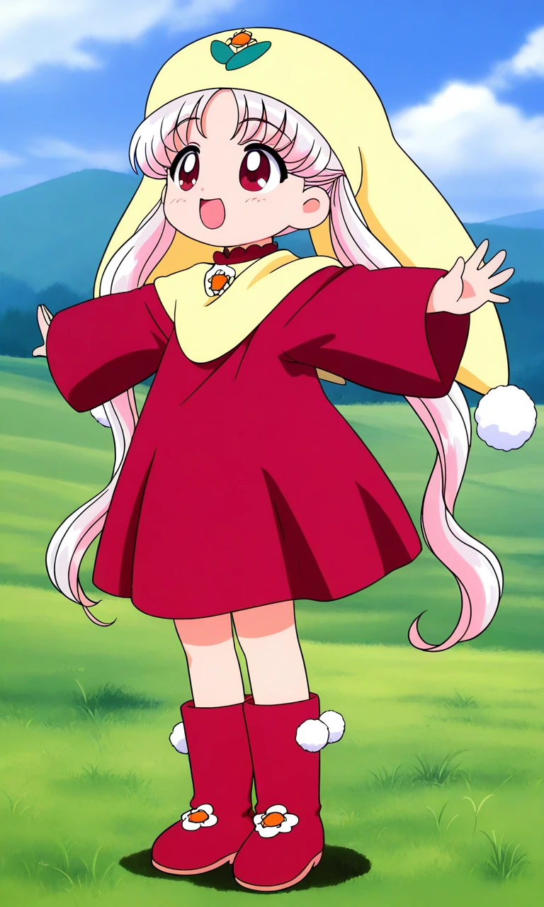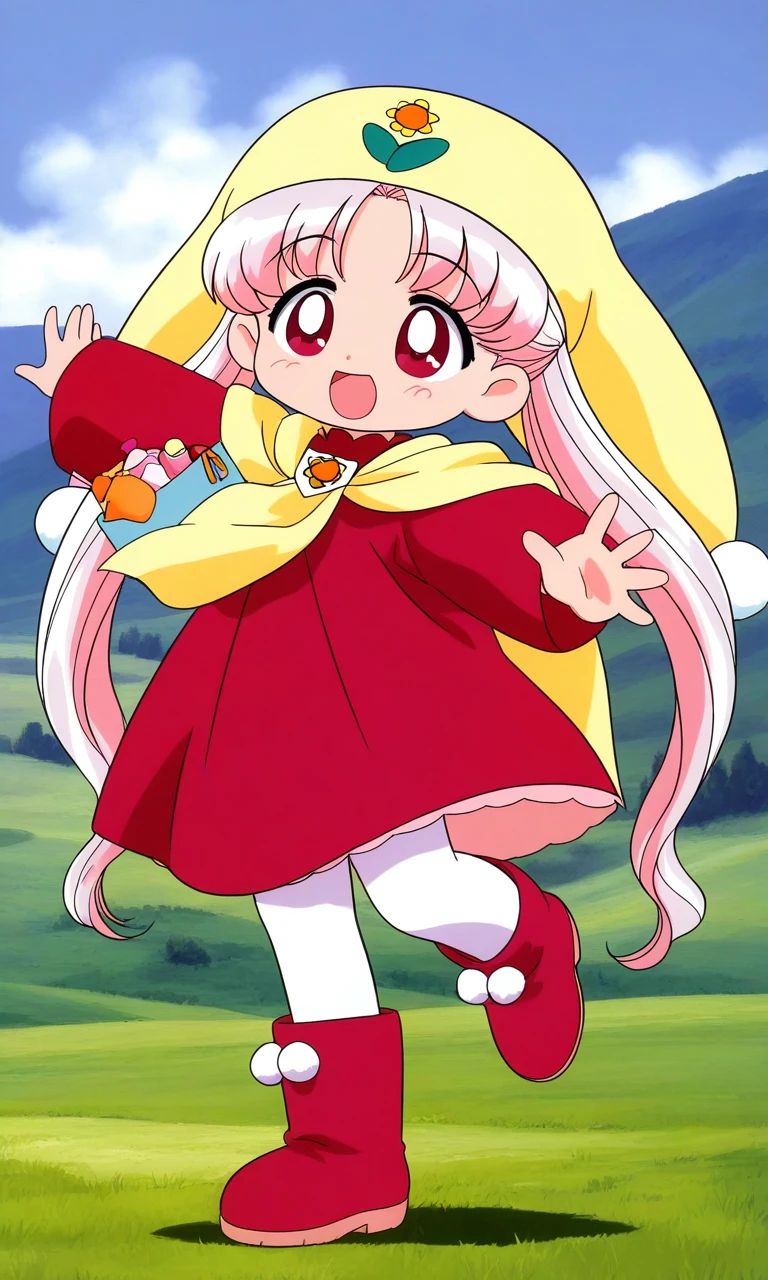 red dress, boots, pom pom (clothes), Yellow pantyhose,