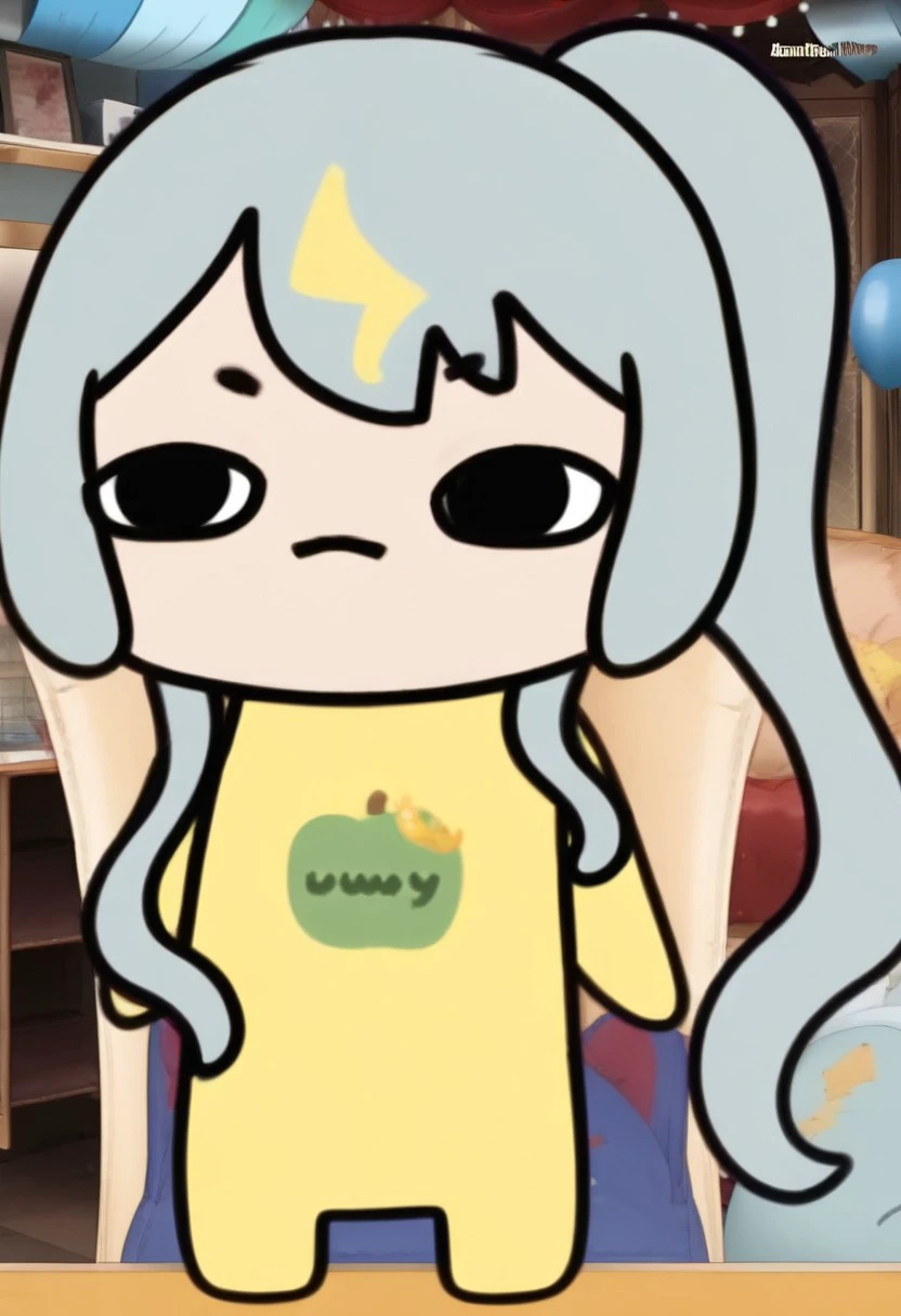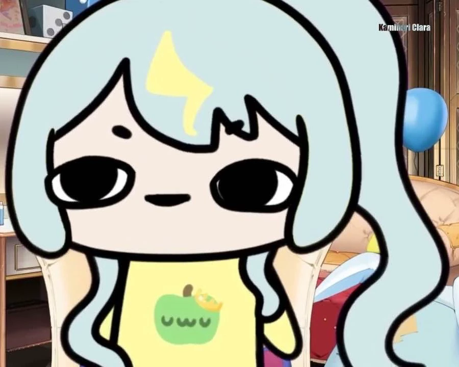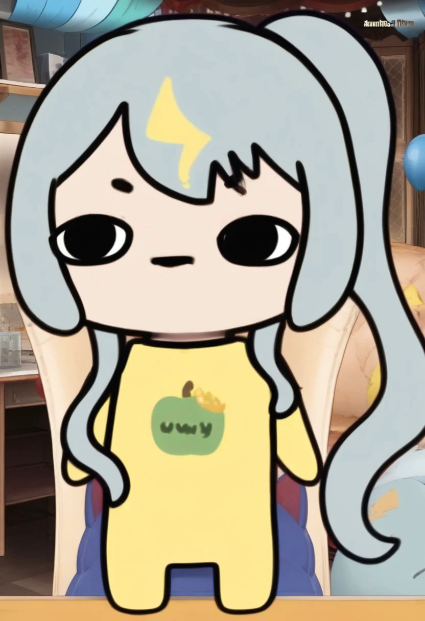 Kaminari Clara, not a bunny showgirl idol, but an Apple Princess. Trained from a whole 4 images, all of them are stream screenshots.Tags: 1girl, solo, chibi, long hair, chibi only, black eyes, yellow shirt, side ponytail