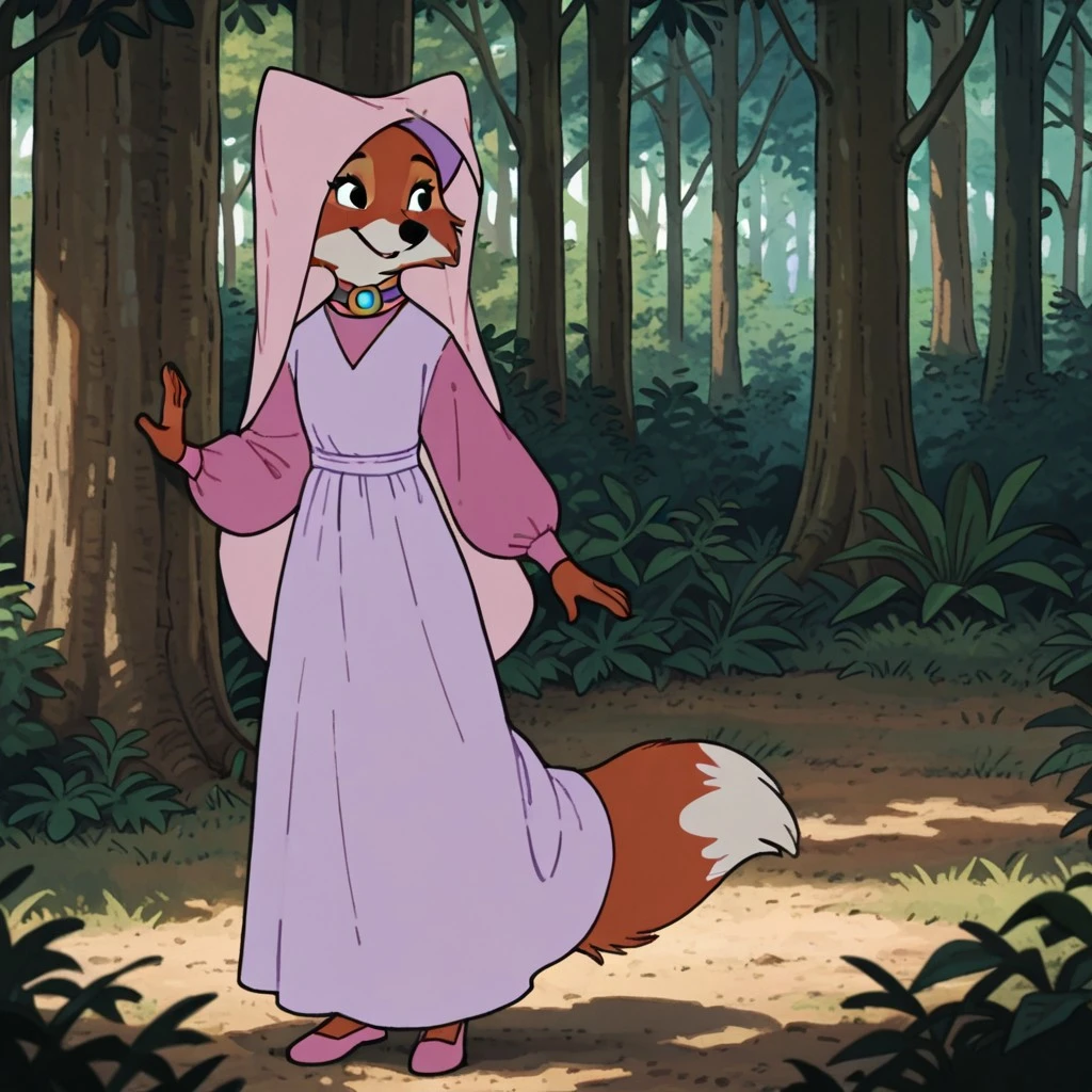 maidmarianrhil, semi-anthro, female, fox_girl, red-orange fur, black eyes, lavender dress, pink sleeves, long sleeves, purple choker, gold brooch with blue jewel, pink veil, pink flats,