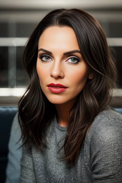 a RAW photograph of beautiful (Wh1tn3y woman) sitting on a couch,wearing a (gray dress),facing the viewer,(medium shot),portrait,(perfect hair),(red lipstick),simple background,rich details,hyper realistic,intense,highly detailed,face_focus,looking_at_viewer,<lora:Wh1tn3y_SD1-5:0.9>