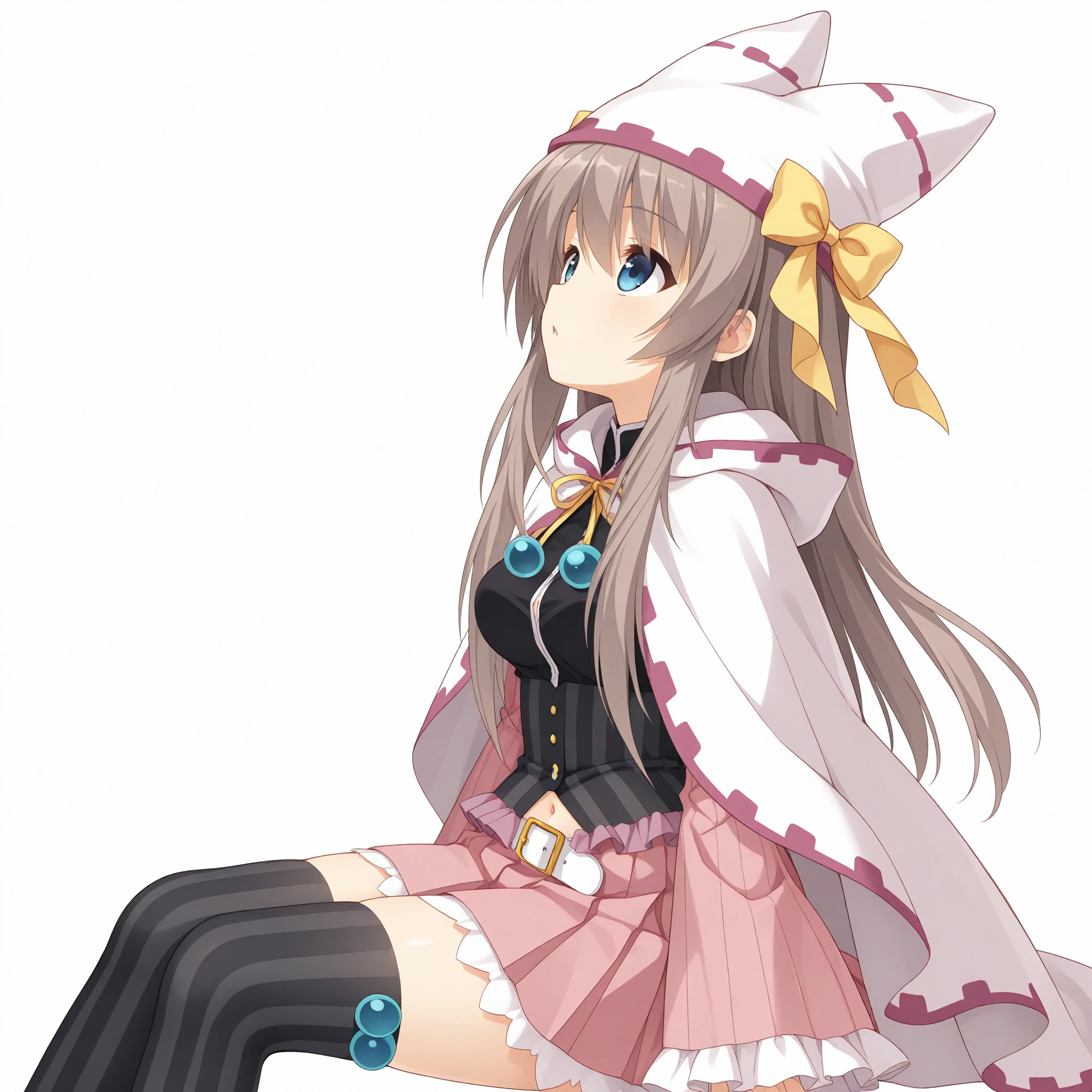 cat hat,white headwear,hat bow,yellow bow,magical girl,vertical-striped thighhighs,pink skirt,frilled sleeves,wide sleeves,miniskirt,black thighhighs,long sleeves,pleated skirt,black shirt,white cape,buttons,vertical-striped shirt,drawstring,white belt,frilled shirt,purple frills,white frills,frilled skirt,white cloak,私服 (casual)