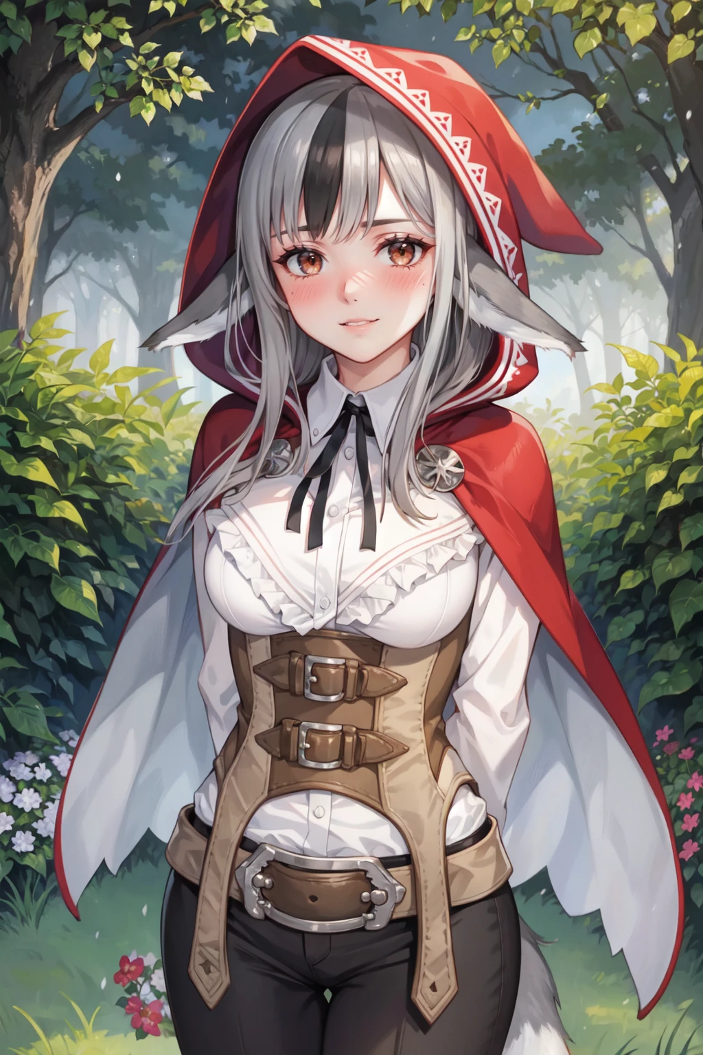 velouria, animal ears, long hair, wolf ears, streaked hair, hood, tail, wolf tail, black hair, hood up, pants, long sleeves, belt, boots