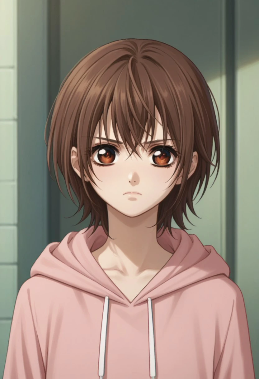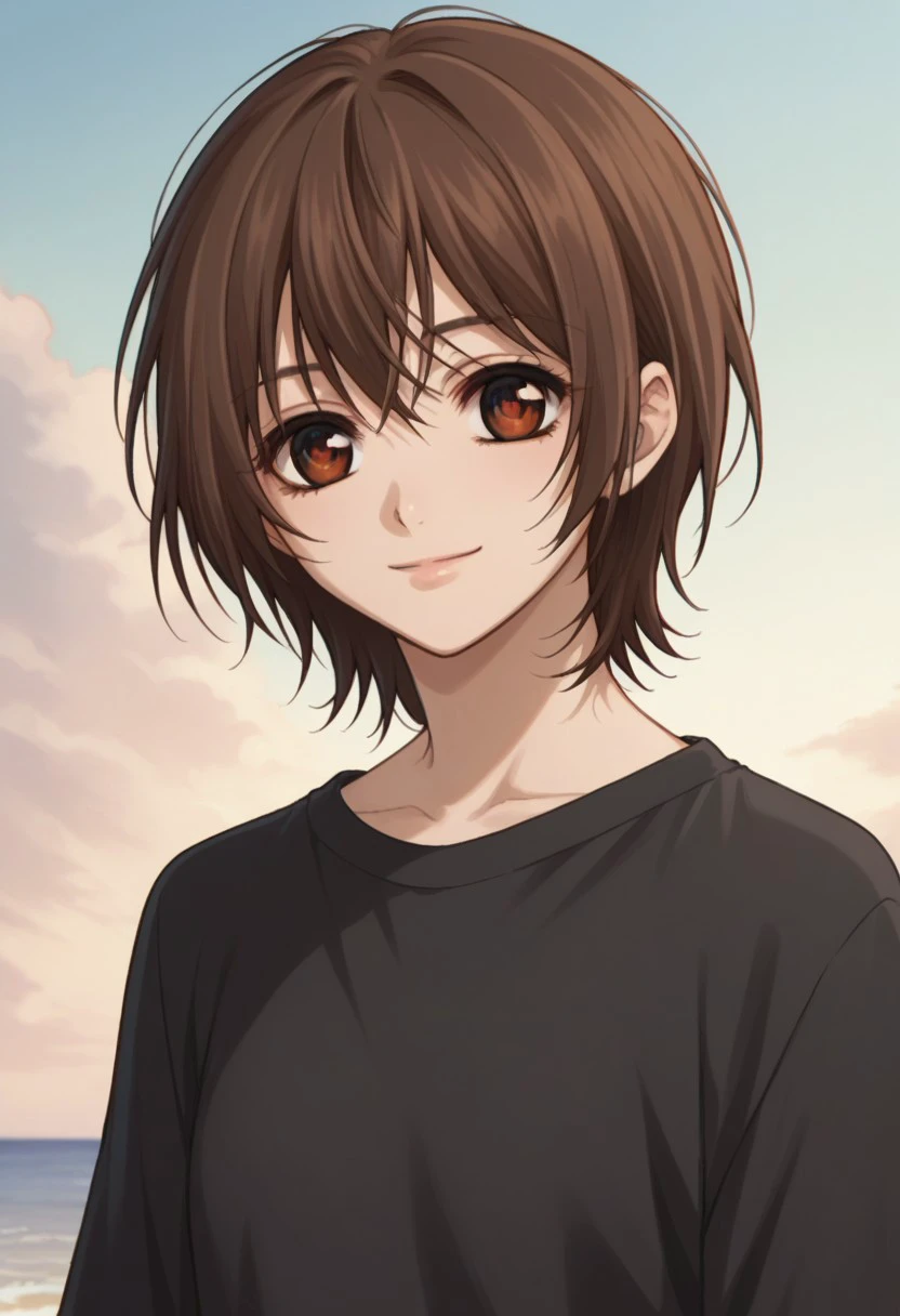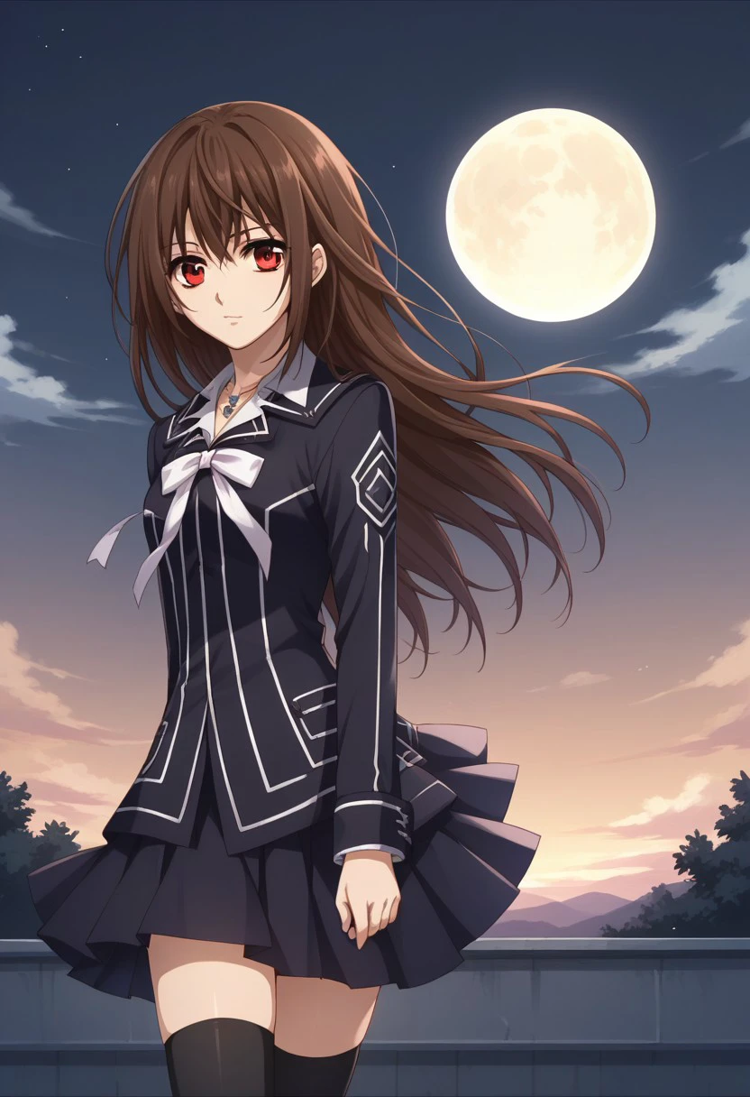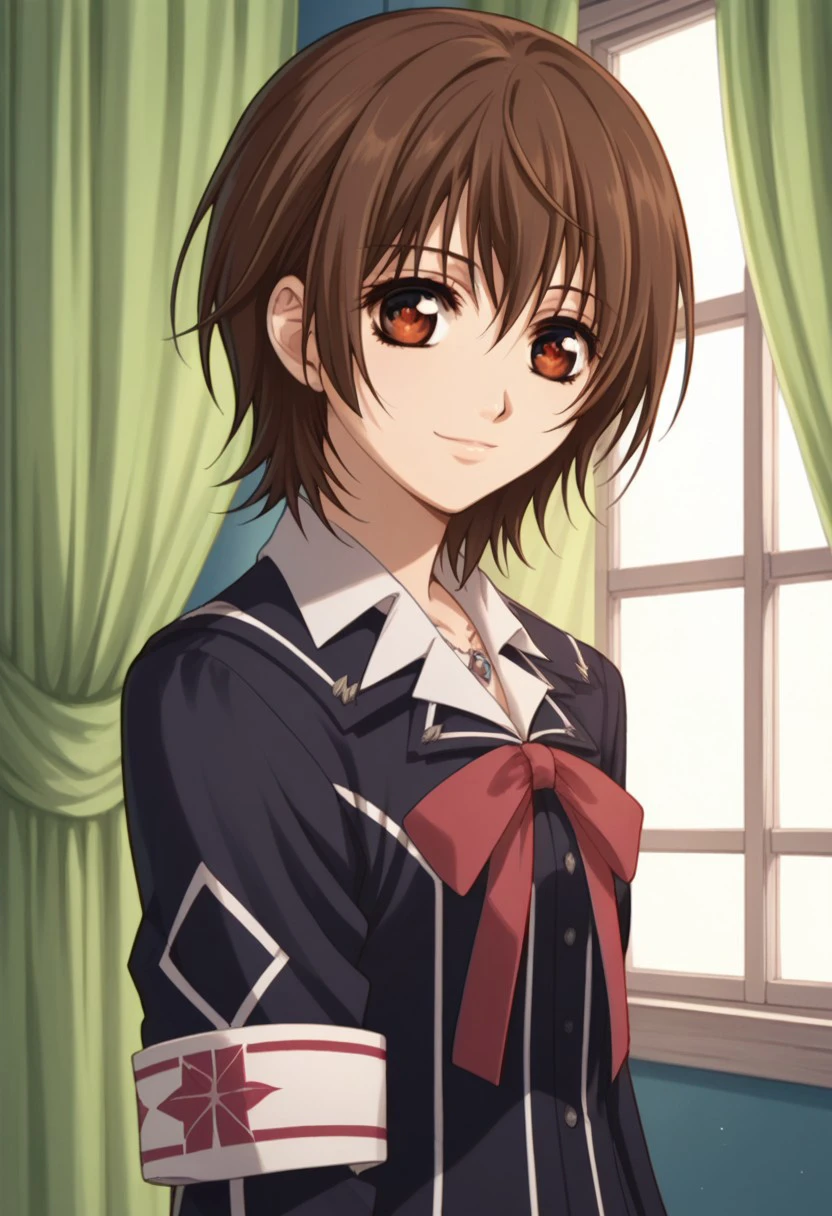 yukicross, 1girl, thighhighs, brown eyes, brown hair, school uniform, zettai ryouiki, short hair, jewelry, black thighhighs, skirt, armband, ribbon