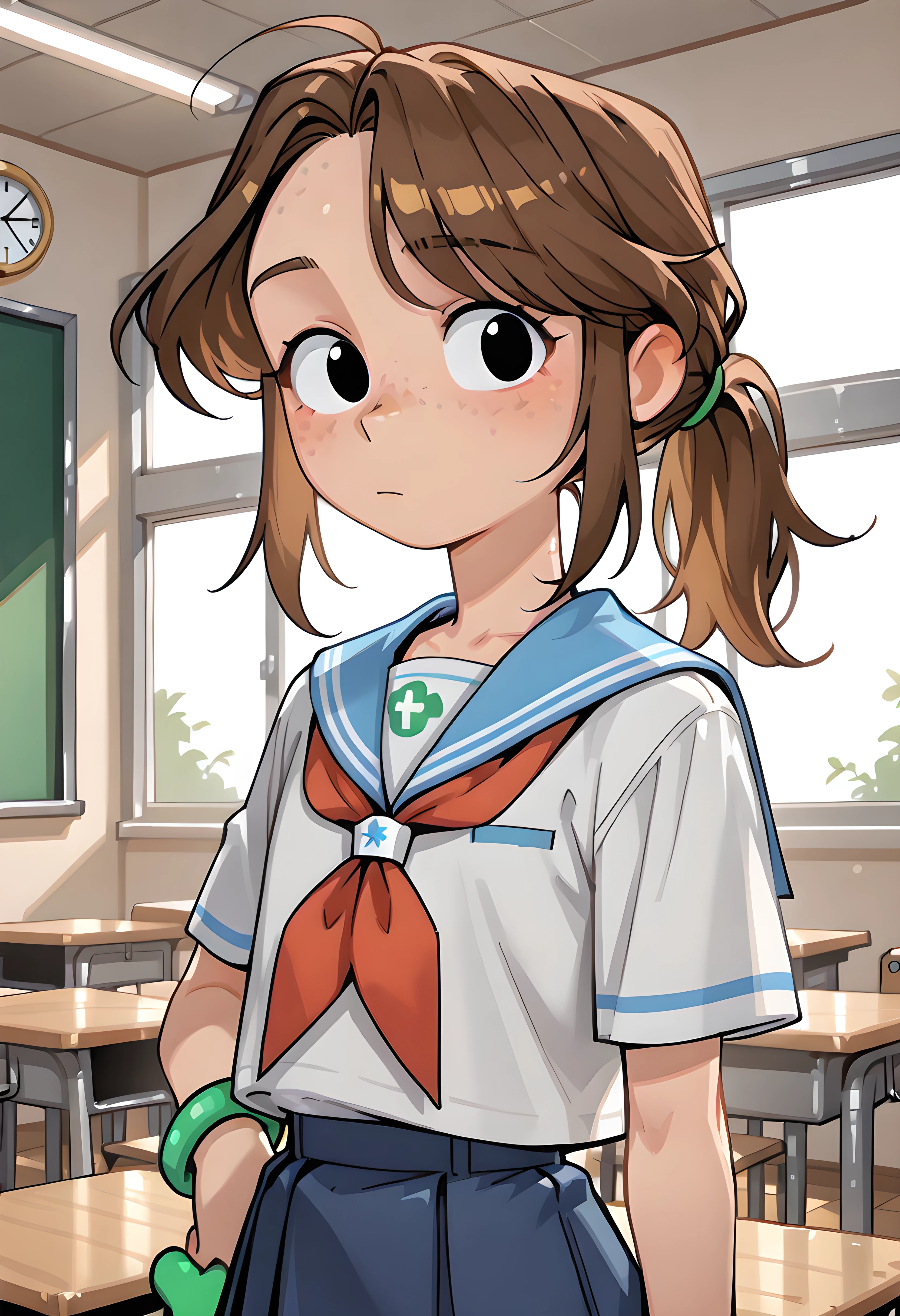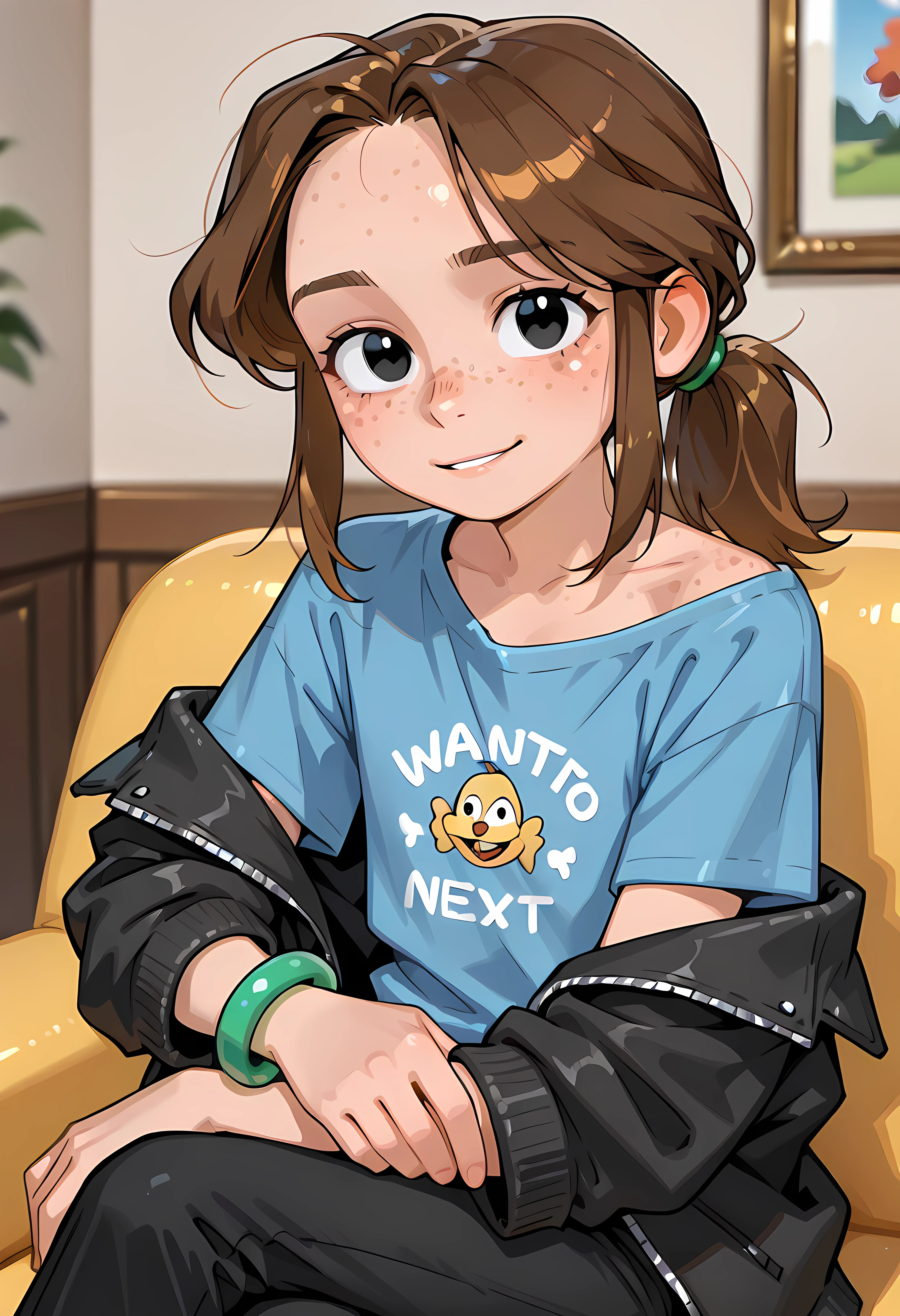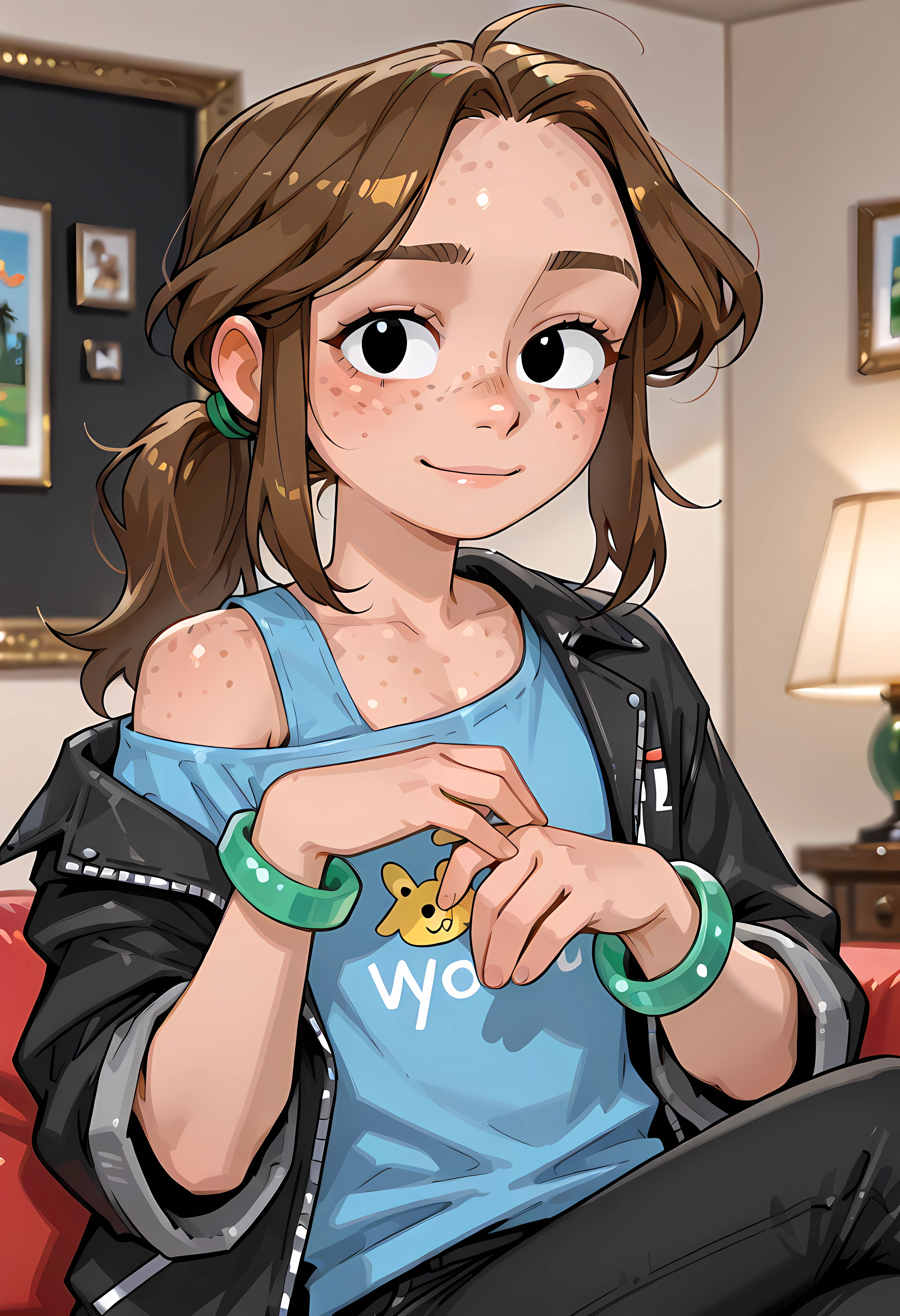 cartoon girl , freckles,brown hair, black pants, pants, turtleneck, ponytail,charlotte,black open jacket, blue shirt,black eyes, green shiny bracelet at right hand,flat chest,green clip,black jacket,