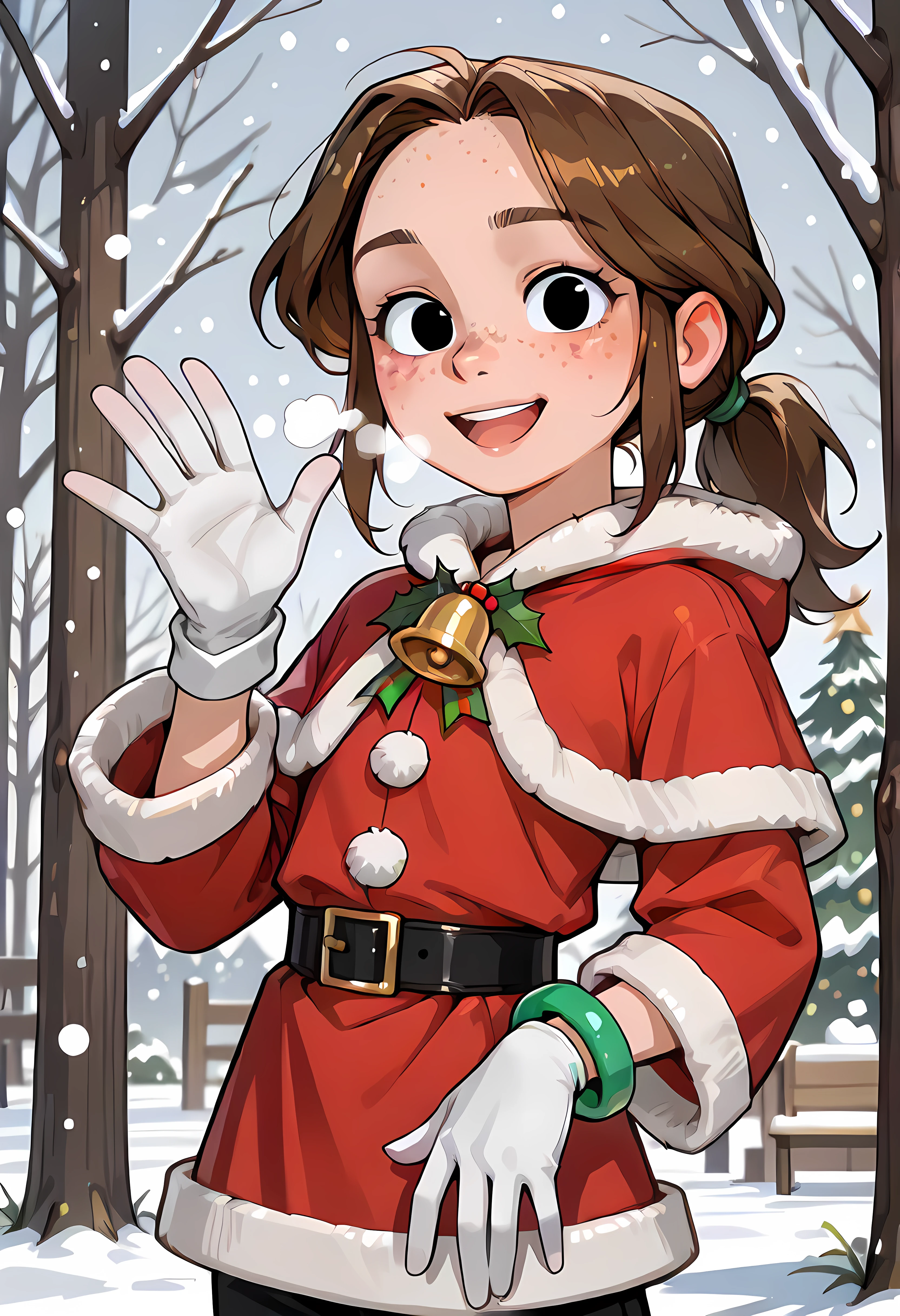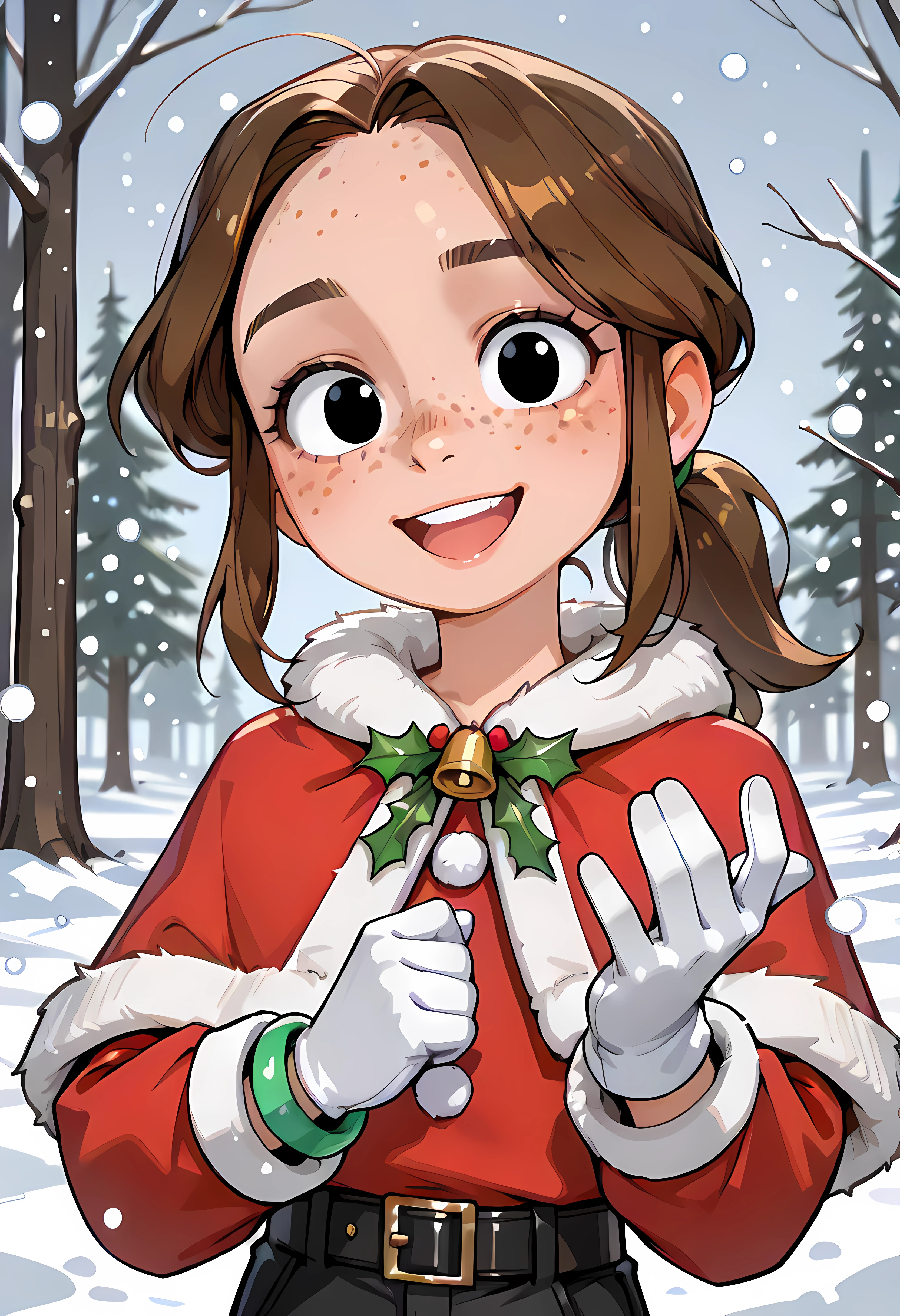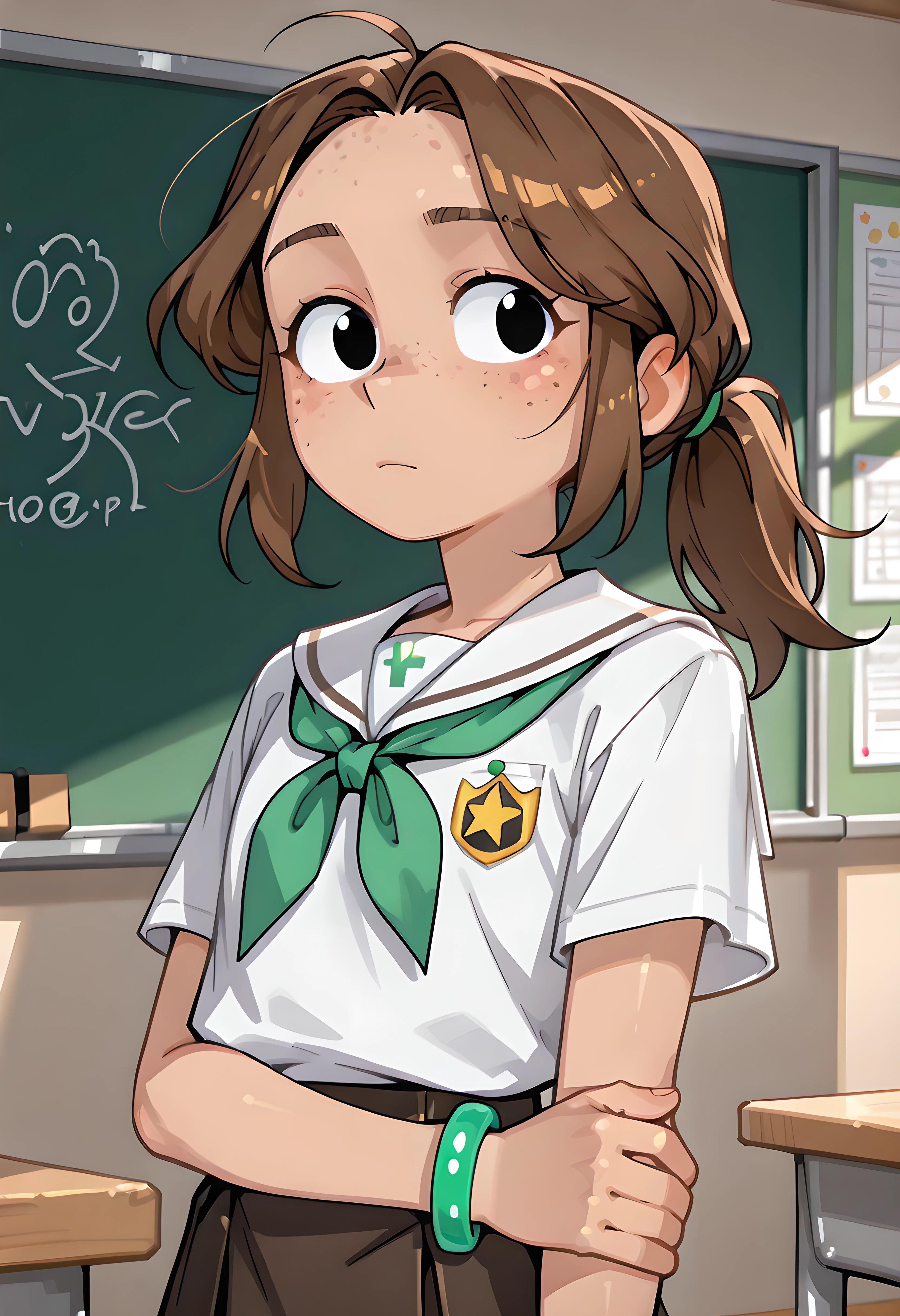 cartoon girl , freckles,brown hair, black pants, pants, turtleneck, ponytail,charlotte,black open jacket, blue shirt,black eyes, green shiny bracelet at right hand,flat chest,green clip,black jacket,