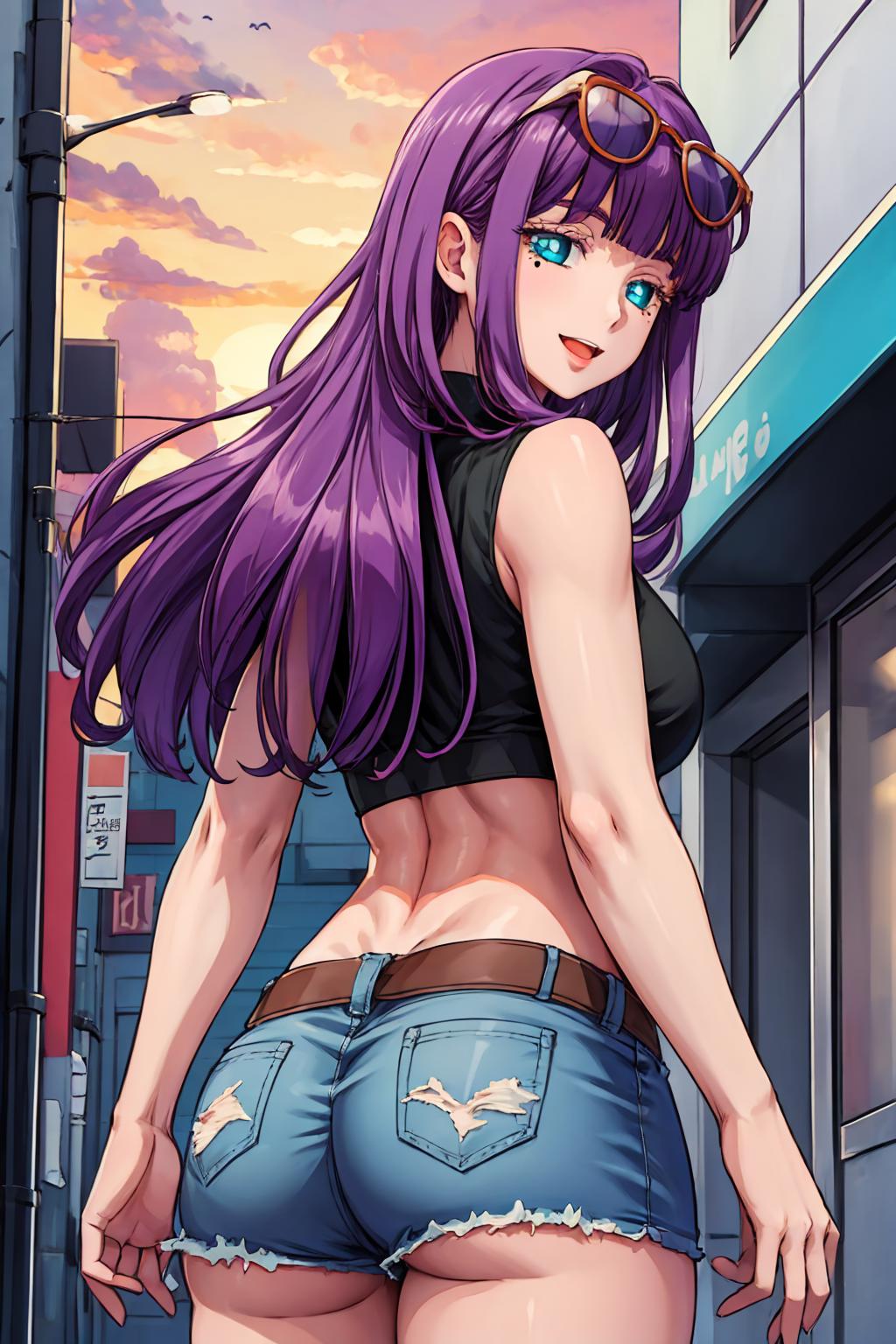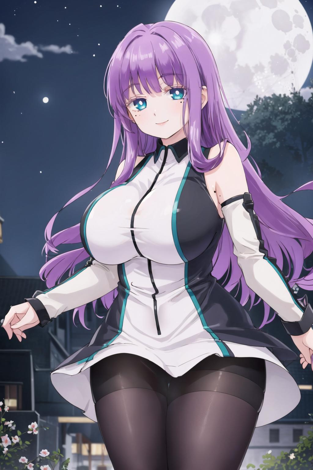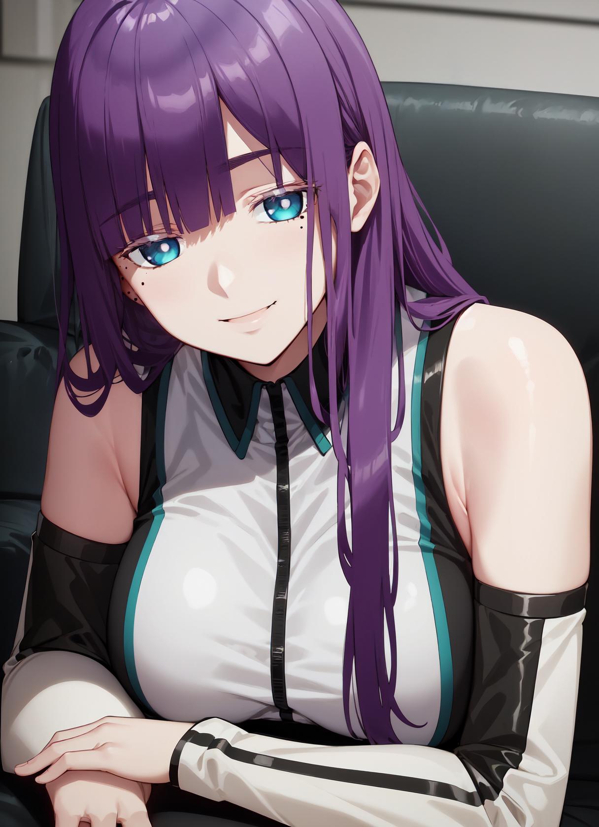 For her basic physical features: purple hair, blue eyes, mole, white eyelashes, large breasts (if the originals aren't enough for you).