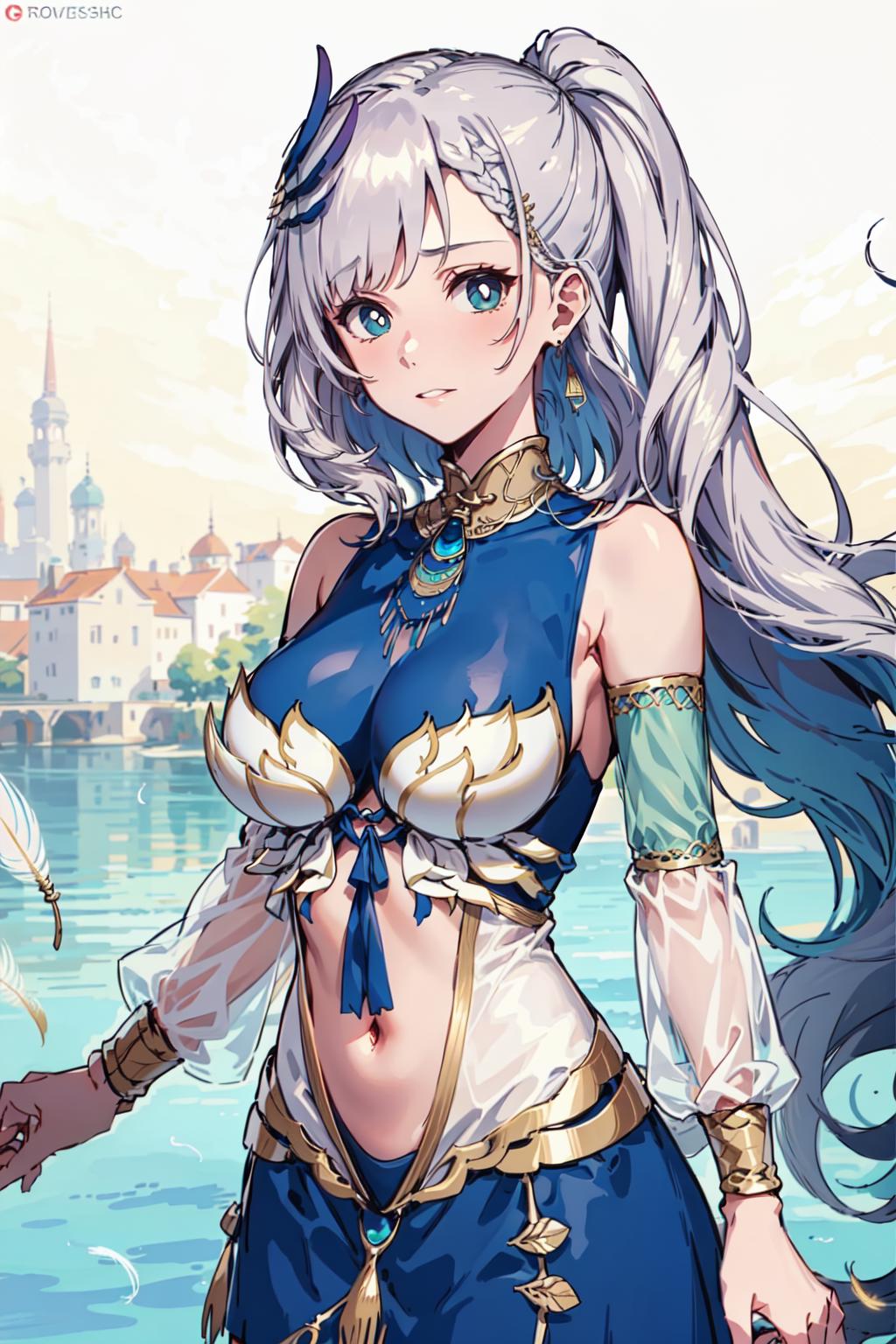 For her main costume use: braided bangs, thighhighs, stomach cutout, jewelry, feather hair ornament, navel, feathers, hair ornament, detached sleeves, long hair, earrings, grey hair, side ponytail, dress