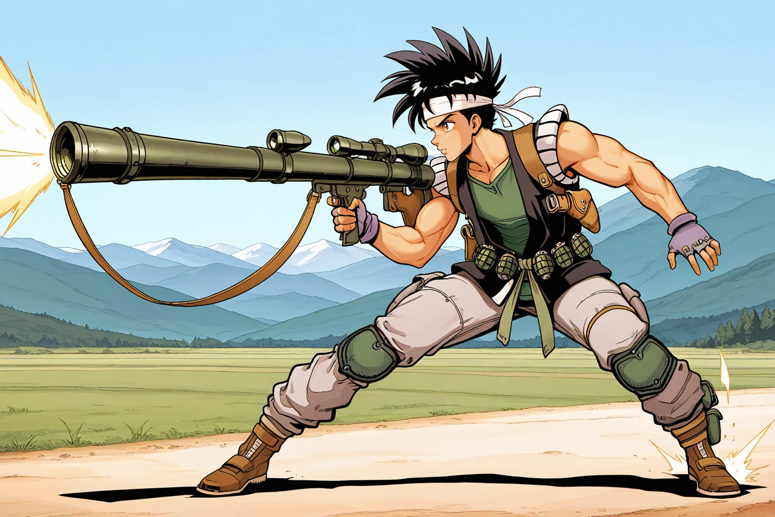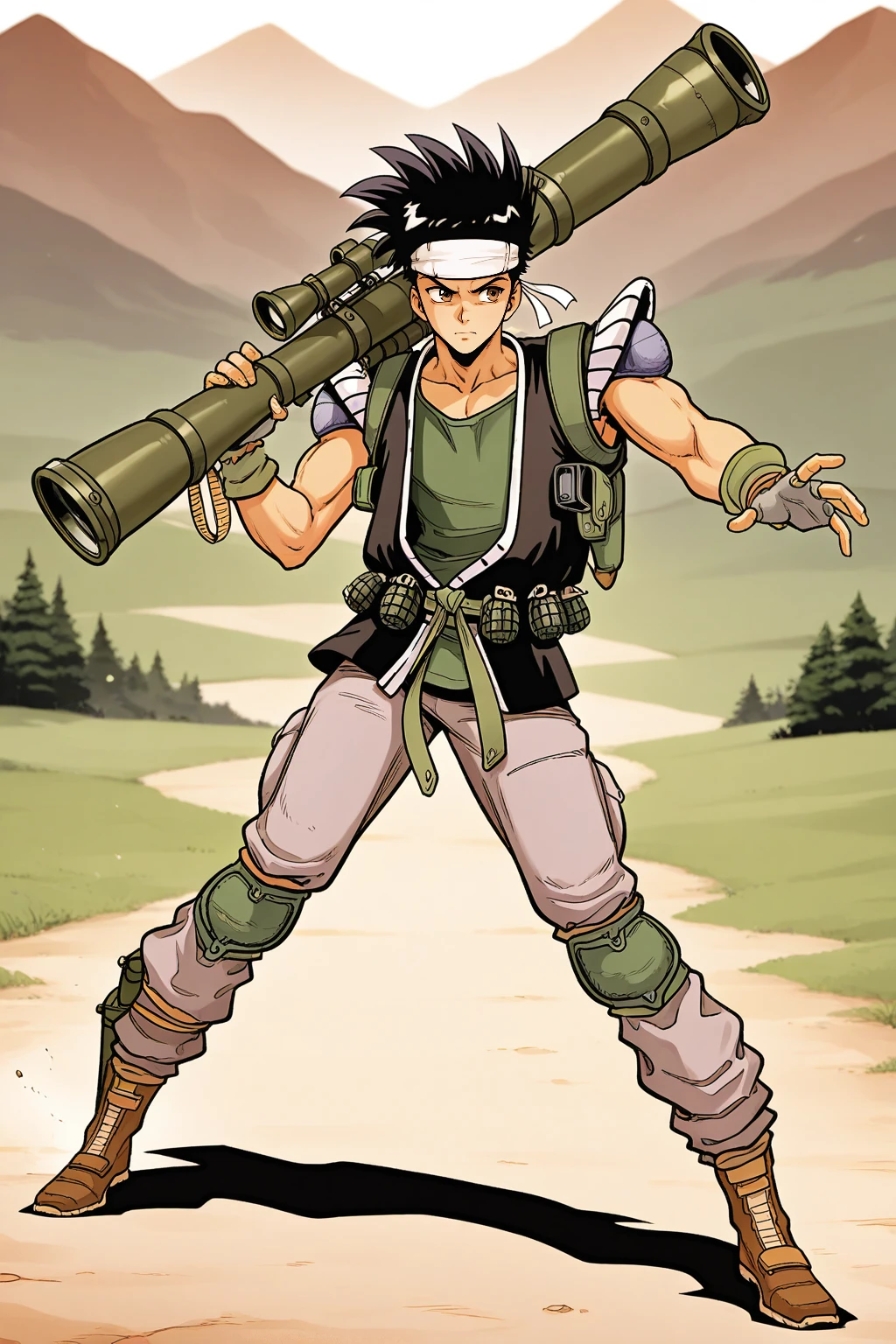 1boy, male focus, toned male, black hair, spiked hair, white headband, brown eyes, black sleeveless jacket, holster, small white shoulder pads, green shirt, green sleeves, grenade belt, pouches, grey fingerless gloves, grey pants, green knee pads, brown boots
