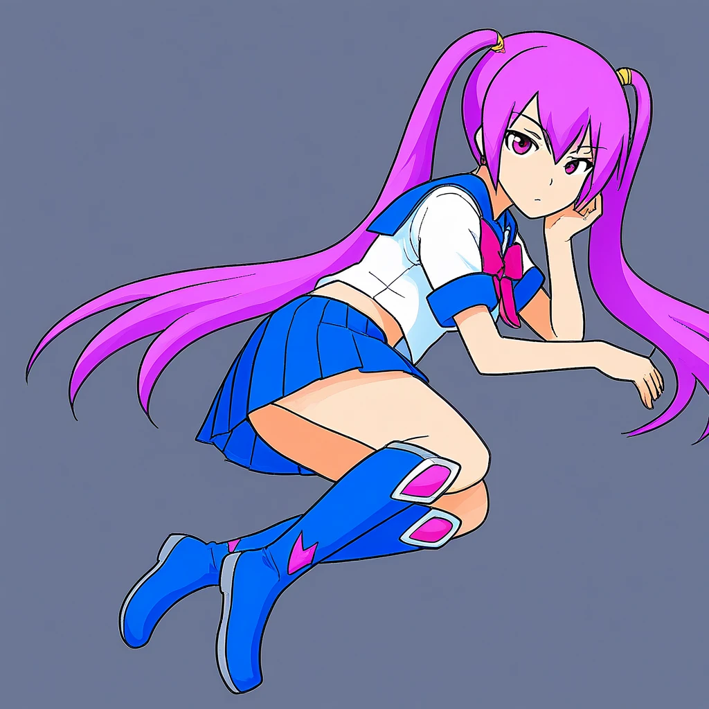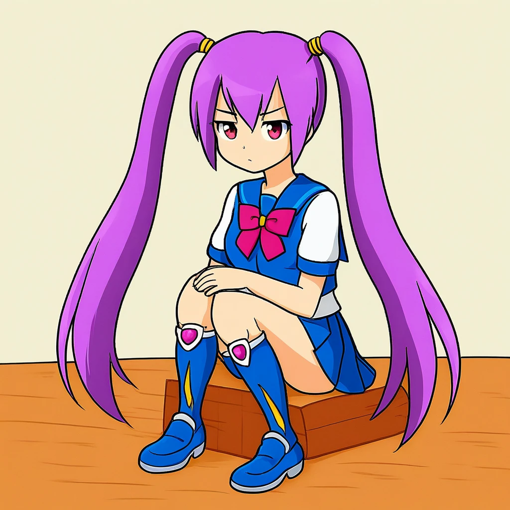 1girl,solo,purple hair,twintails,long hair,school uniform,knee boots,