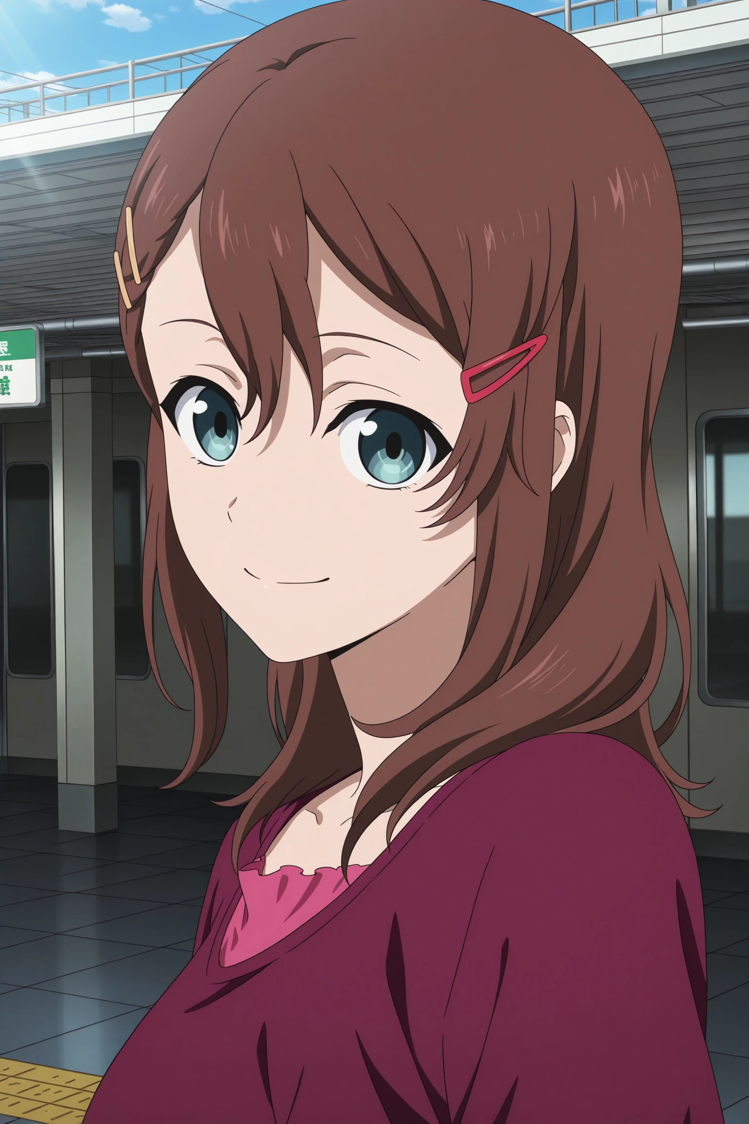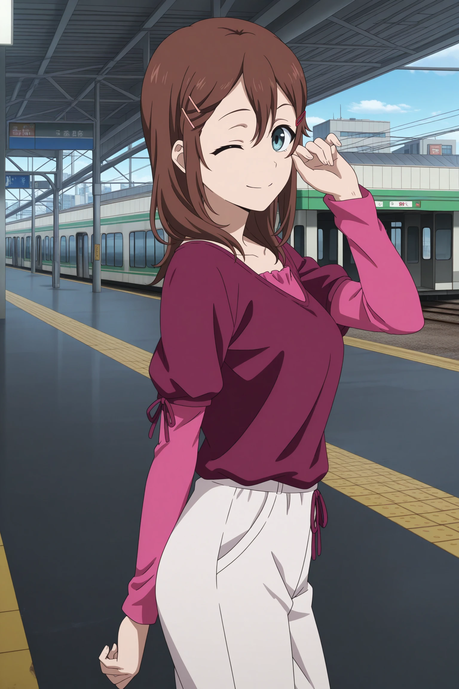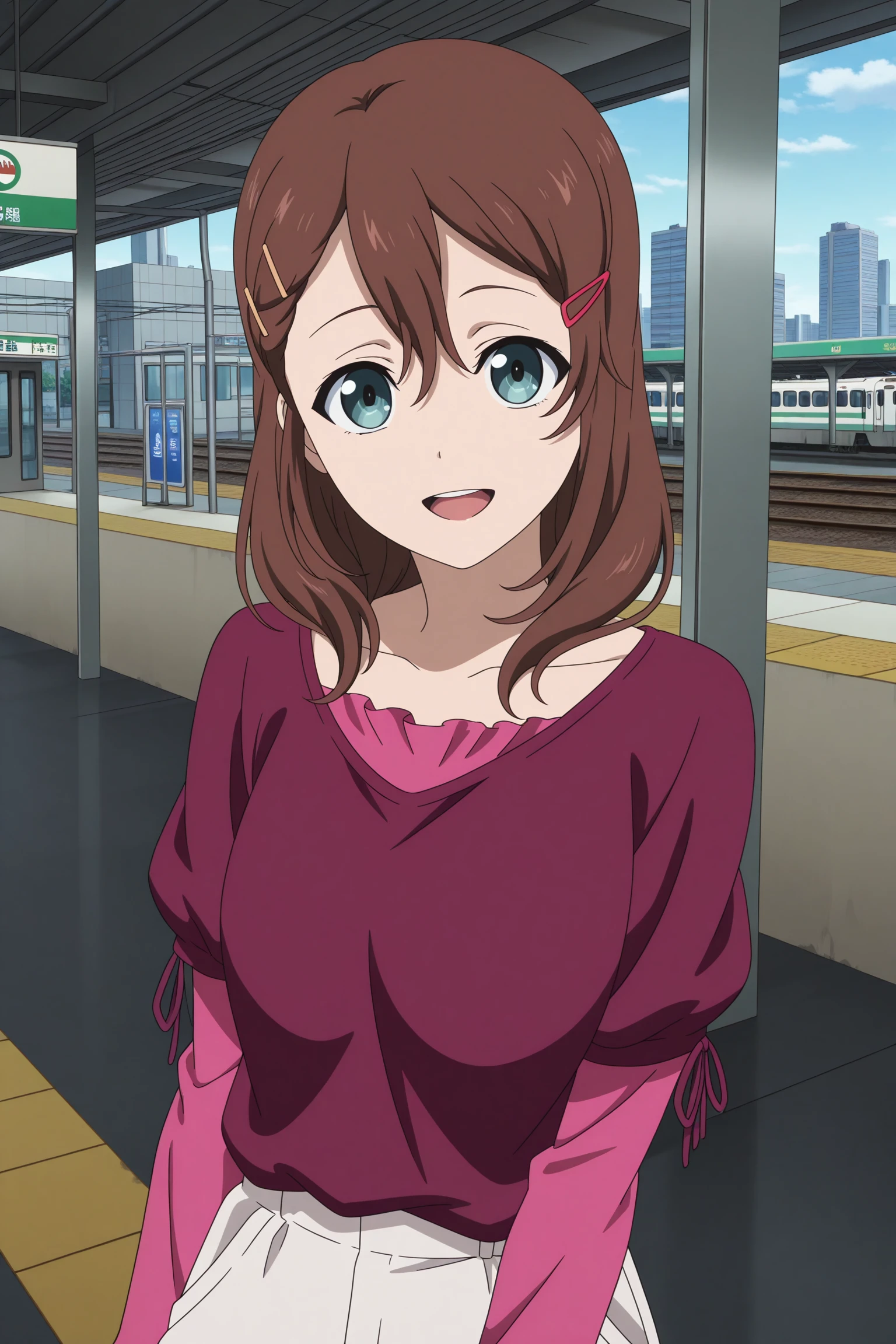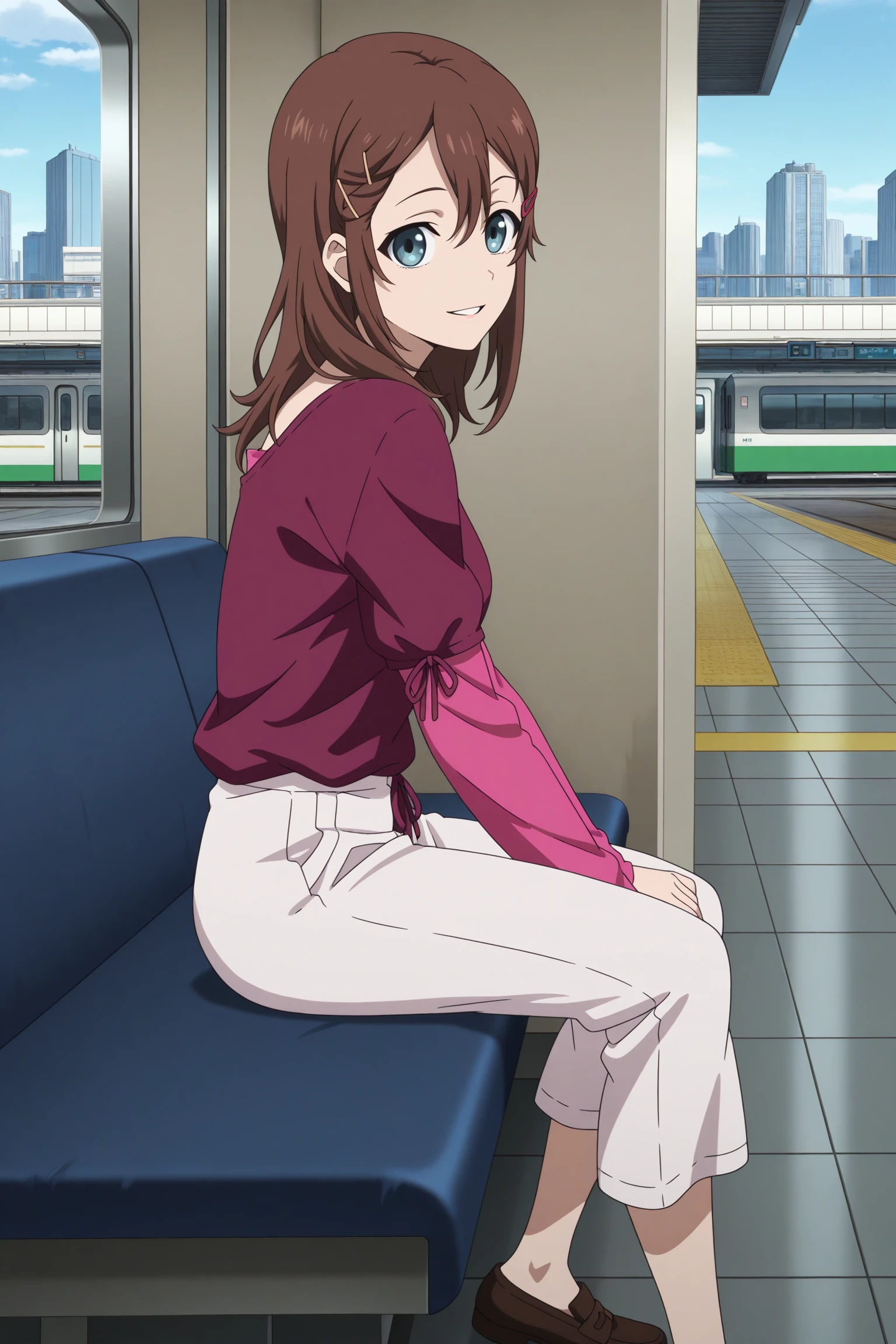 miyamori kaori, medium hair, brown hair, hair pin, hairclip, hair between eyes, blue eyes, short over long sleeves, purple shirt, pink shirt, white pants, capri pants, brown footwear, loafers