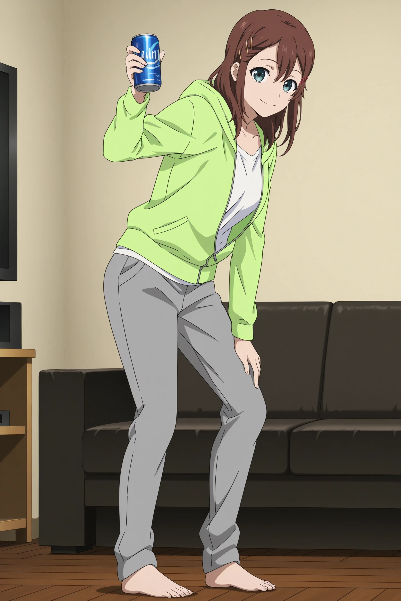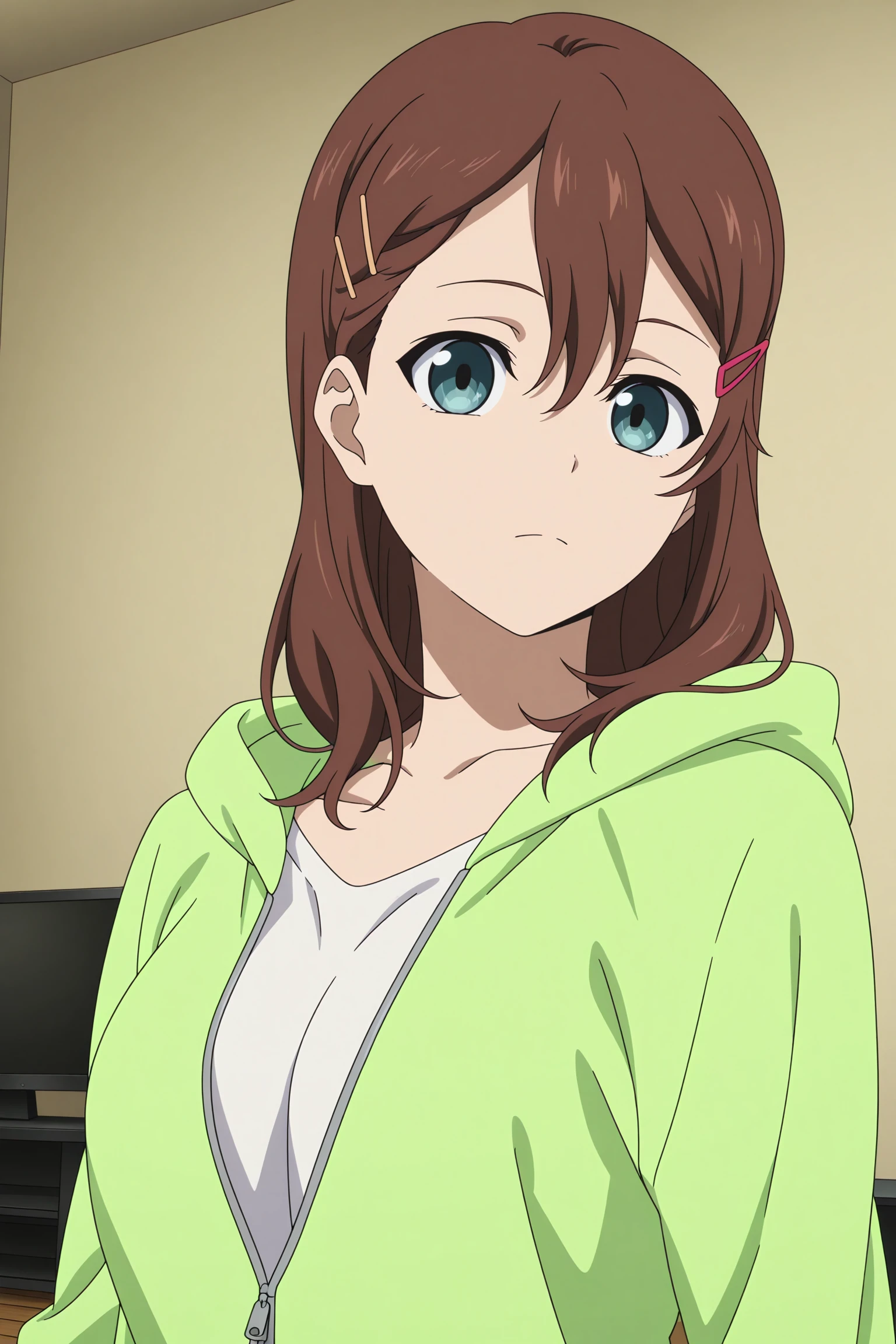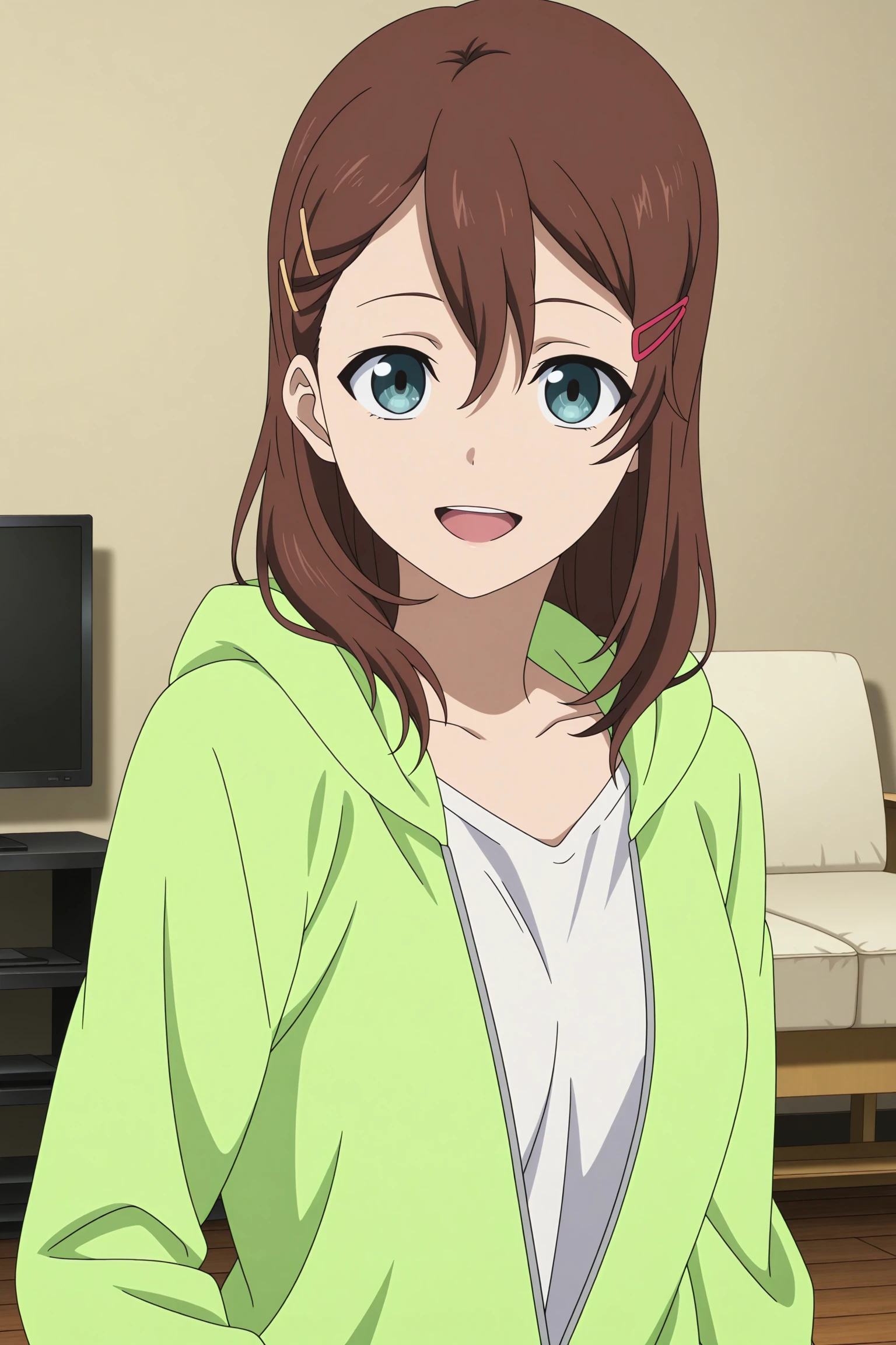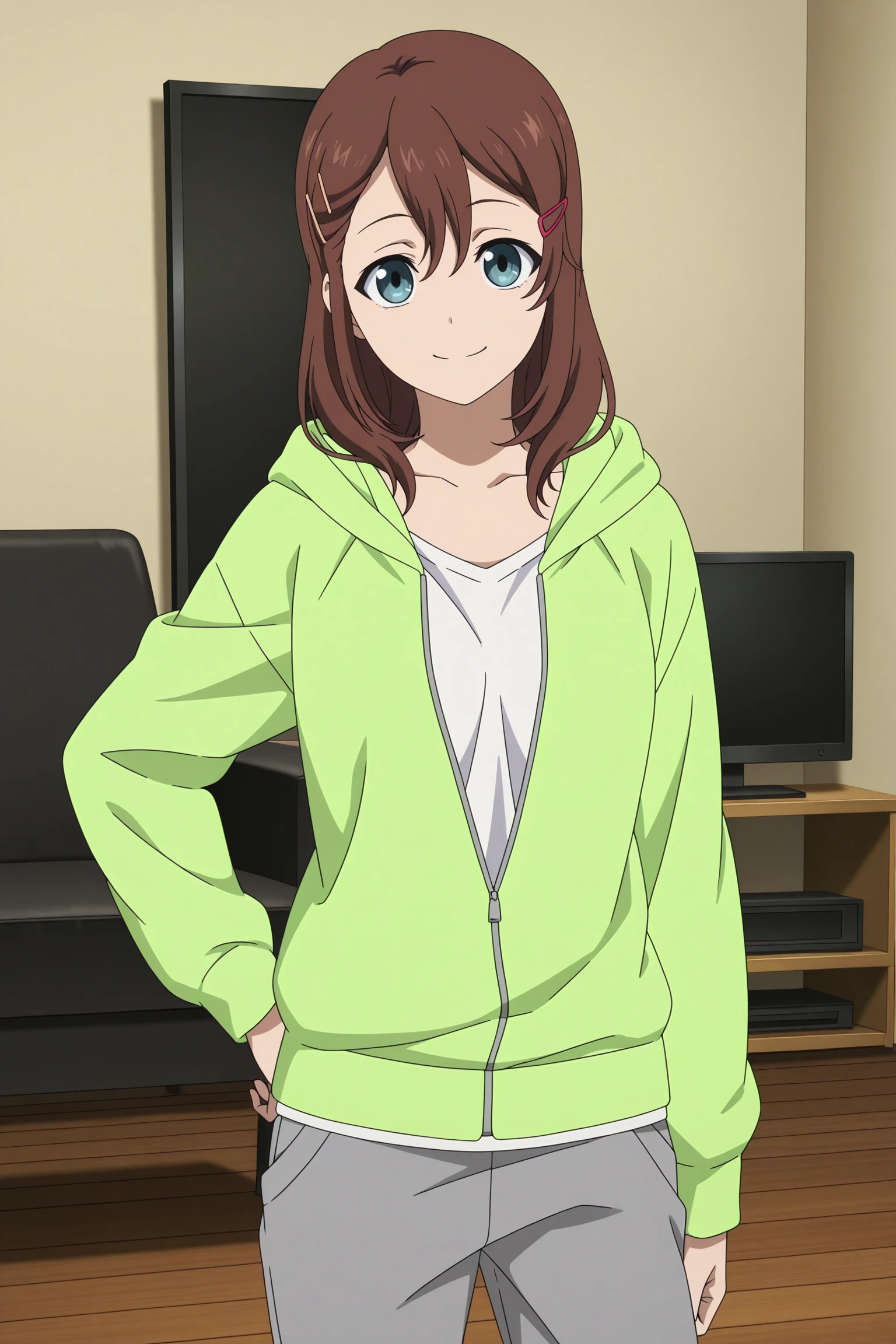 miyamori kaori, medium hair, brown hair, hair pin, hairclip, hair between eyes, blue eyes, long sleeves, green jacket, hooded jacket, partially unzipped, white shirt, grey pant