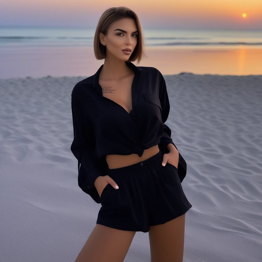 It depicts a woman a the beach in the evening wearing a satin shirt and shorts. Compatible with all SDXL models.