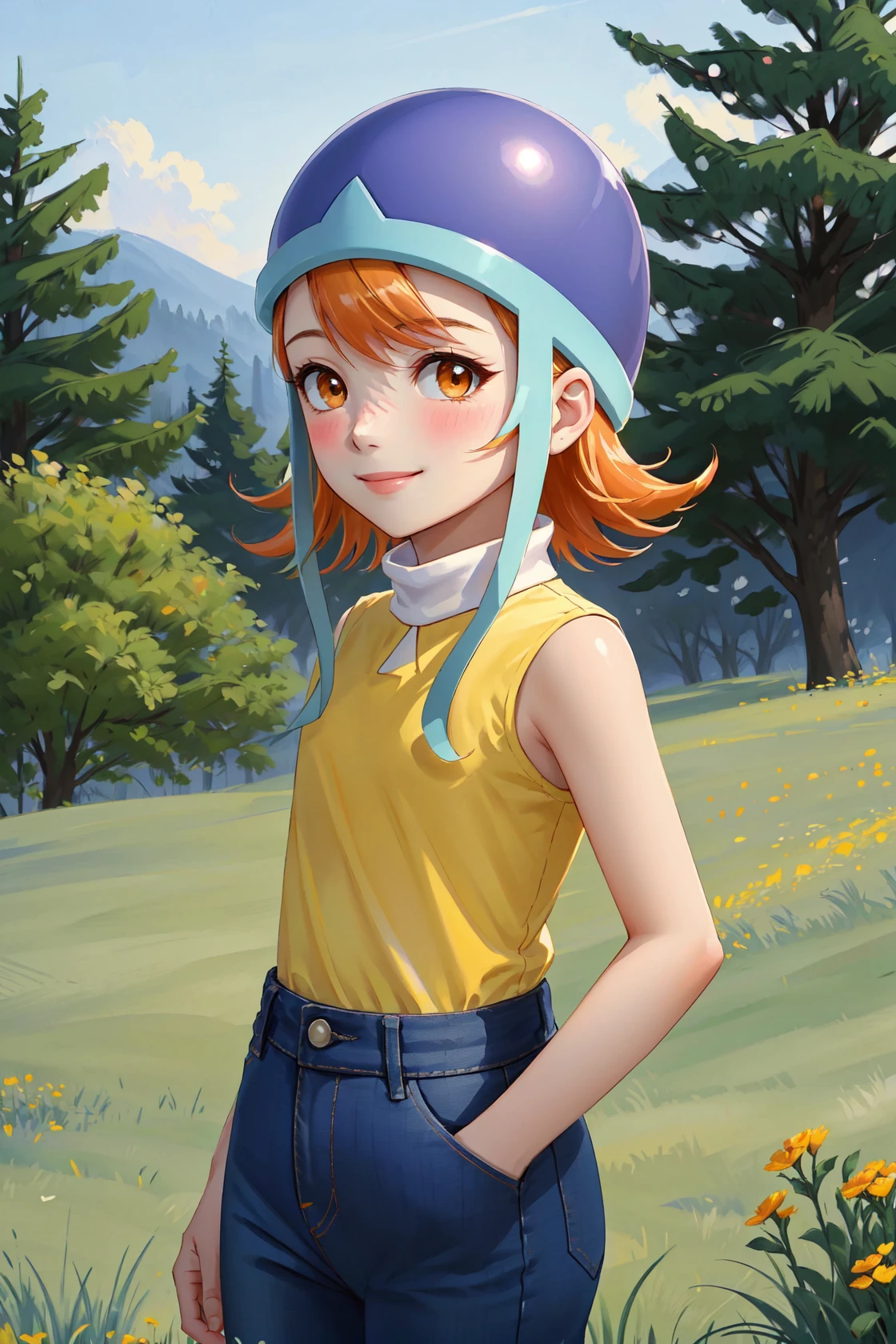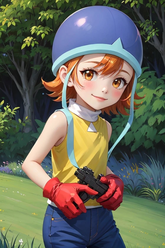 blush, smile, short hair, orange hair, helmet, orange eyes, digimon,