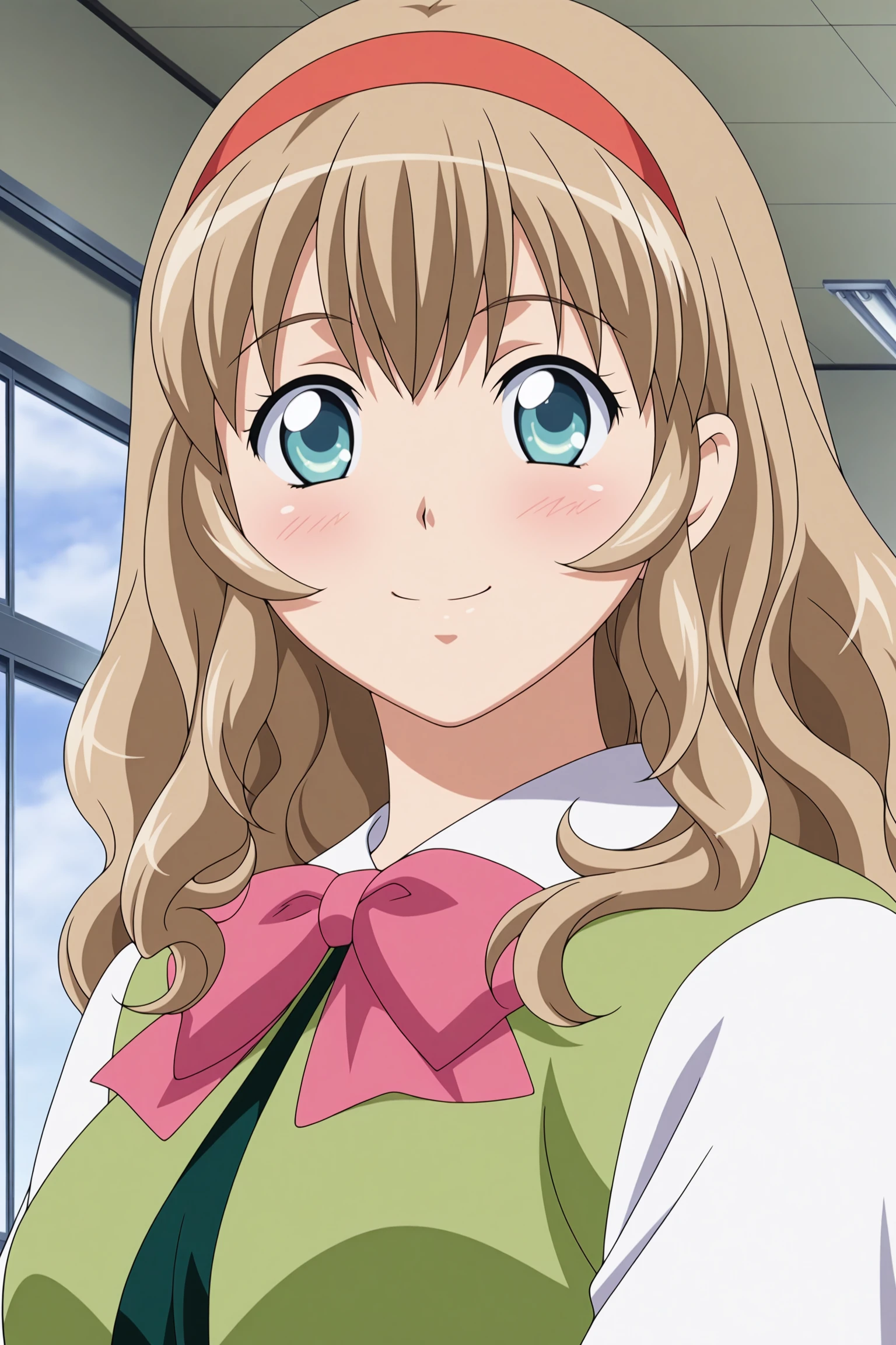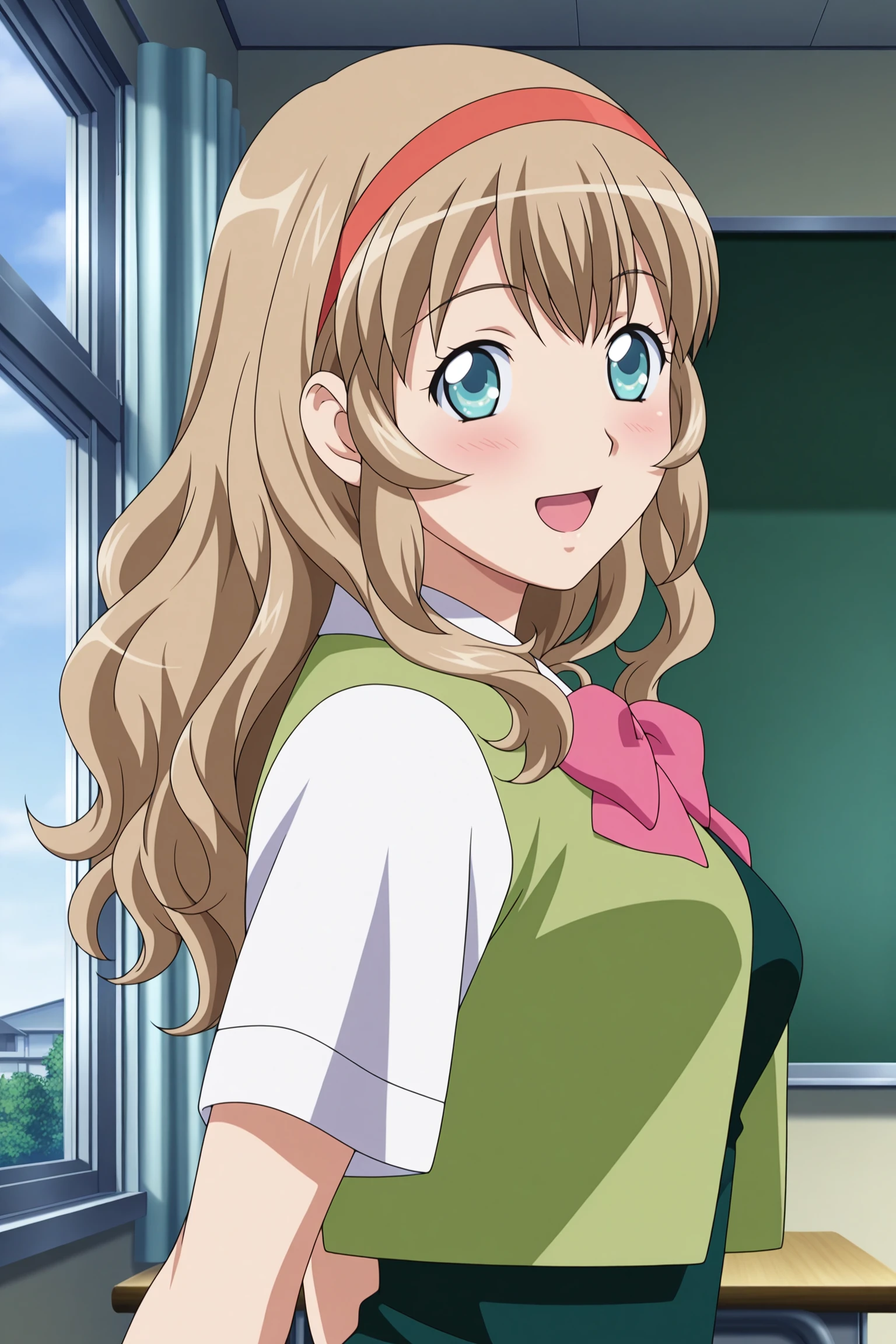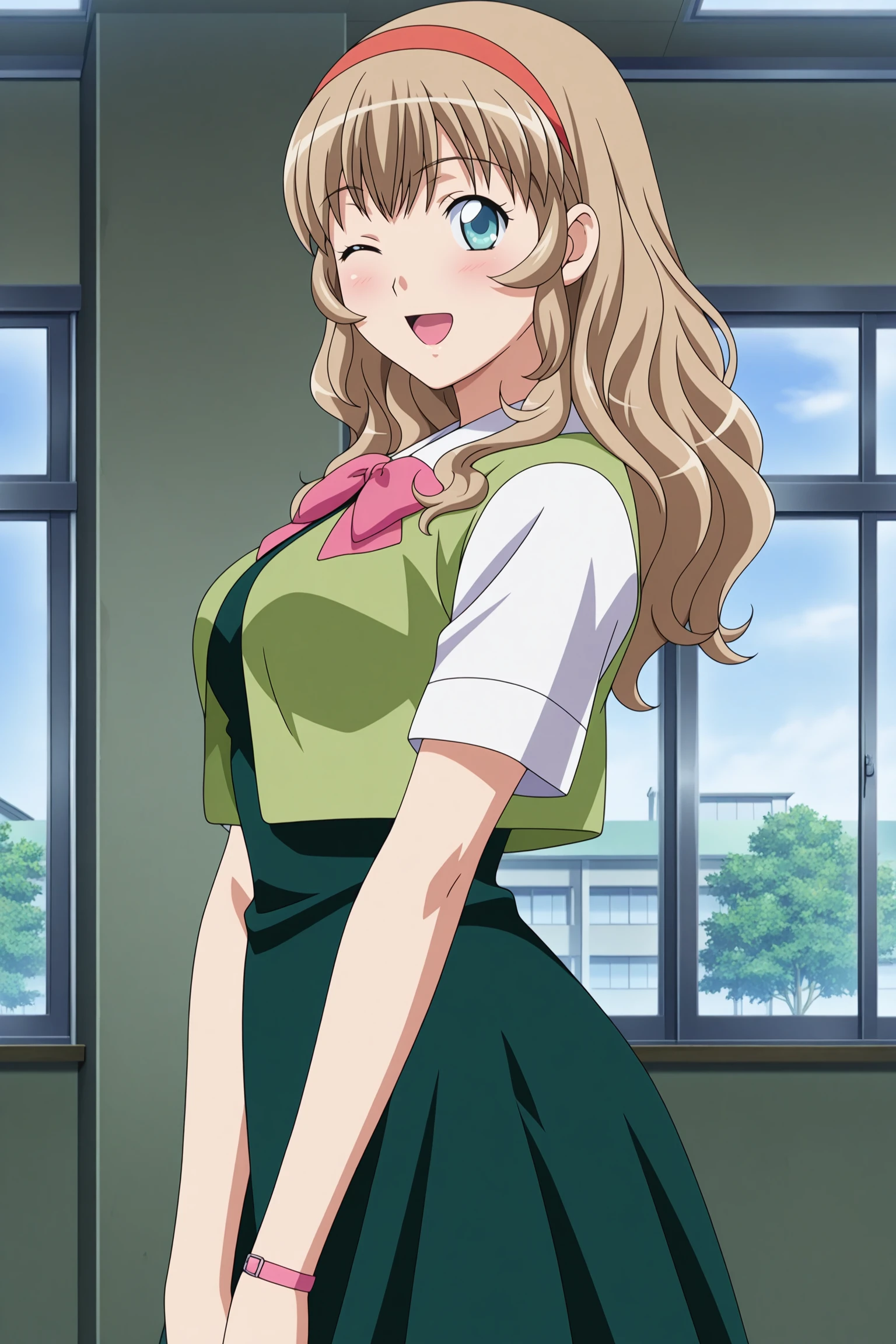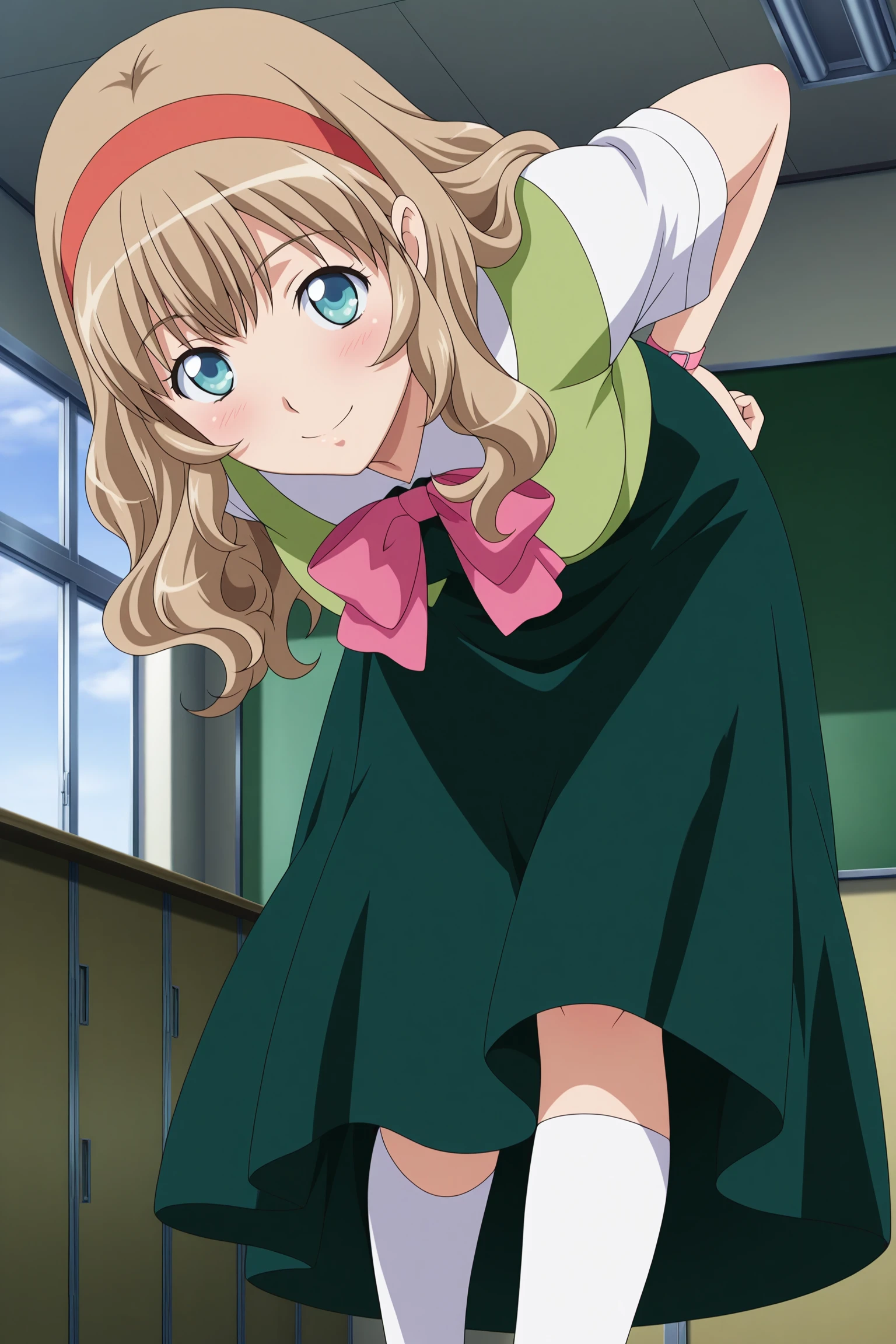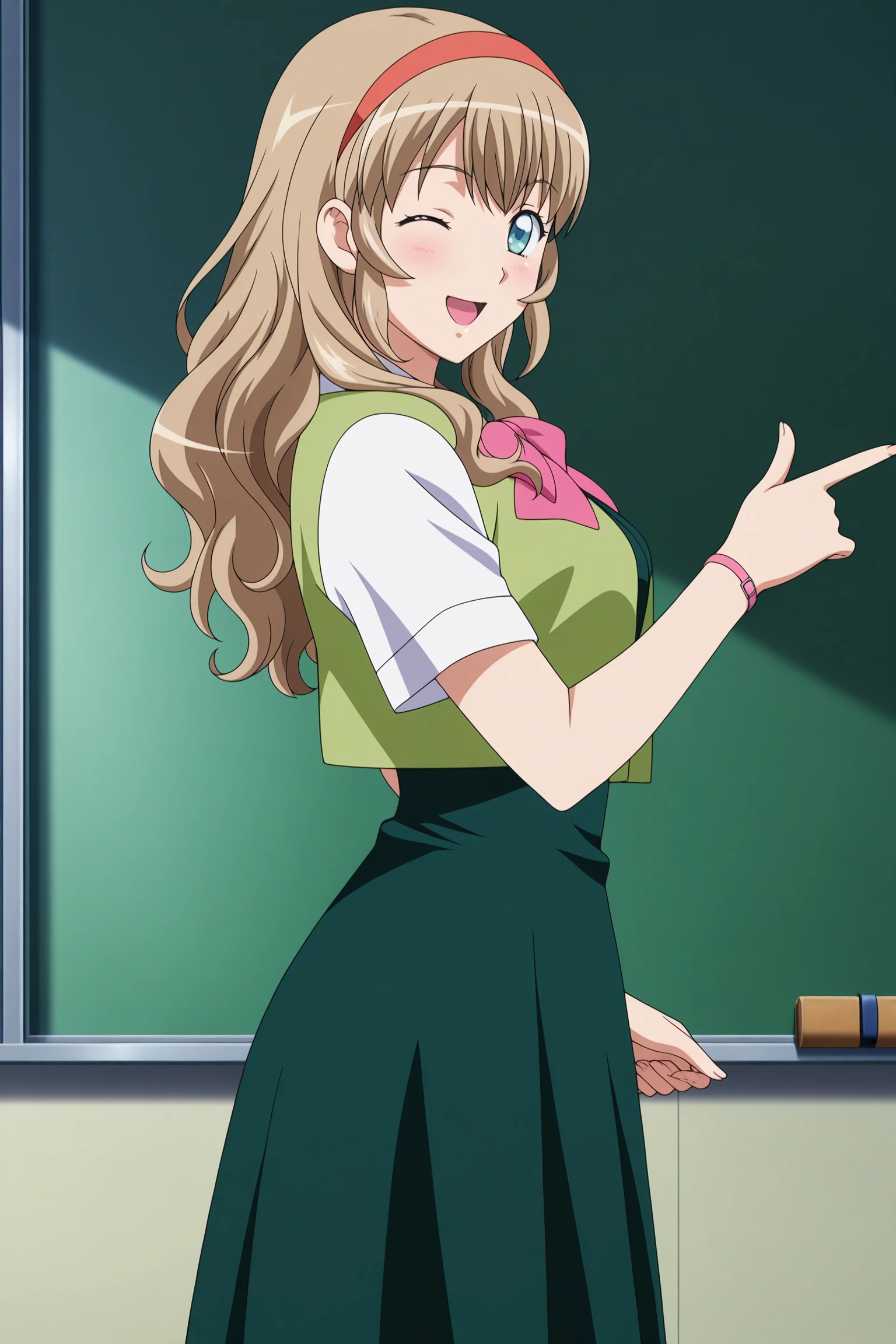 sonken chuubou, long hair, brown hair, wavy hair, hairband, sidelocks, aqua eyes, wristband, short sleeves, green dress, long dress, white sleeves, green vest, pink bowtie, white socks, kneehighs, black footwear, mary janesDescription