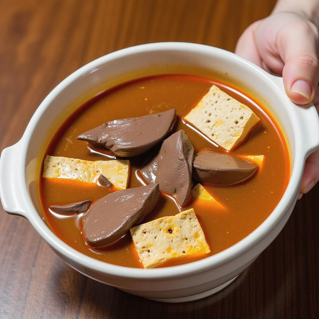 Mala Duck Blood is a Taiwanese street food made with soft, velvety tofu cubes that are simmered in a spicy and flavorful broth. The broth is made with a variety of chili peppers, Sichuan peppercorns, ginger, and garlic, and it is typically served with noodles or rice.