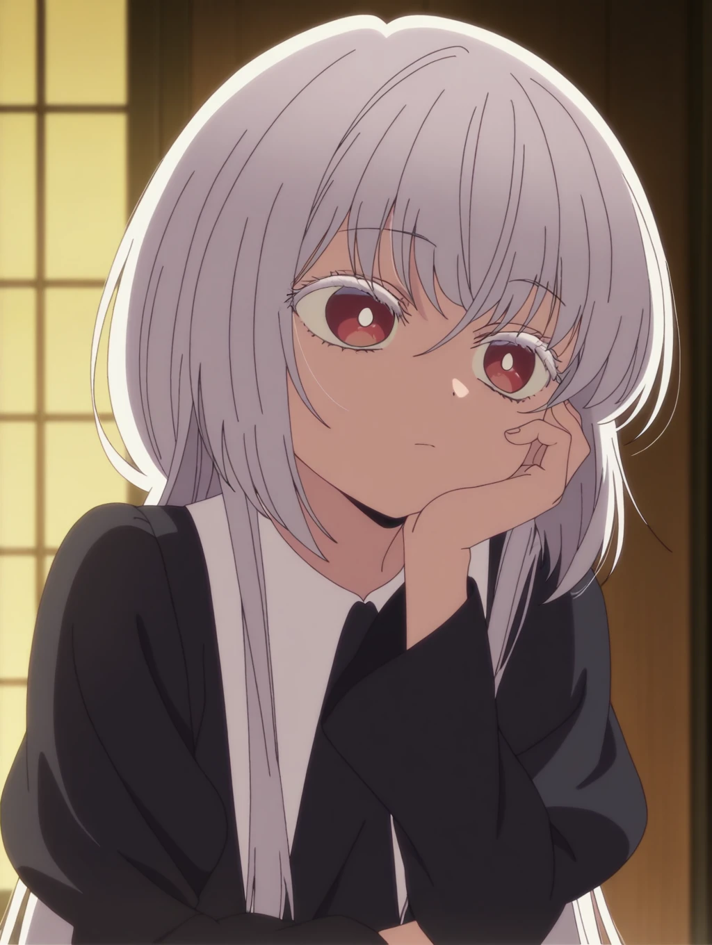 ONK_Tsukuyomi, 1girl, red eyes, white pupils, white hair, long hair, side locks, bangs, white eyelashes, anime screencap, official style