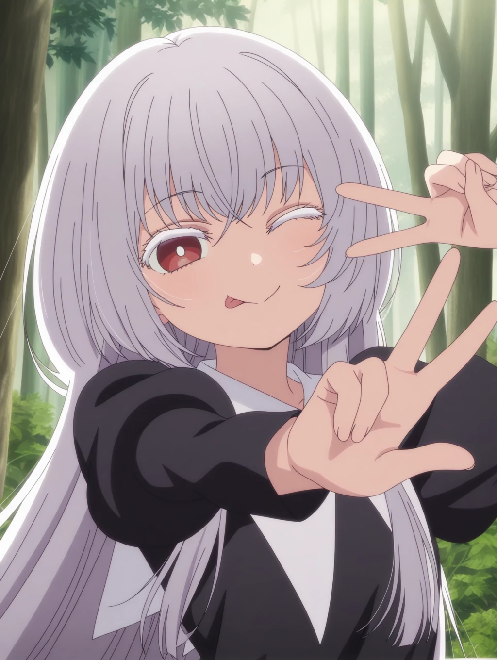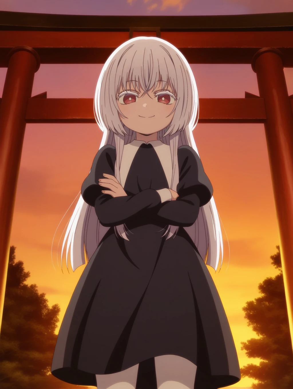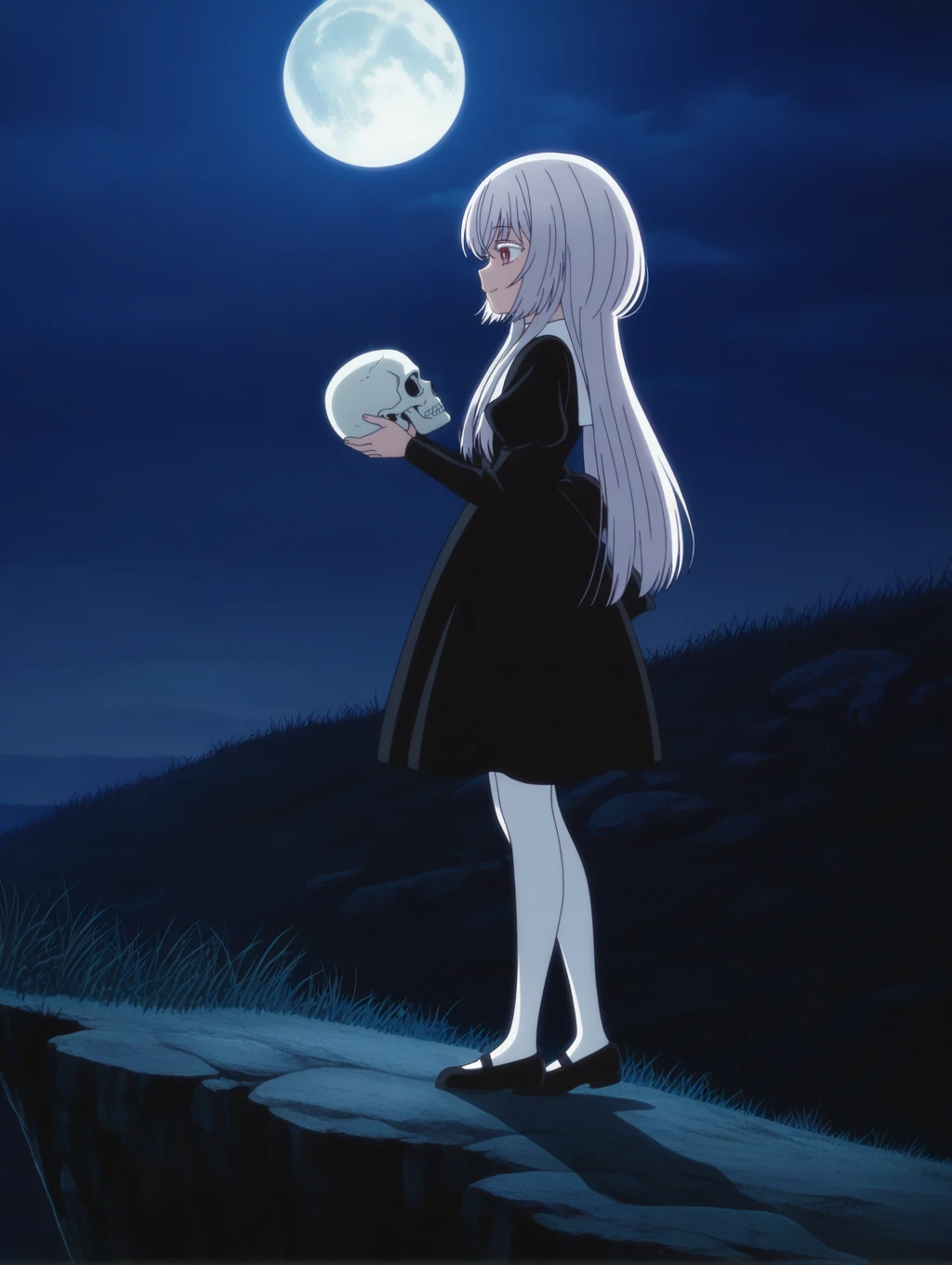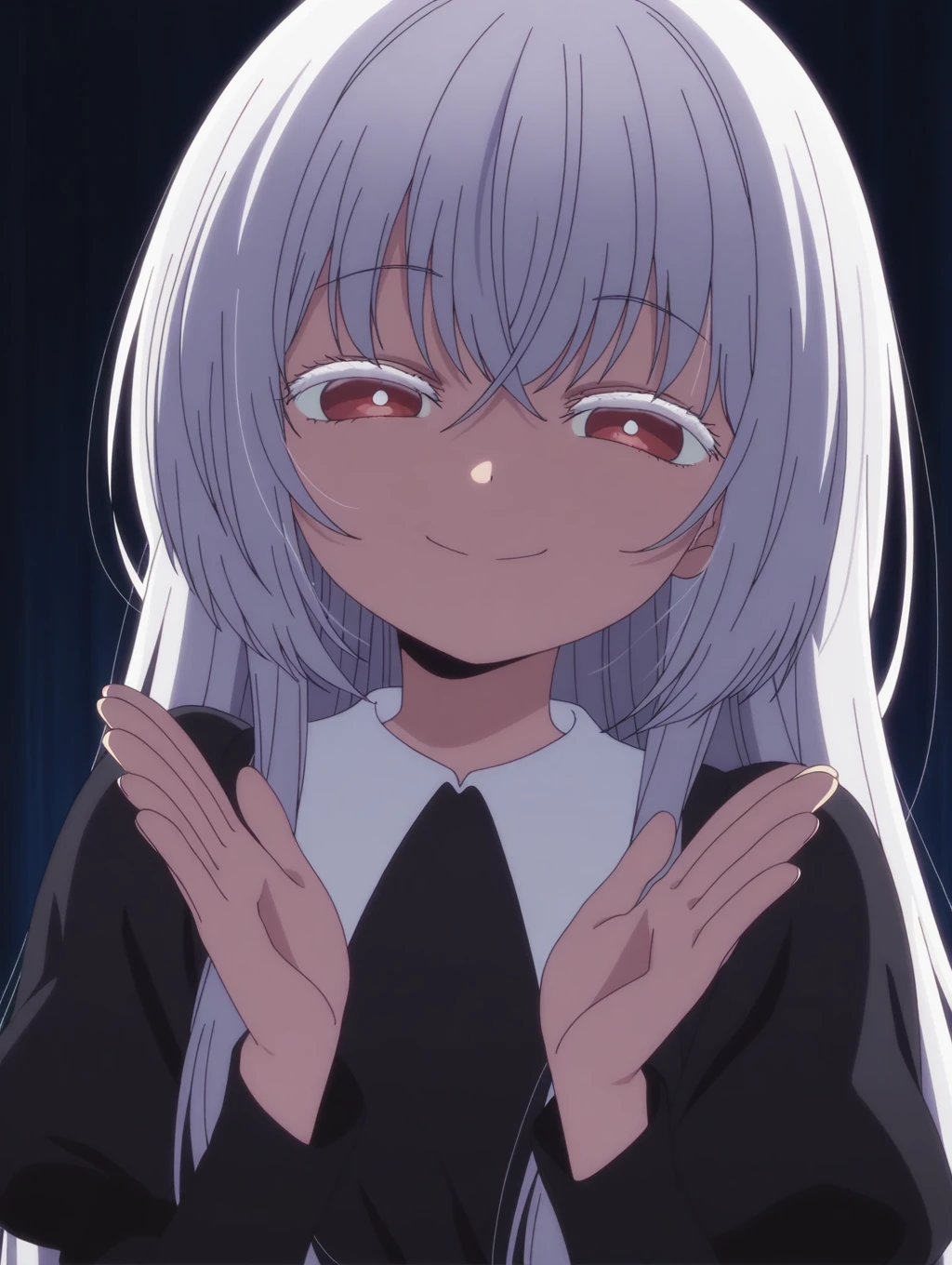red eyes, white pupils, white hair, long hair, side locks, bangs, white eyelashes, anime screencap, official style