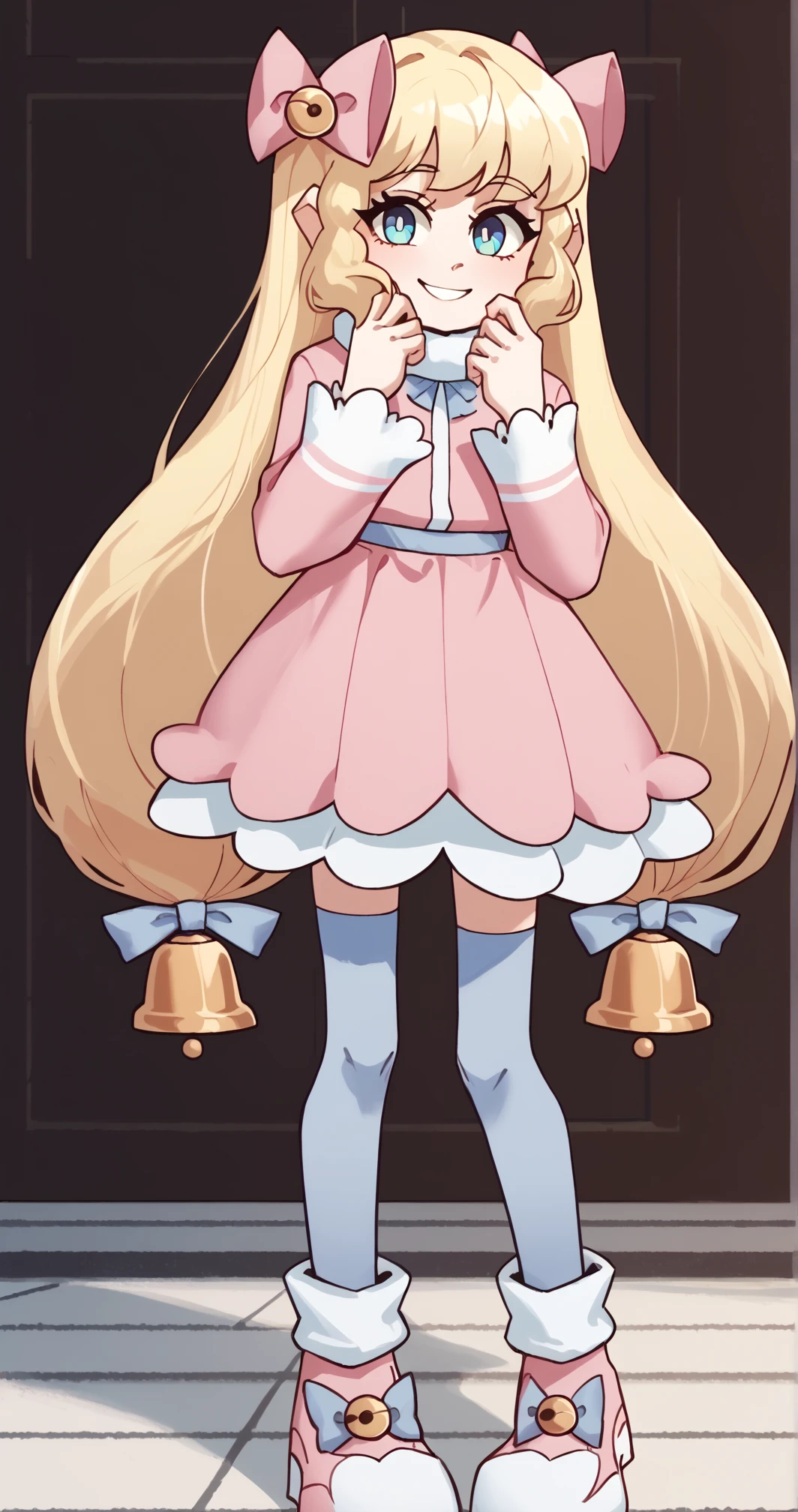 Normal Phoenica, bell, hair bell, long sleeves, pink bow, blue bow, hair ornament, socks, blue thighhighs, pink footwear, pink dress