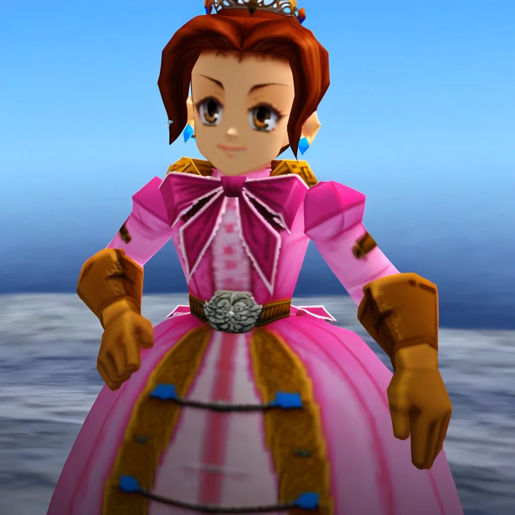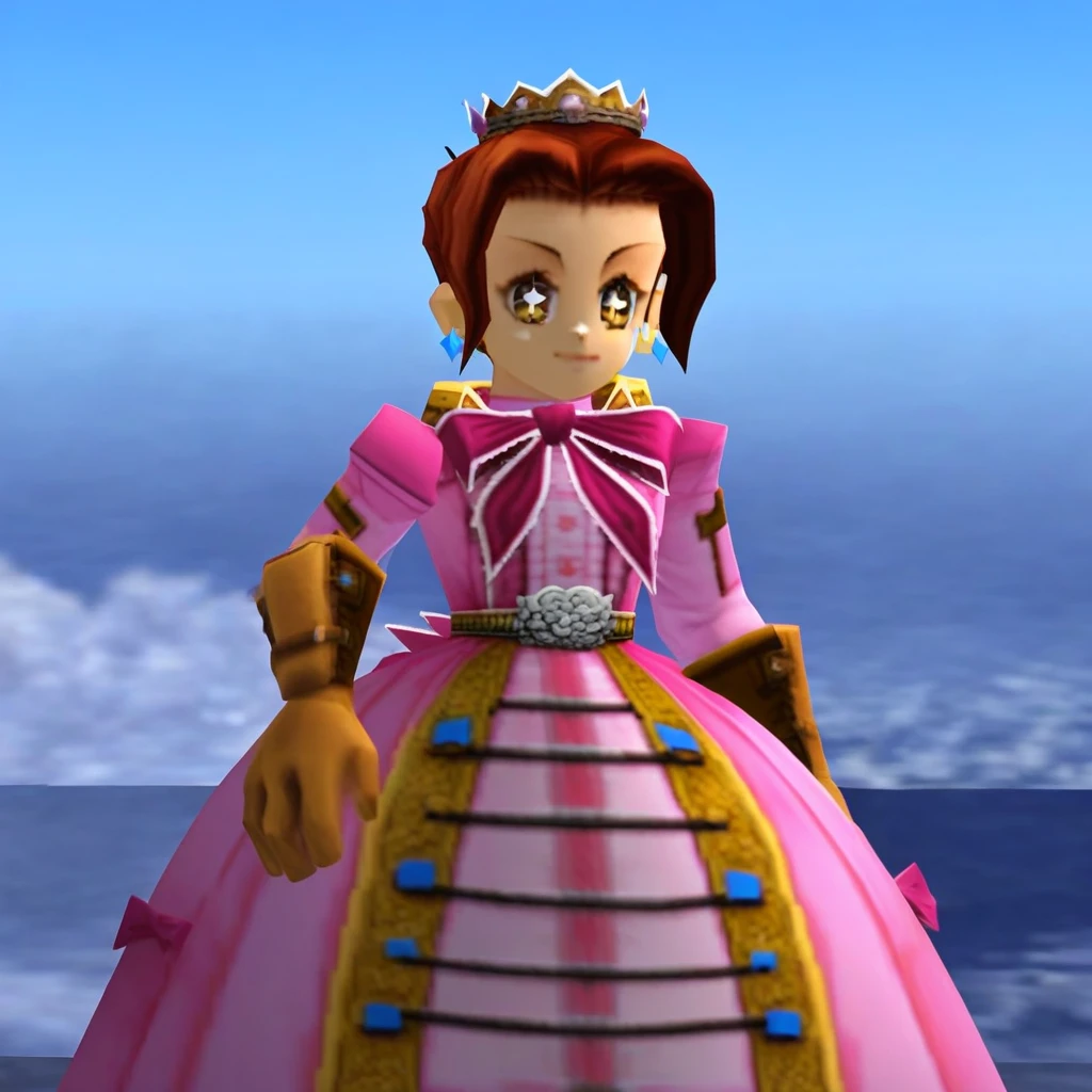 1girl,cute face,dress,solo,gloves,brown hair,earrings ,Starry eyes,pink dress,jewelry,brown eyes, crown,blue buttons,