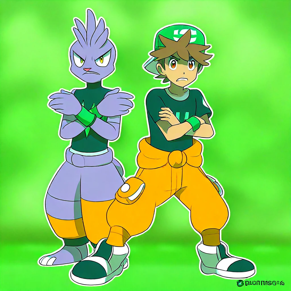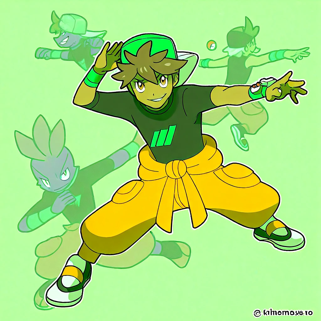 1boy, male focus, jax, unbound, companion, brown hair, brown eyes, green cap, 1boy, male focus, brown hair, hat, smile, baseball cap, shoes, brown eyes, wristband, spiked hair, shirt, white background, clothes around waist, short hair, closed mouth, standing, bangs, multiple views, full body, simple background, pants, black shirt, orange pants, sleeveless, tank top, looking at viewer, open mouth