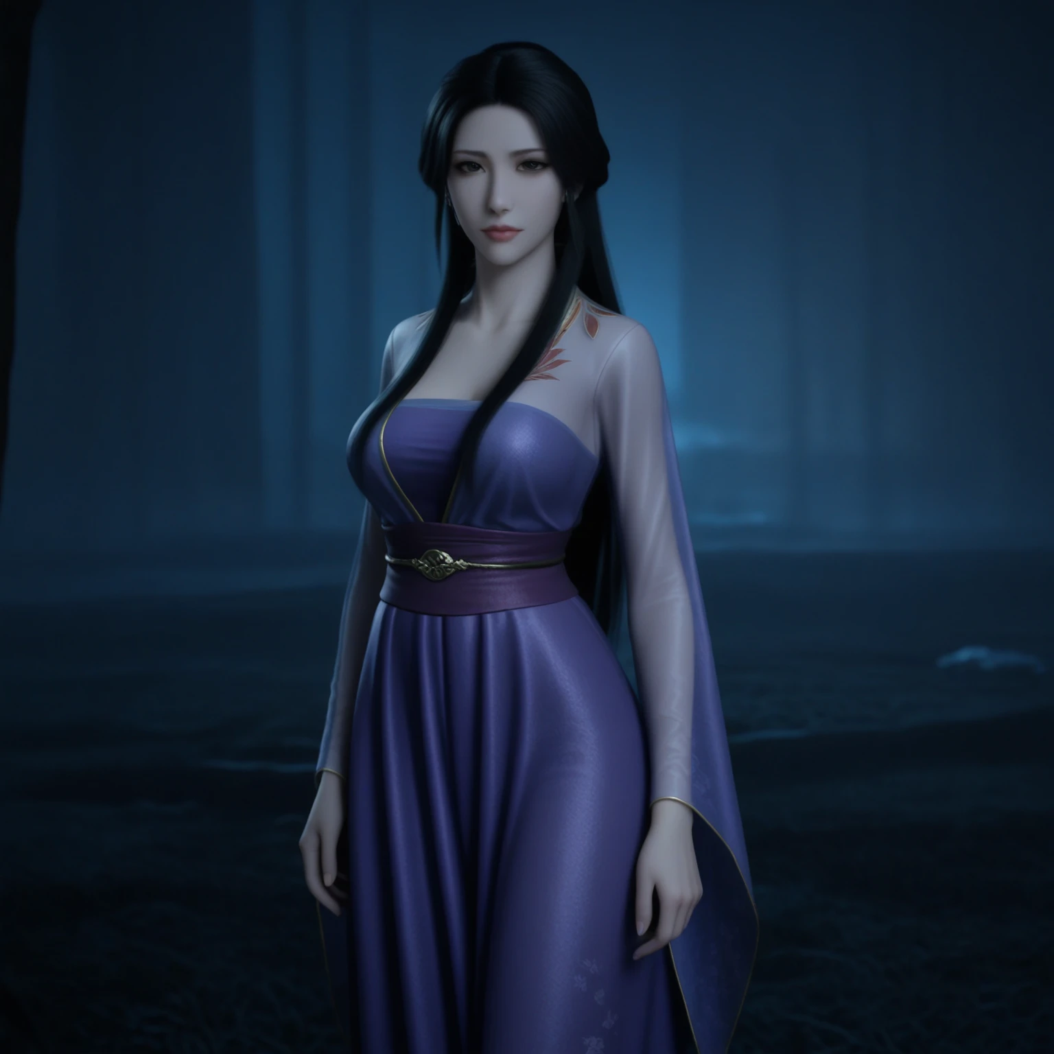 nangongwan, 1girl, solo, black hair, long hair, brown eyes, chinese clothes, dress, purple dress, hanfu, long sleeves, see-through, earrings, floral print, hair ornament, jewelry,