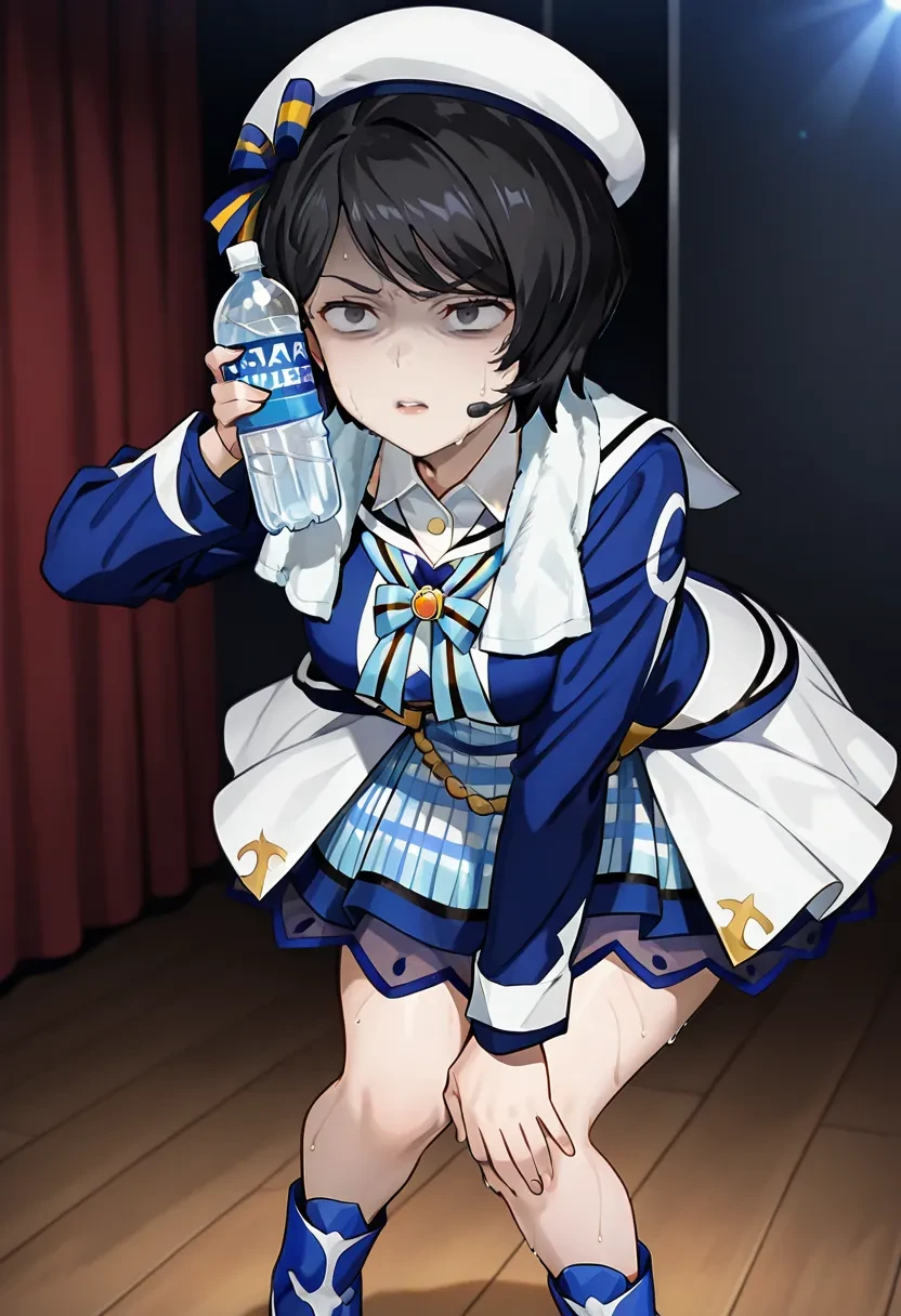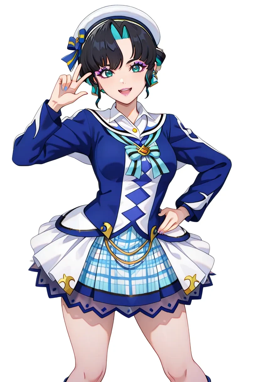 mirabokuchikacos, beret, blue jacket, long sleeves, bowtie, plaid skirt, blue boots, white sailor collar, wing collar, two-tone jacket, white waist cape, layered skirt, white headwear, hat ribbon