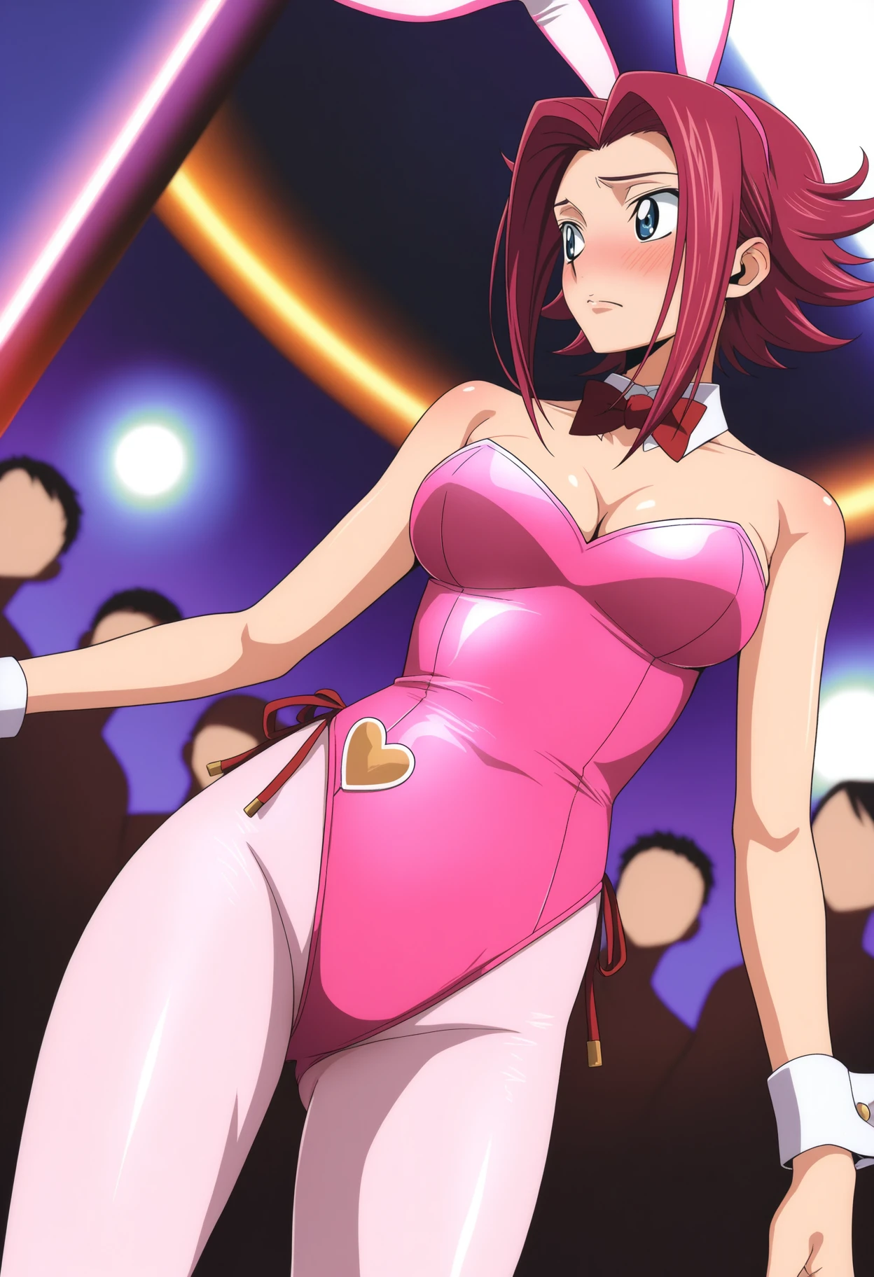 Bunny girl outfit prompts : rabbit ears, bowtie, pink leotard, pink pantyhose, playboy bunny, wrist cuffs