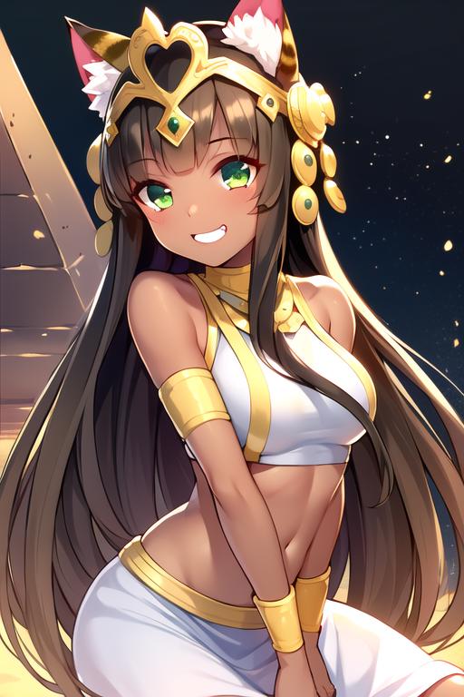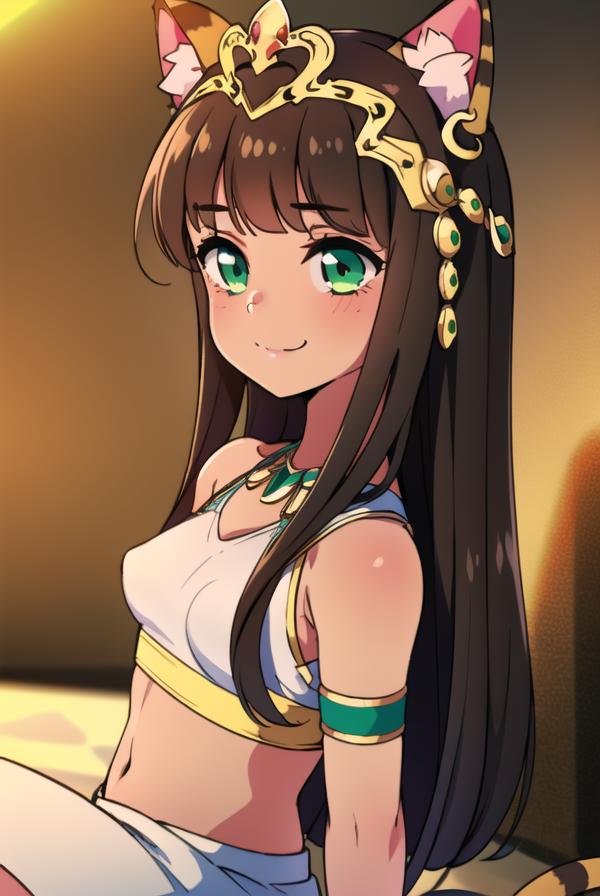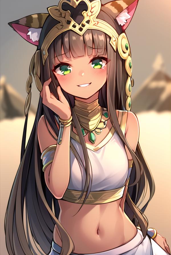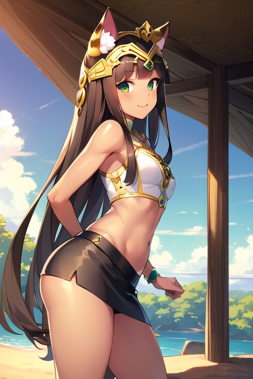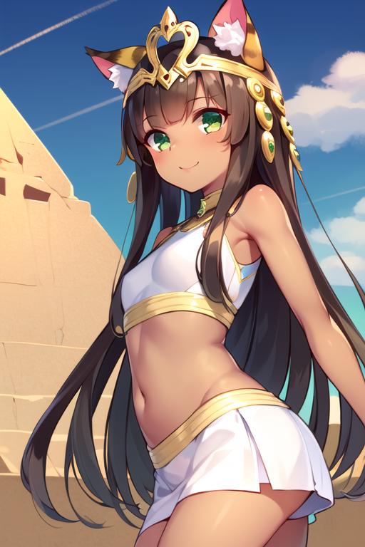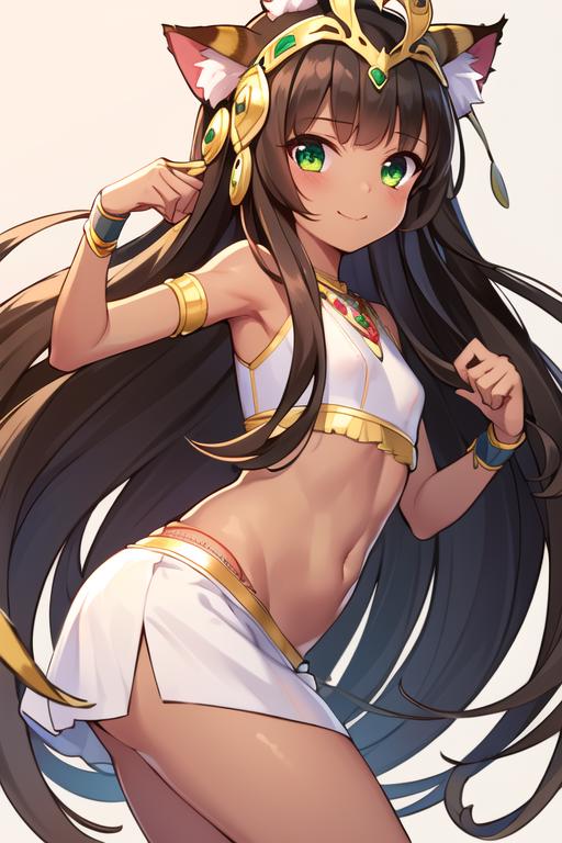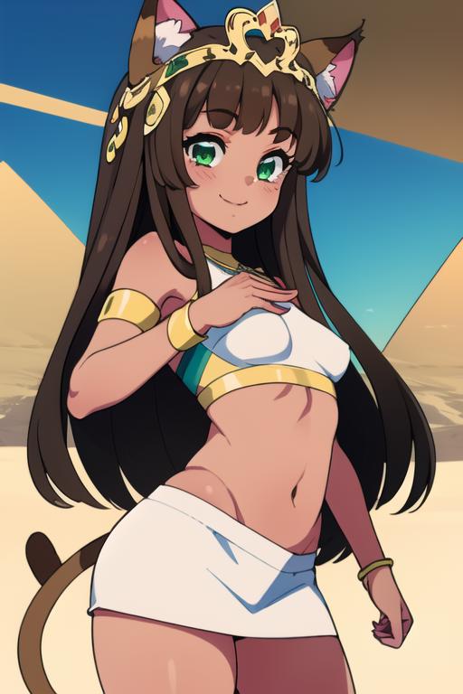 bastet_PD, 1girl, solo, white skirt, brown hair, green eyes, tiara, ankle lace-up, cat ears, dark skin, jewelry, midriff, very long hair, cat tail,