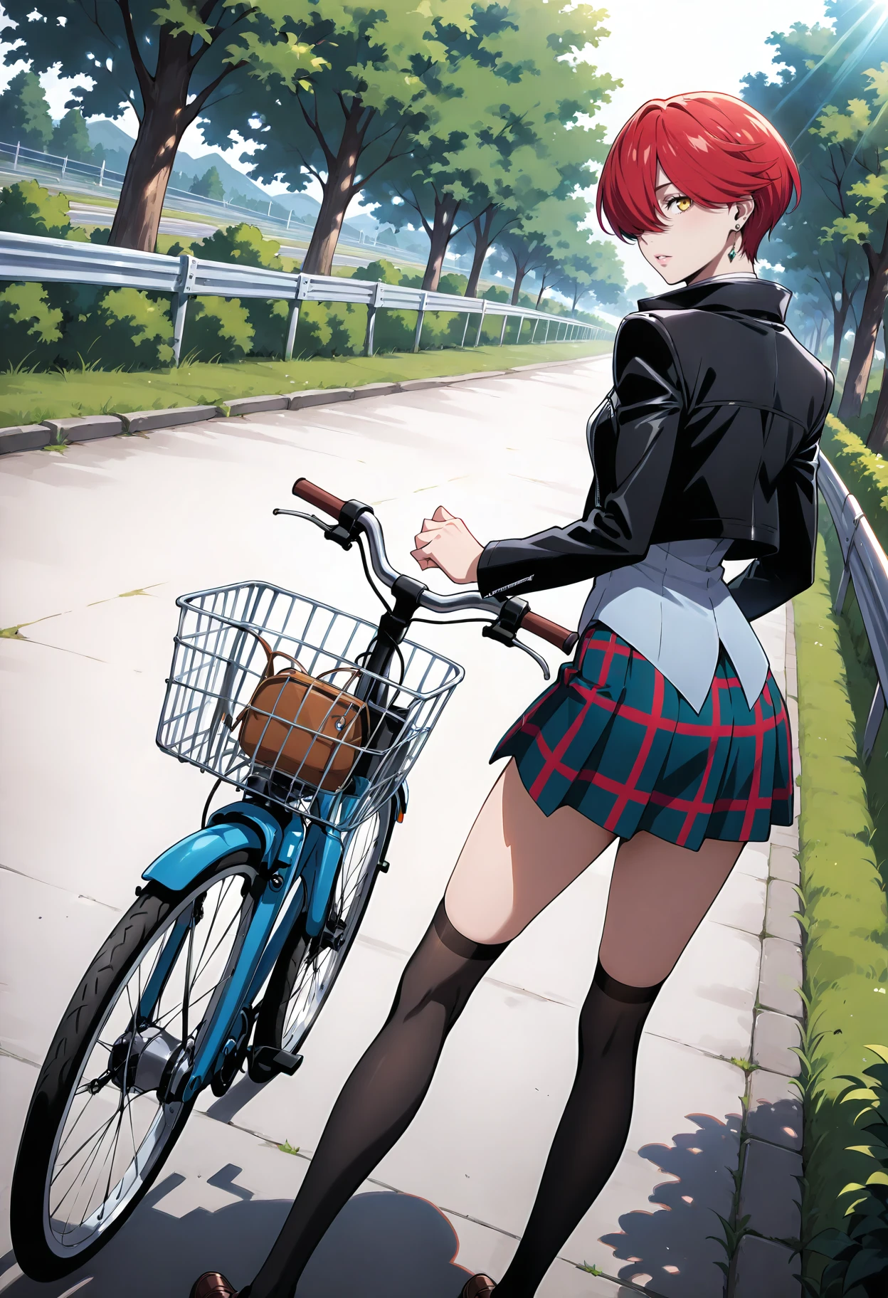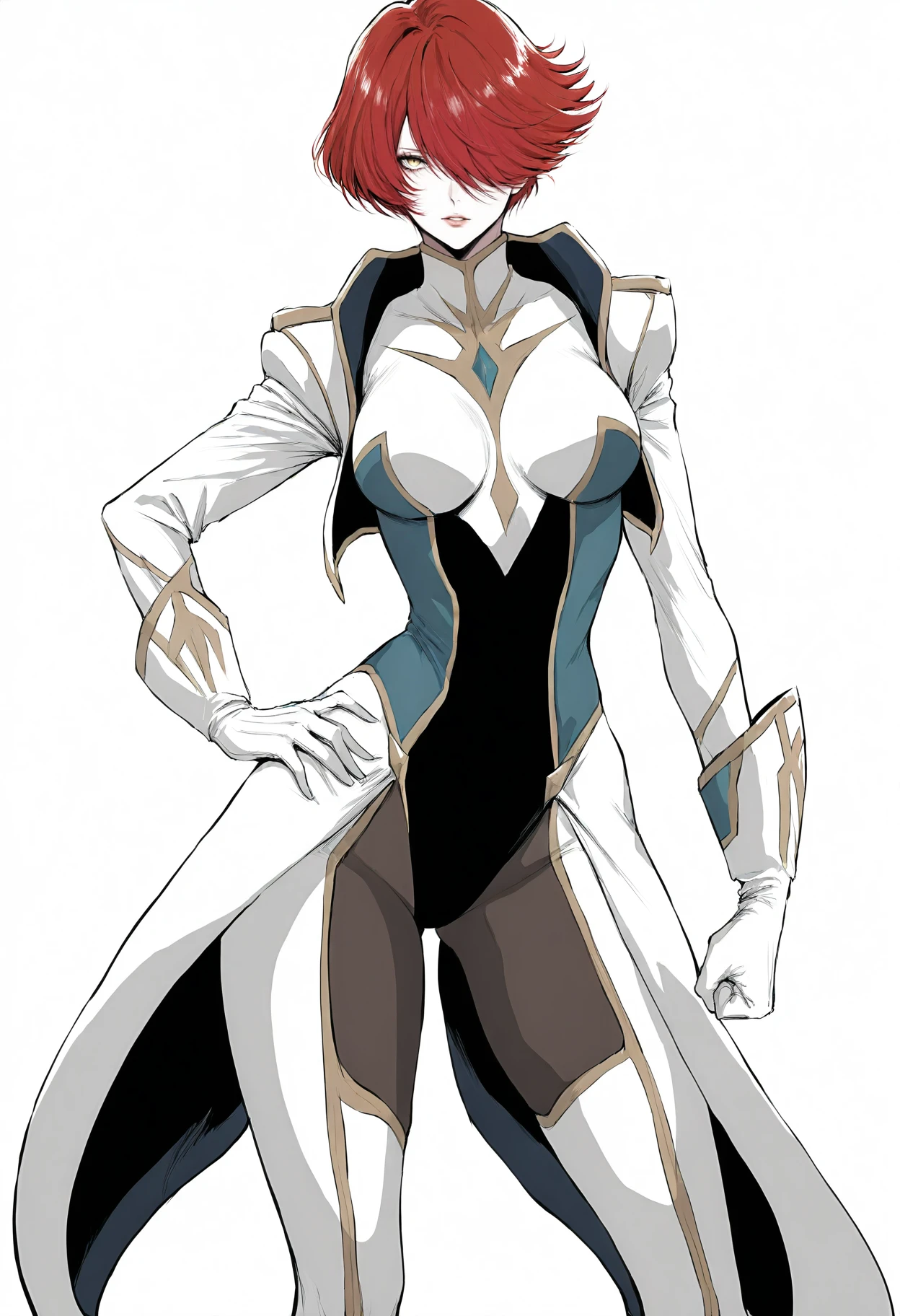 hair over one eye,makeup,high collar,gloves,high heels,breasts,thighhighs,pantyhose,boots,,white gloves,medium breasts,long sleeves,leotard,uniform,thigh boots