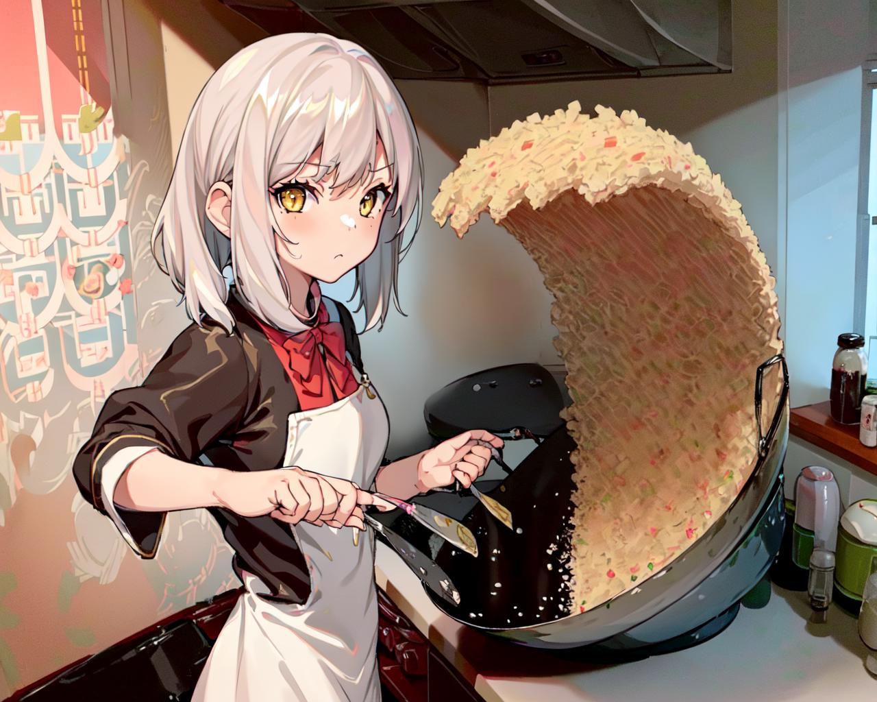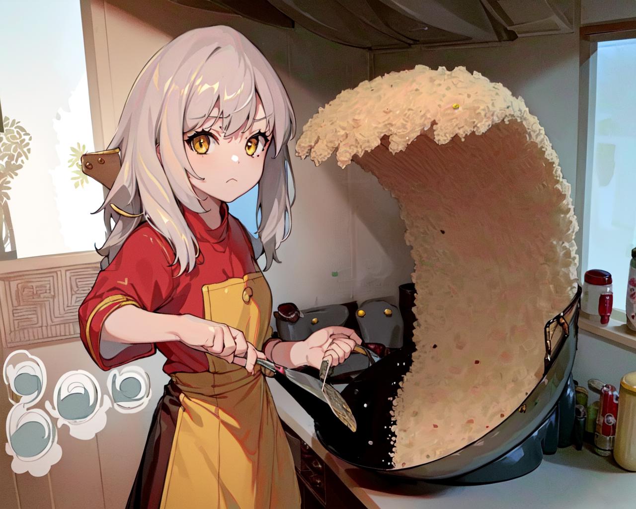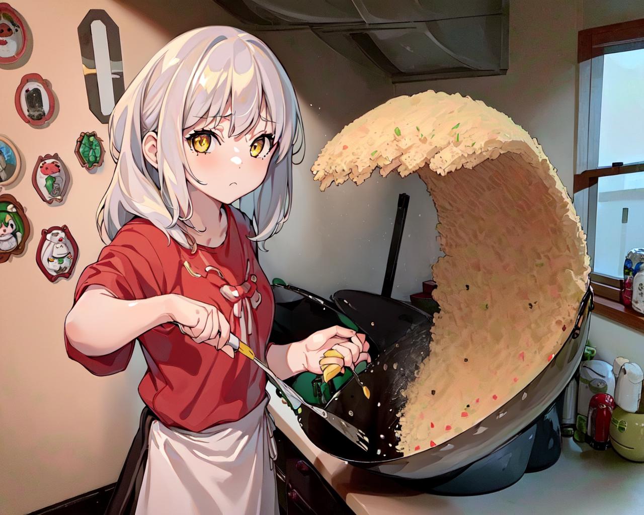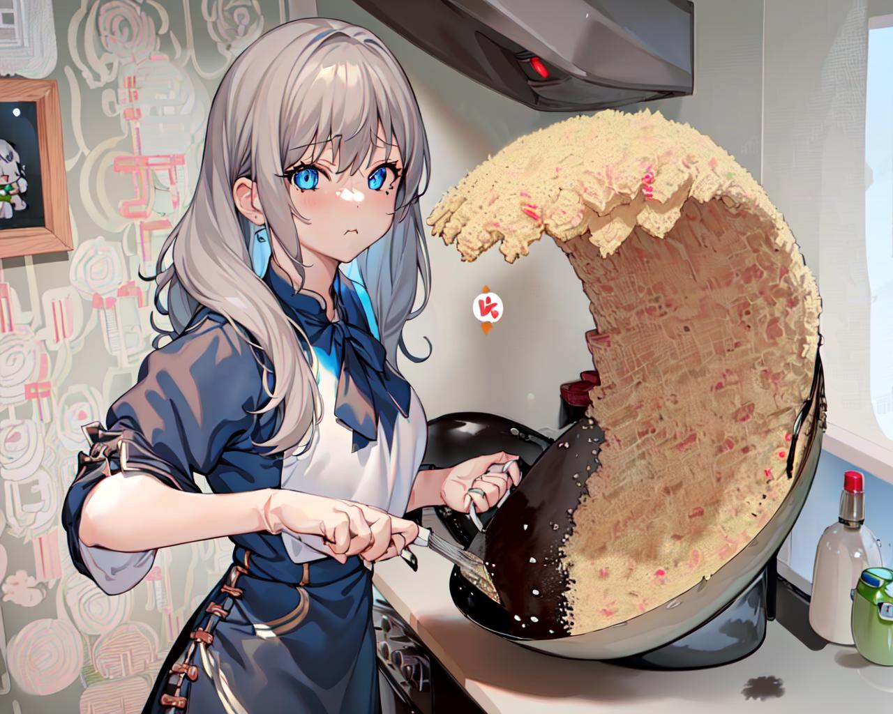 prompt: i used (1girl, solo,cooking, standing , looking at viewer, closed mouth, upper body), (kitchen, holding wok, Spatula)